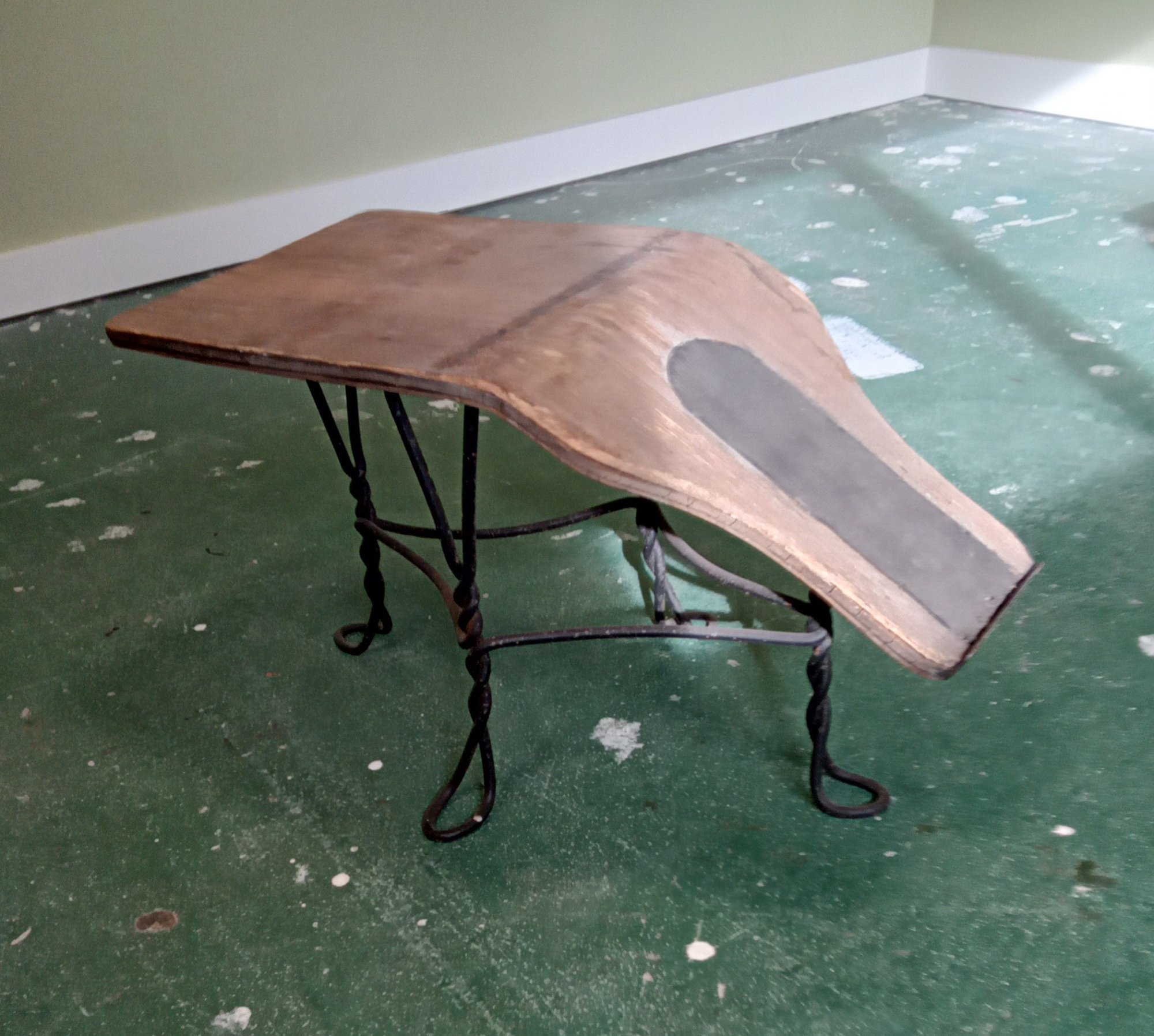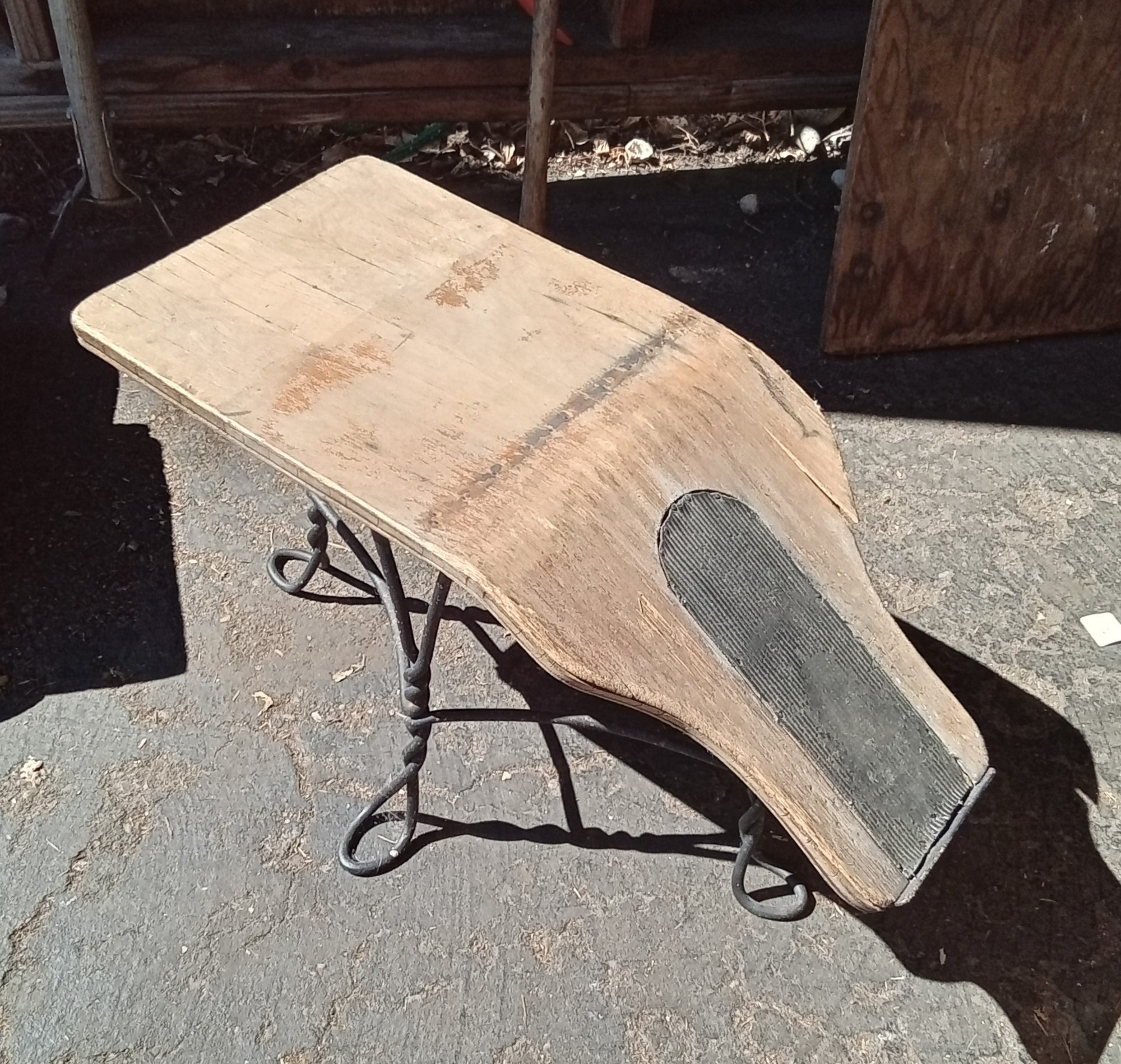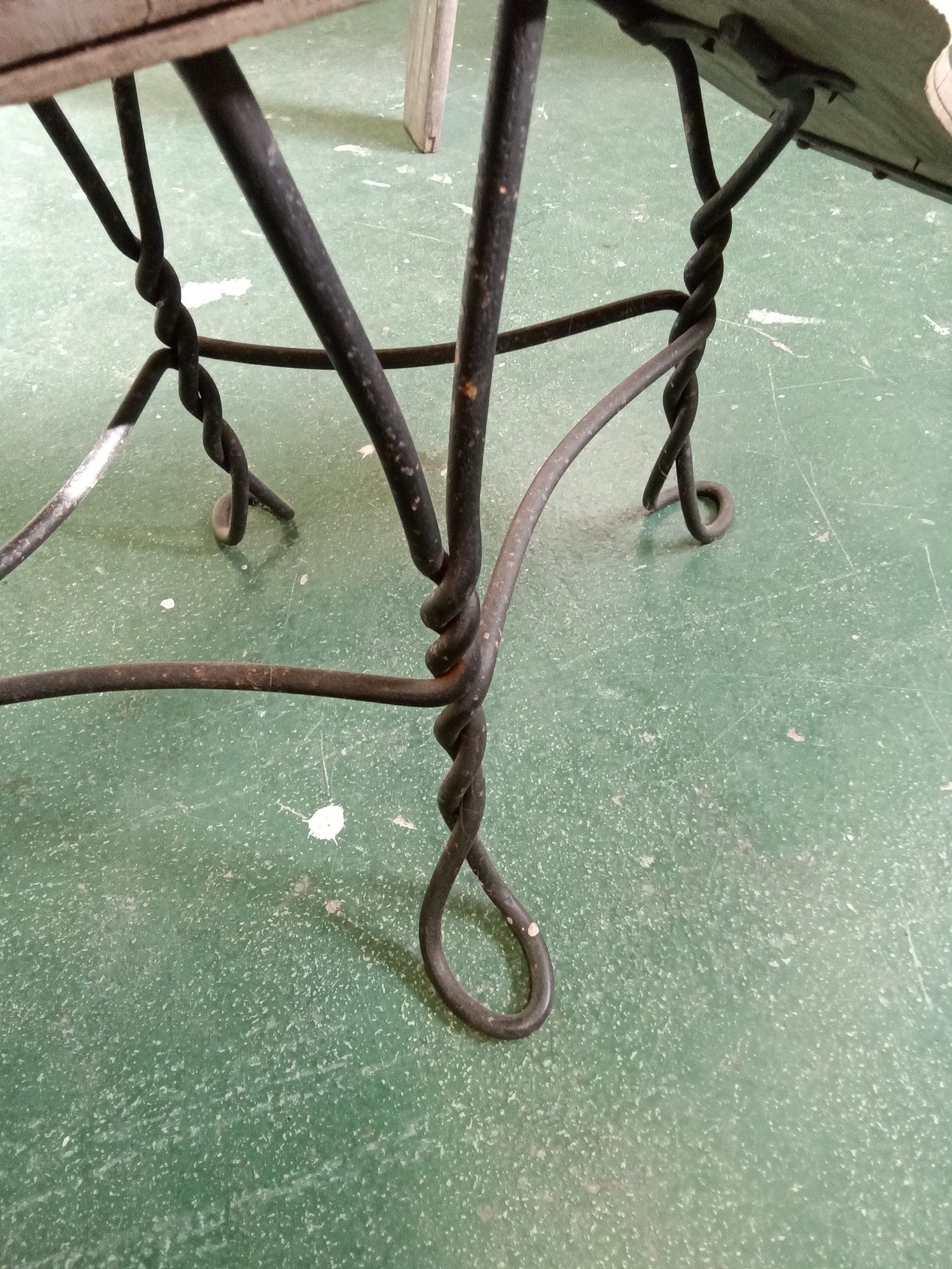 Wrought Iron base on this antique shoe store foot rest. Wood part is firm but needs work or replaced.