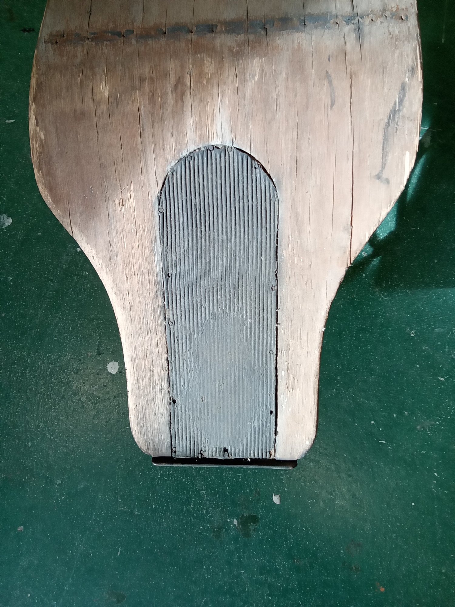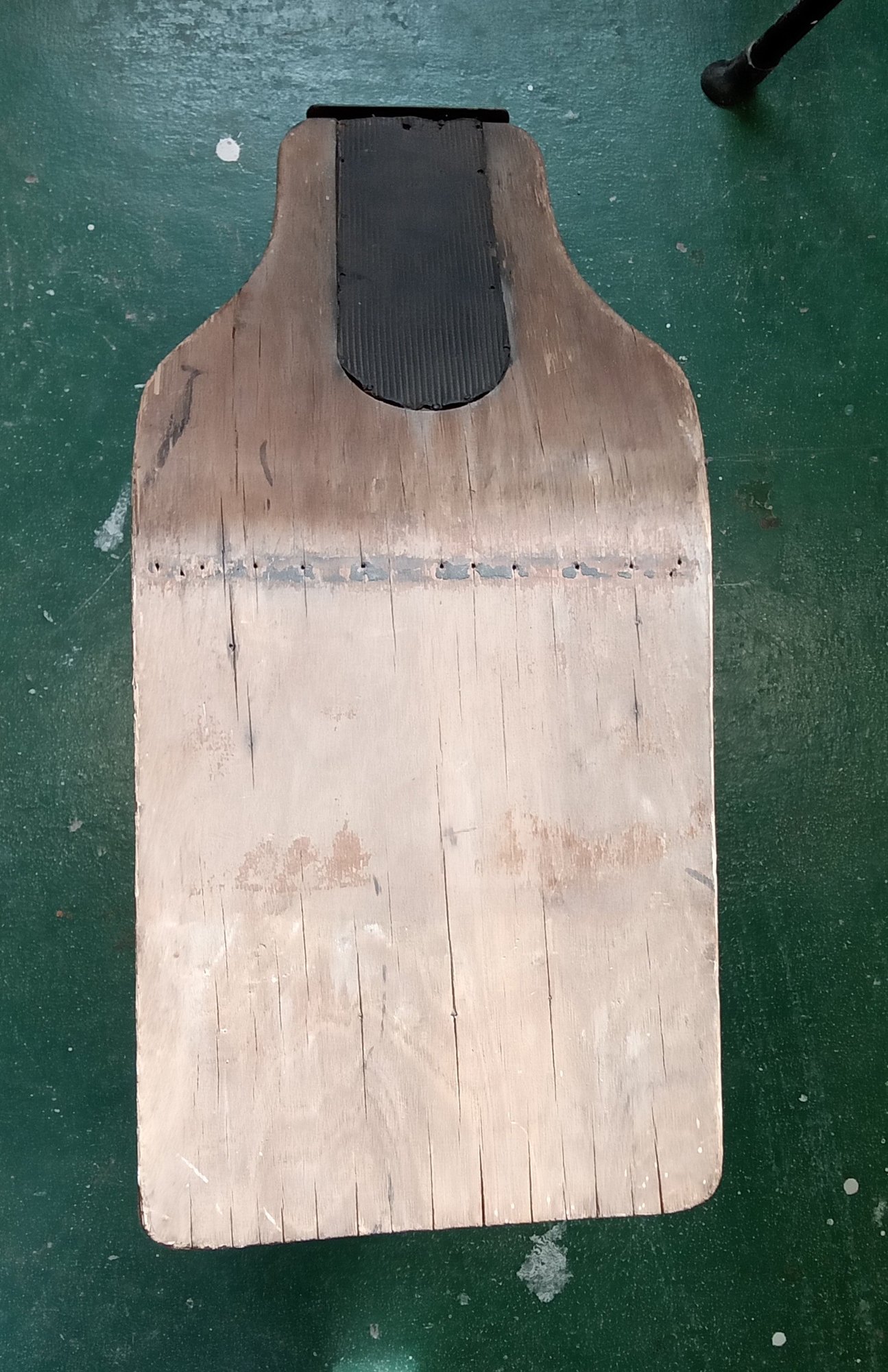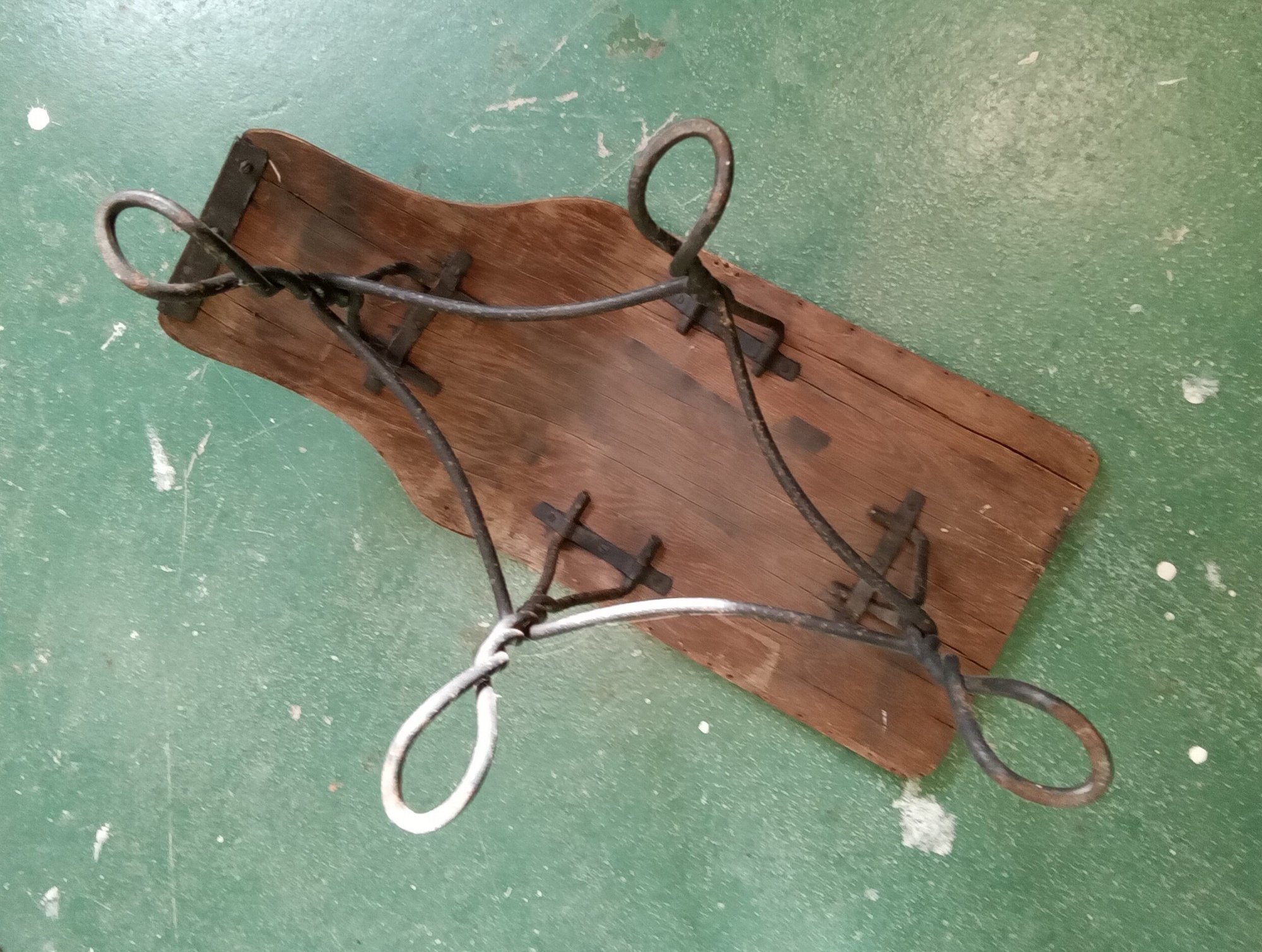 Wrought Iron base on this antique shoe store foot rest. Wood part is firm but needs work or replaced.