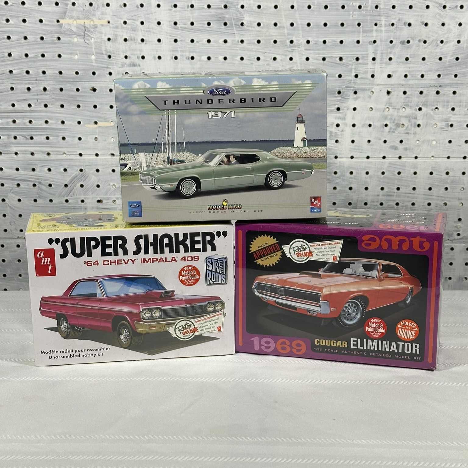 Set of 3 sealed, new in box, AMT 1:25 scale model car kits including: