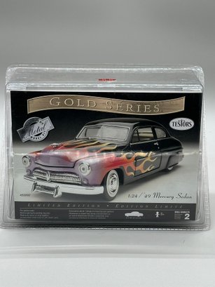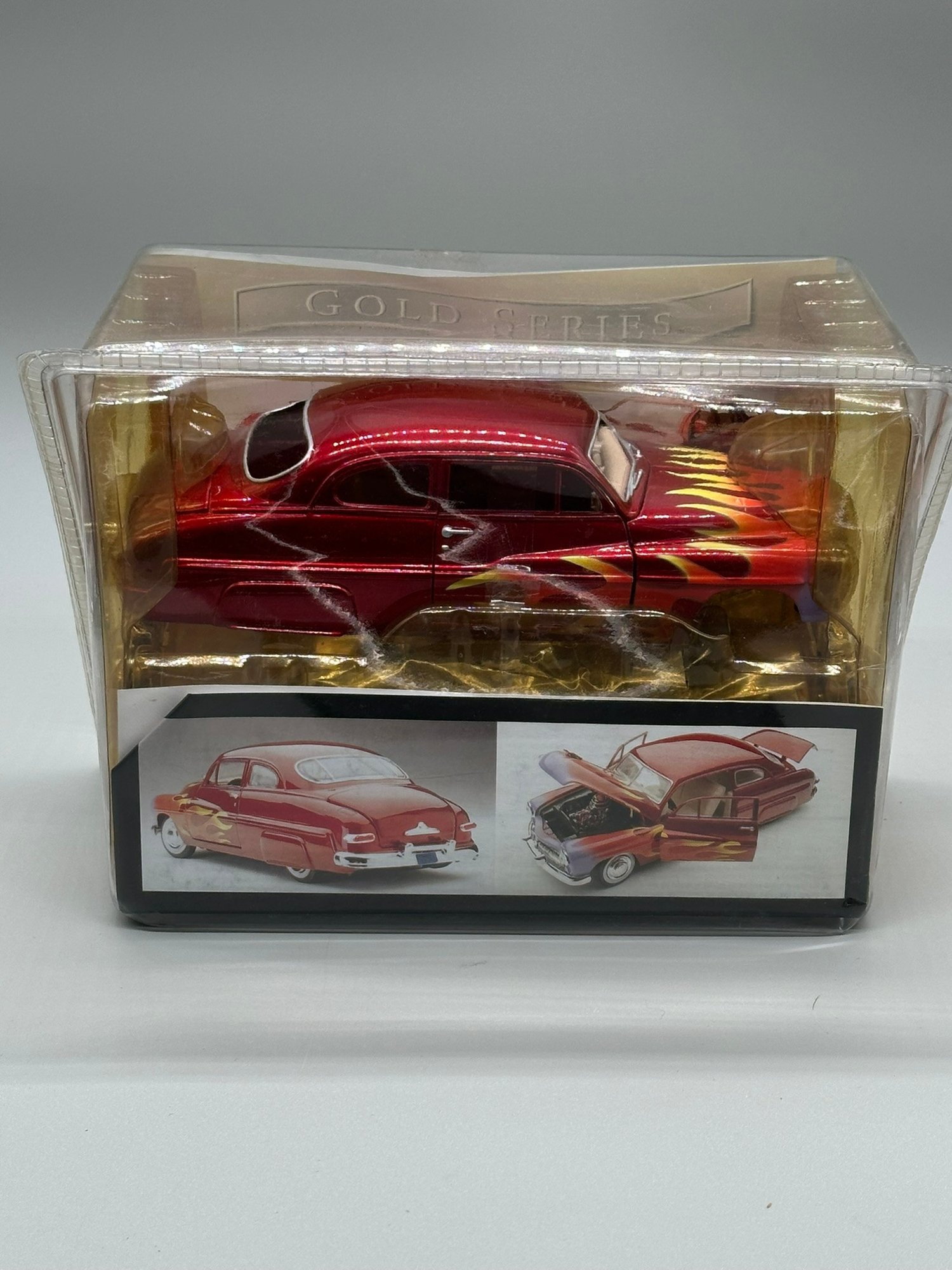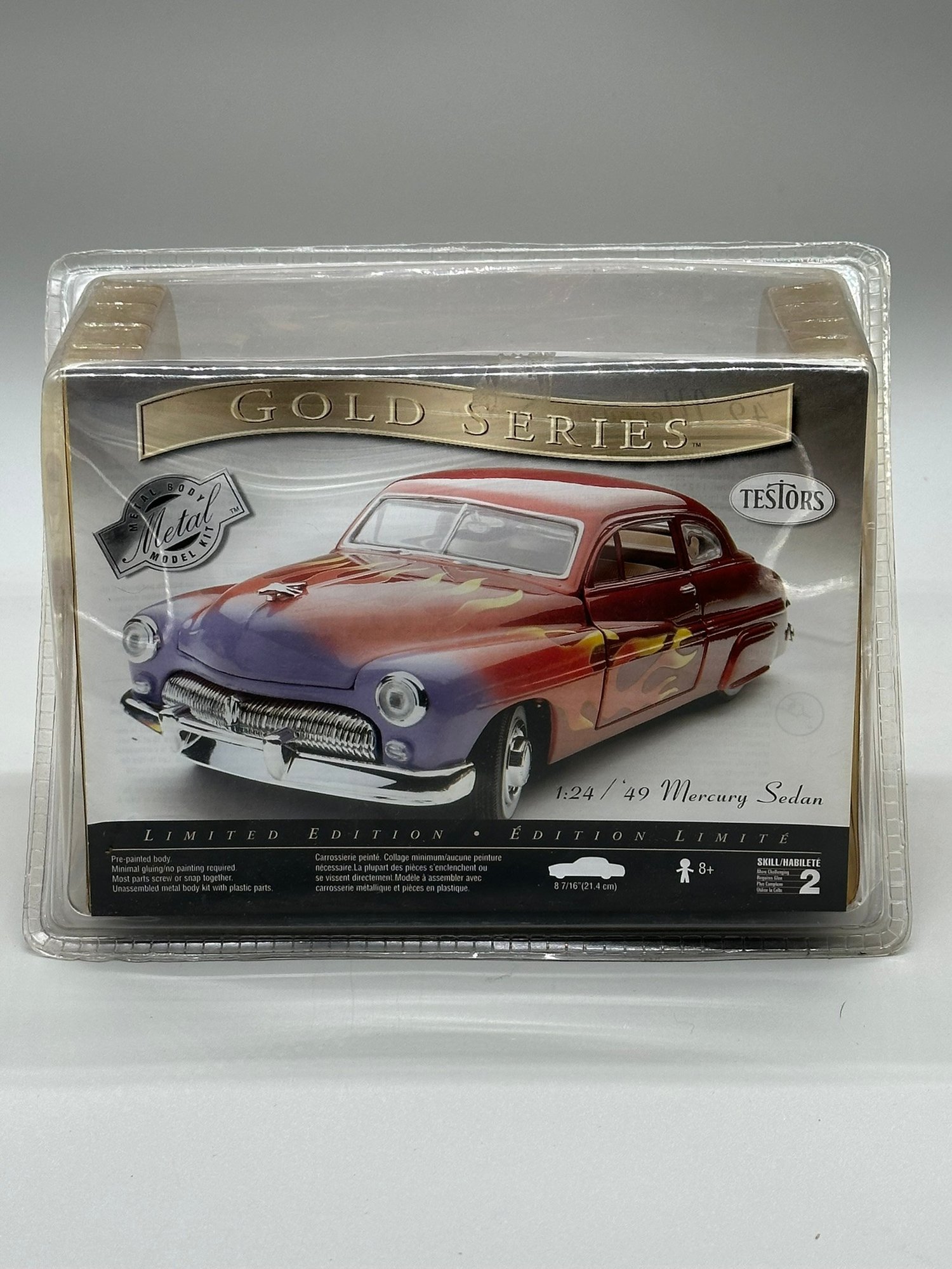 Pair of new in box Testors Gold Series Limited Edition 1:24 scale mode car kits of the '49 Mercury Sedan; one black with flames, one red with flames