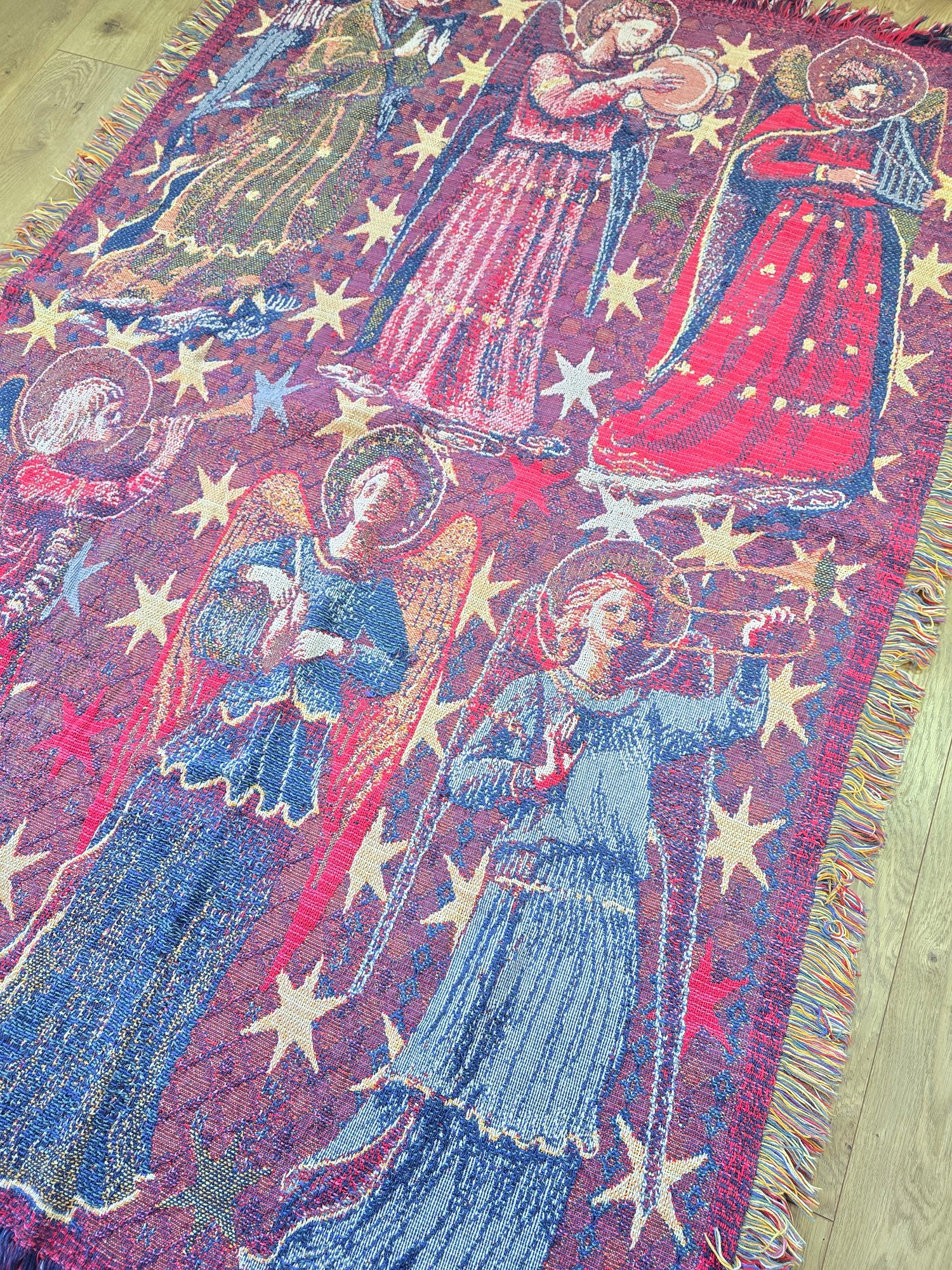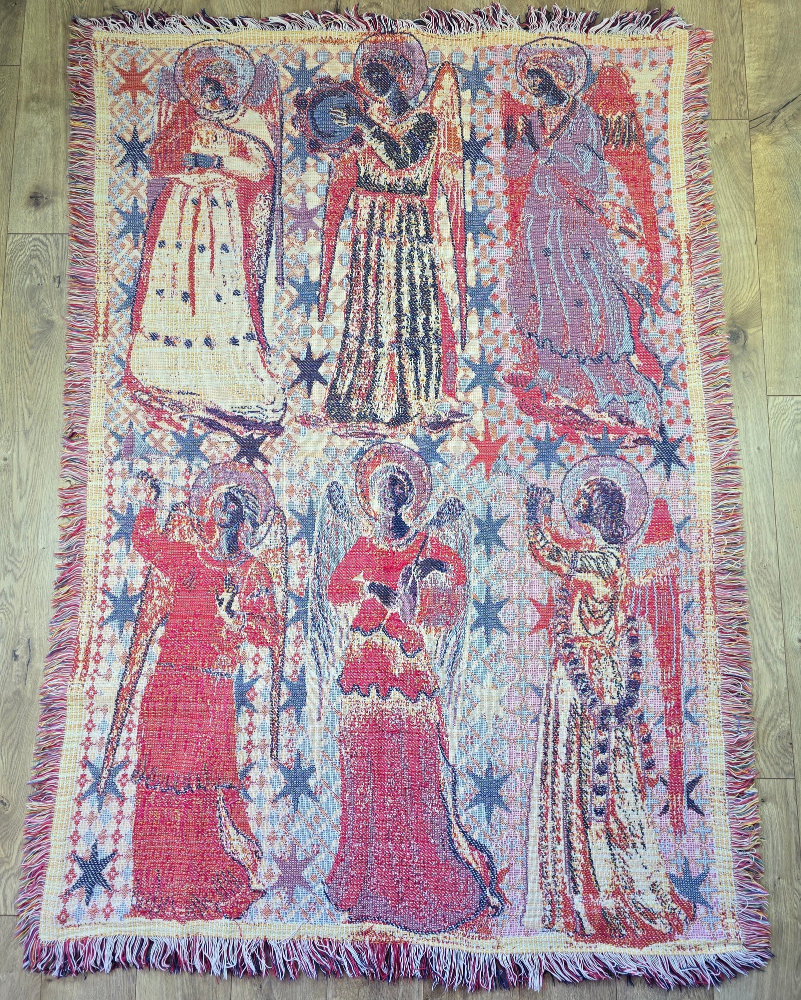 Angels Church Gospel tapestry throw blanket, made of woven cotton with fringed edges.