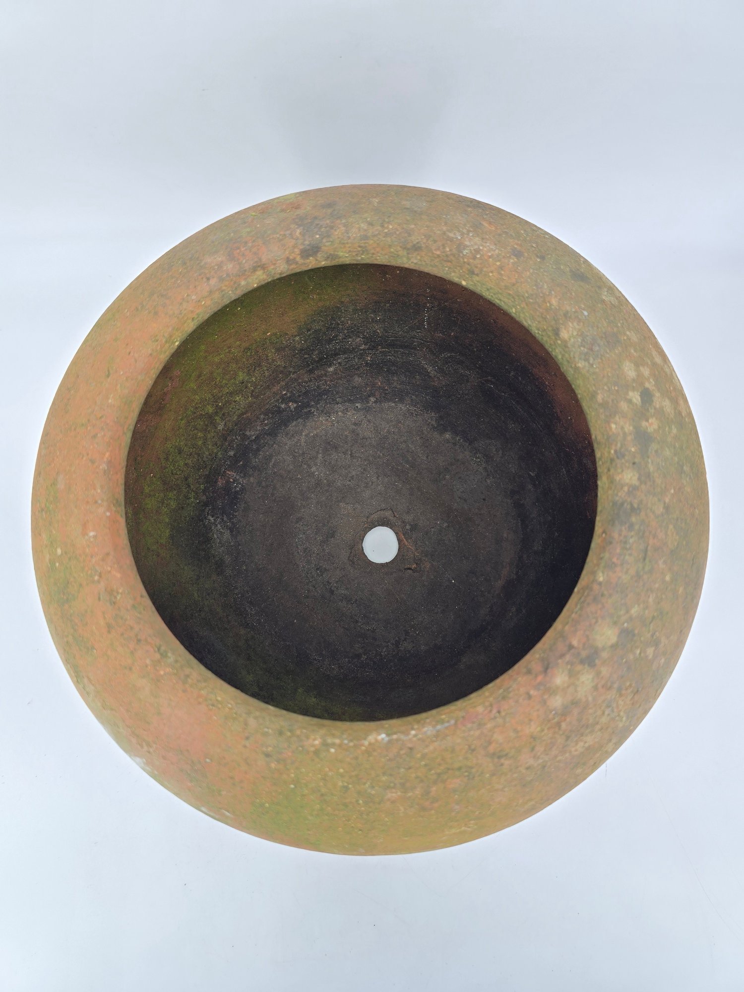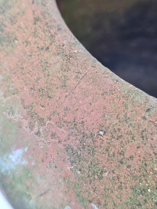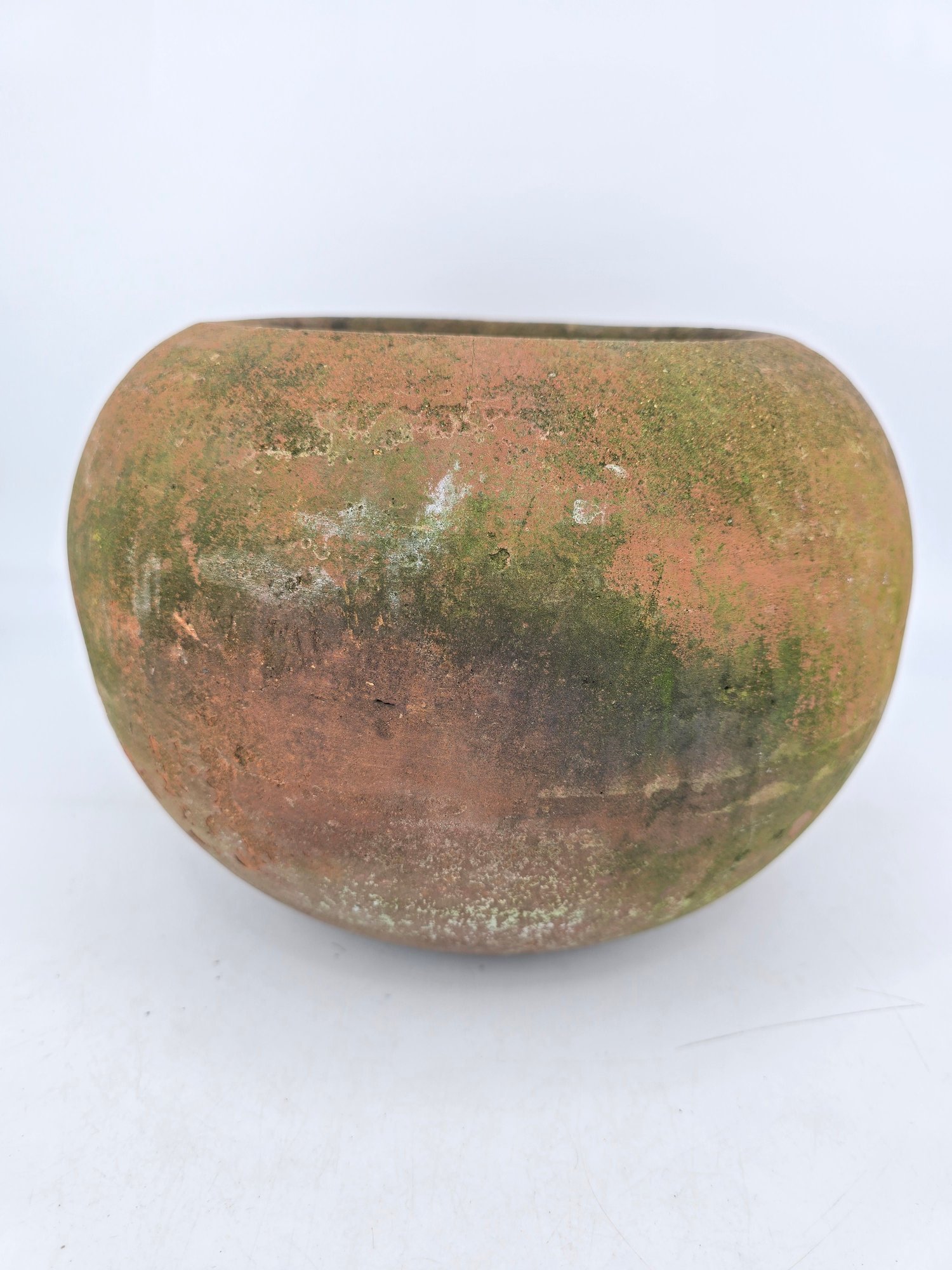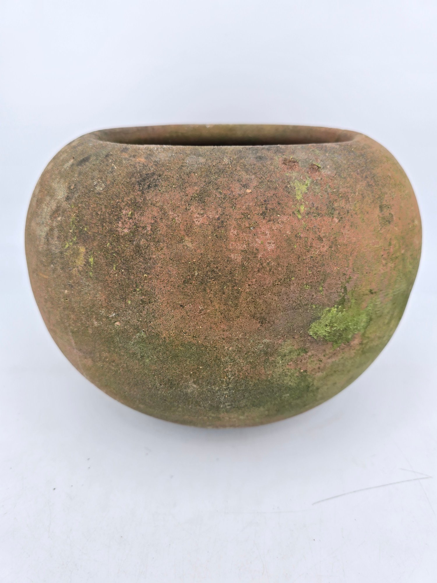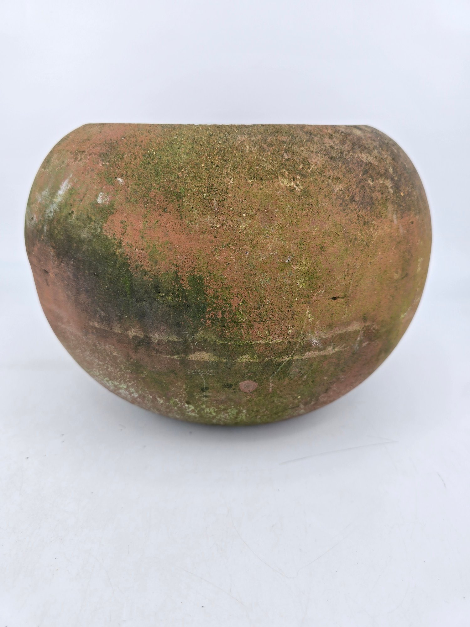 The material is terracotta with a worn, aged patina and moss growth, consistent with age and outdoor use. See Photos. This item is not shippable.