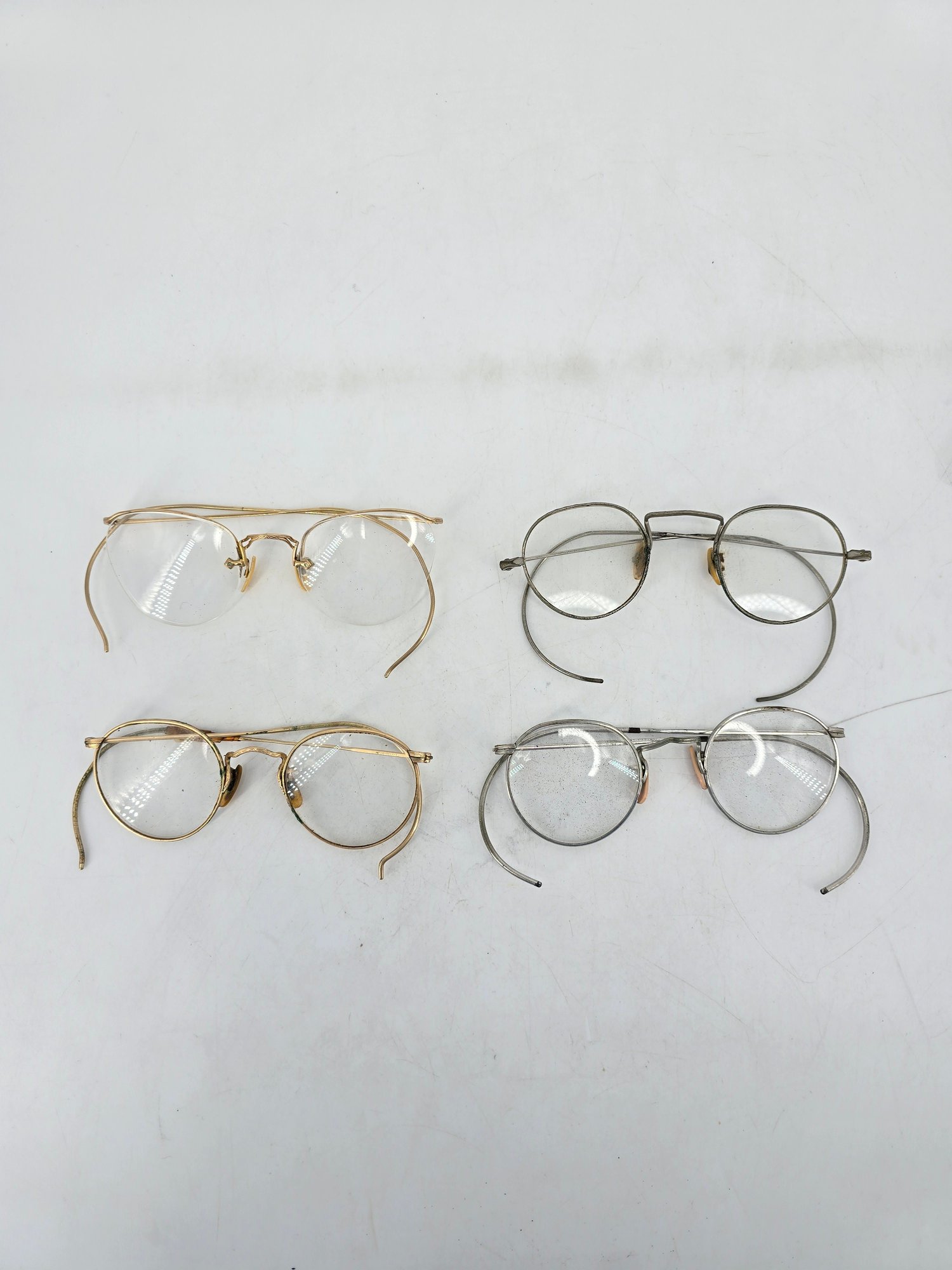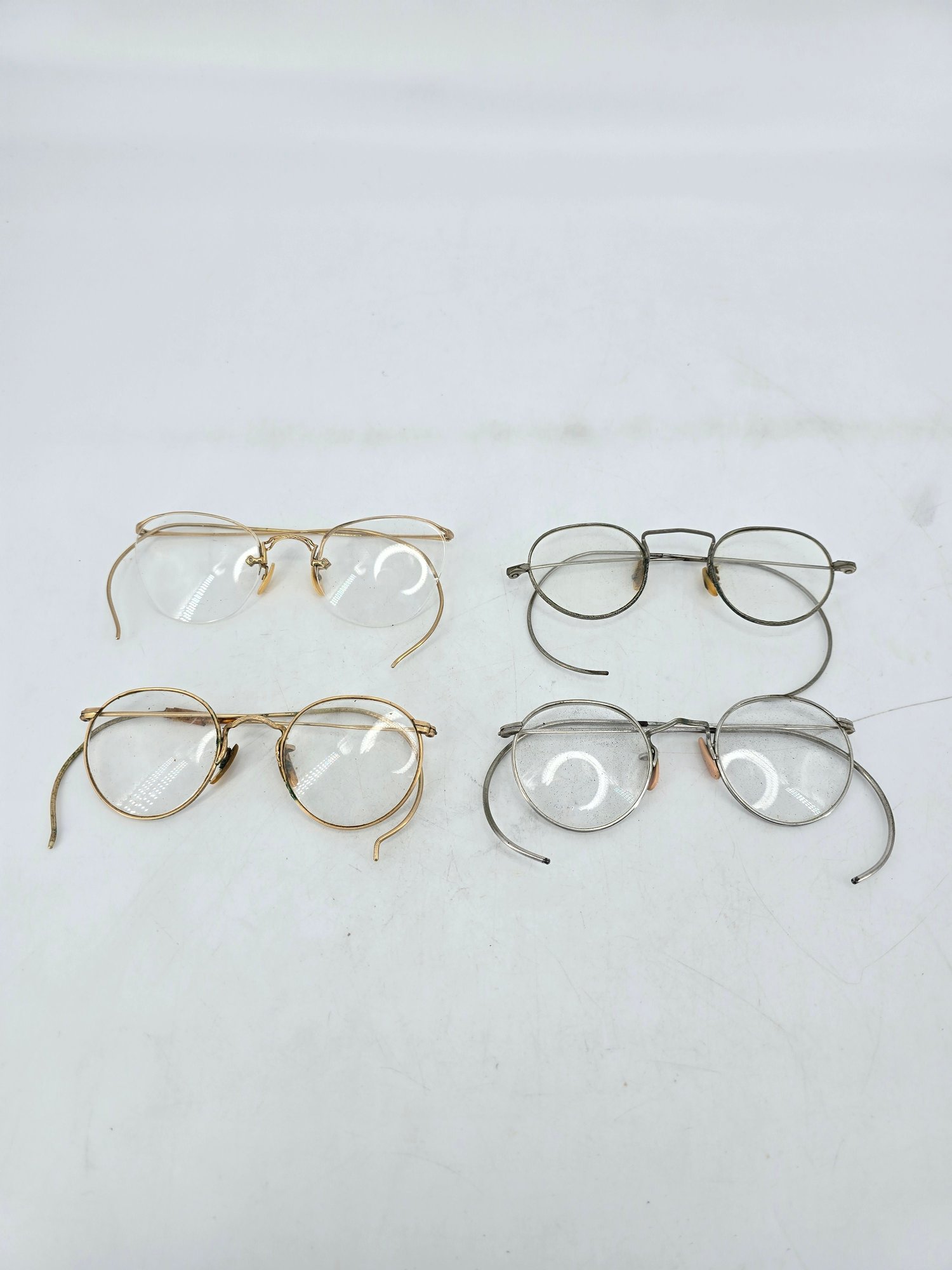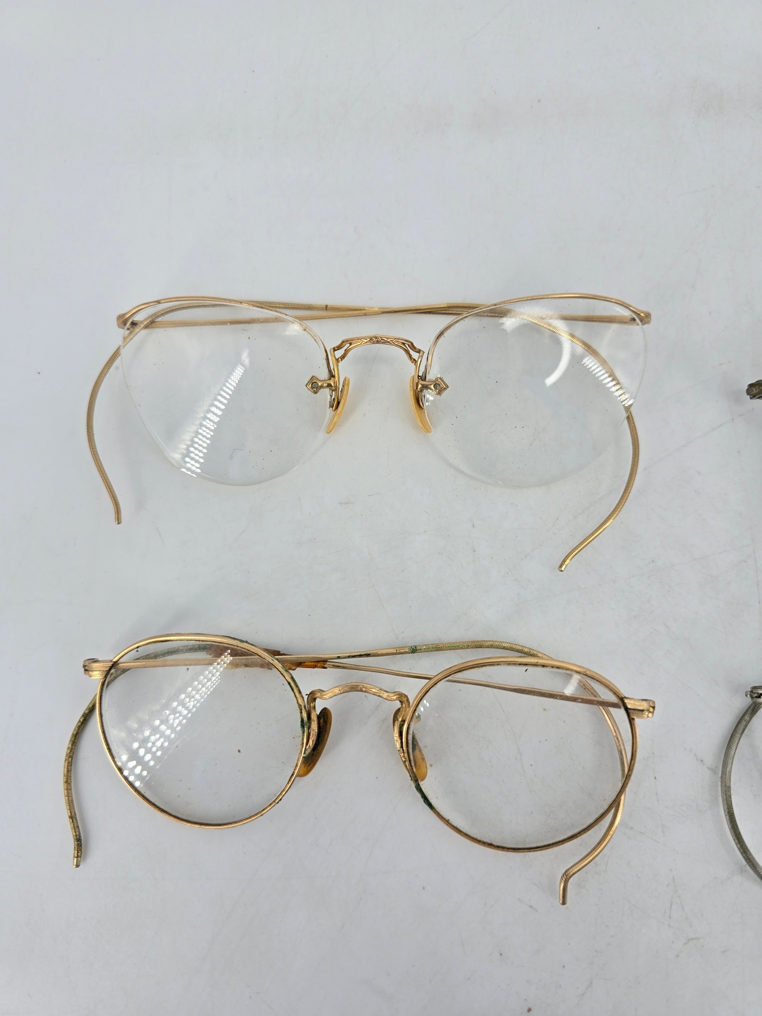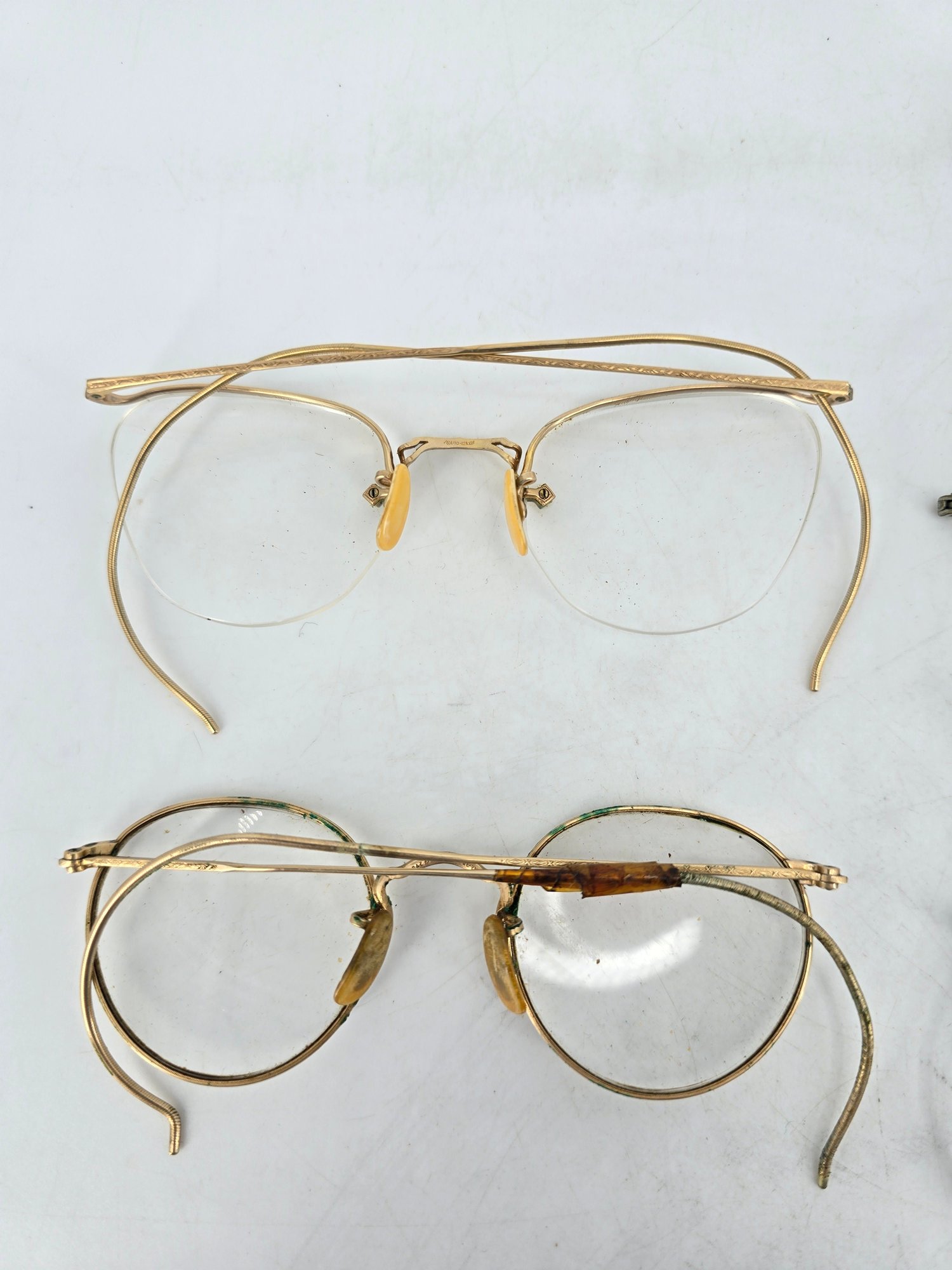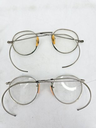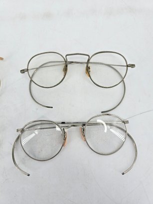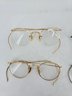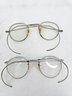 Antique, round wire frame eyeglasses / glasses - two pairs made from gold-filled metal, popular during the 1920s to 1940s.