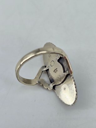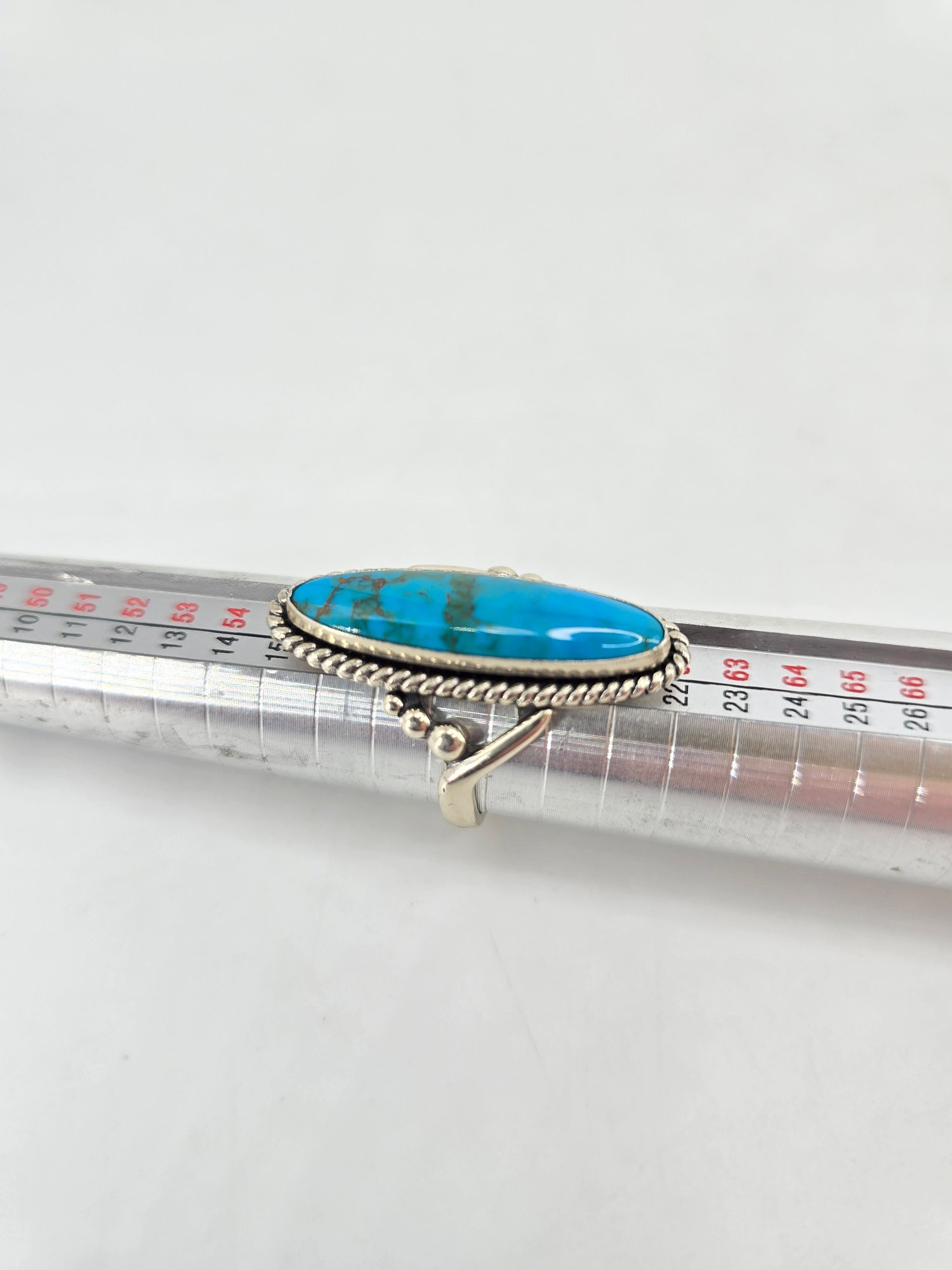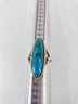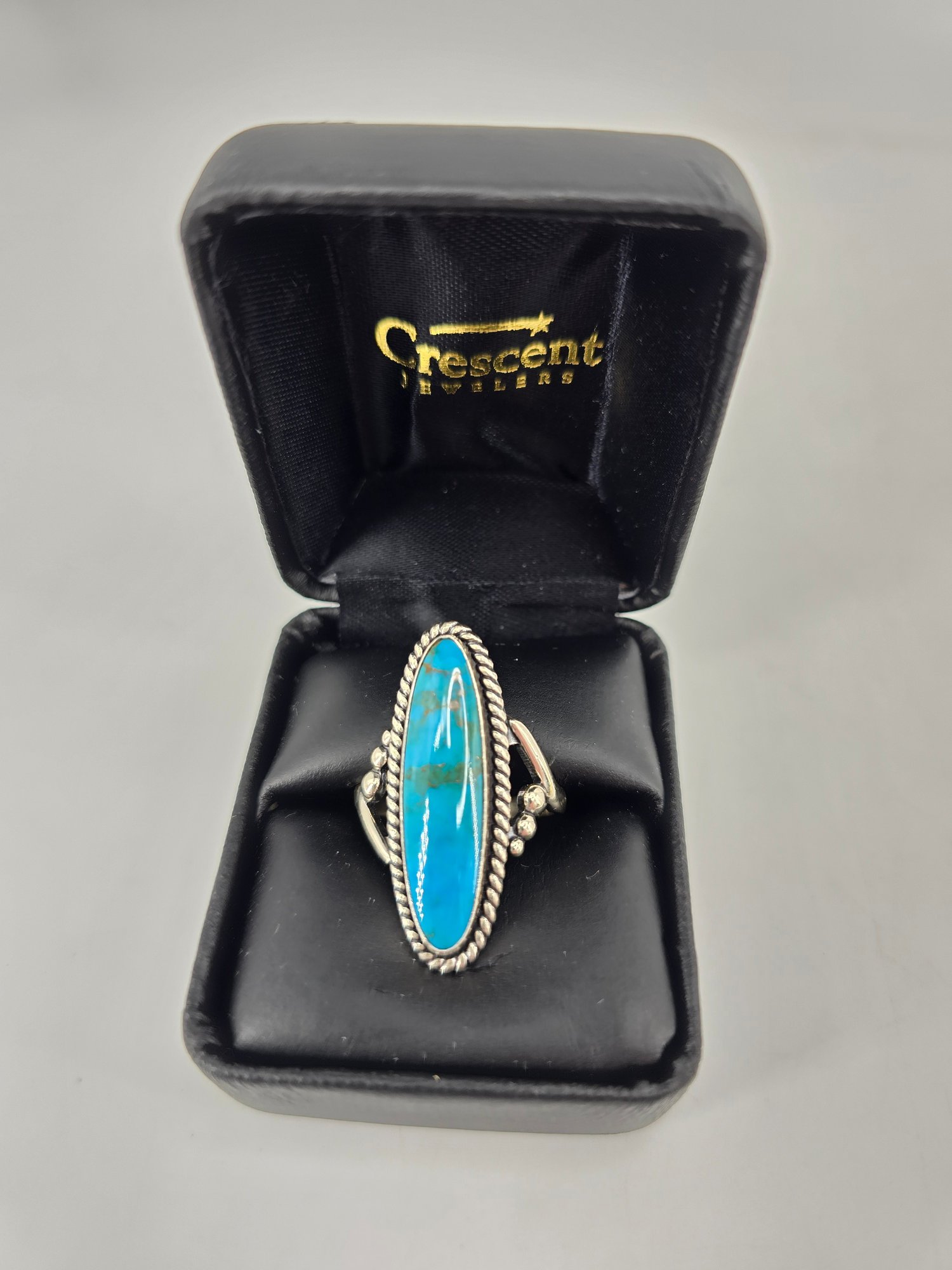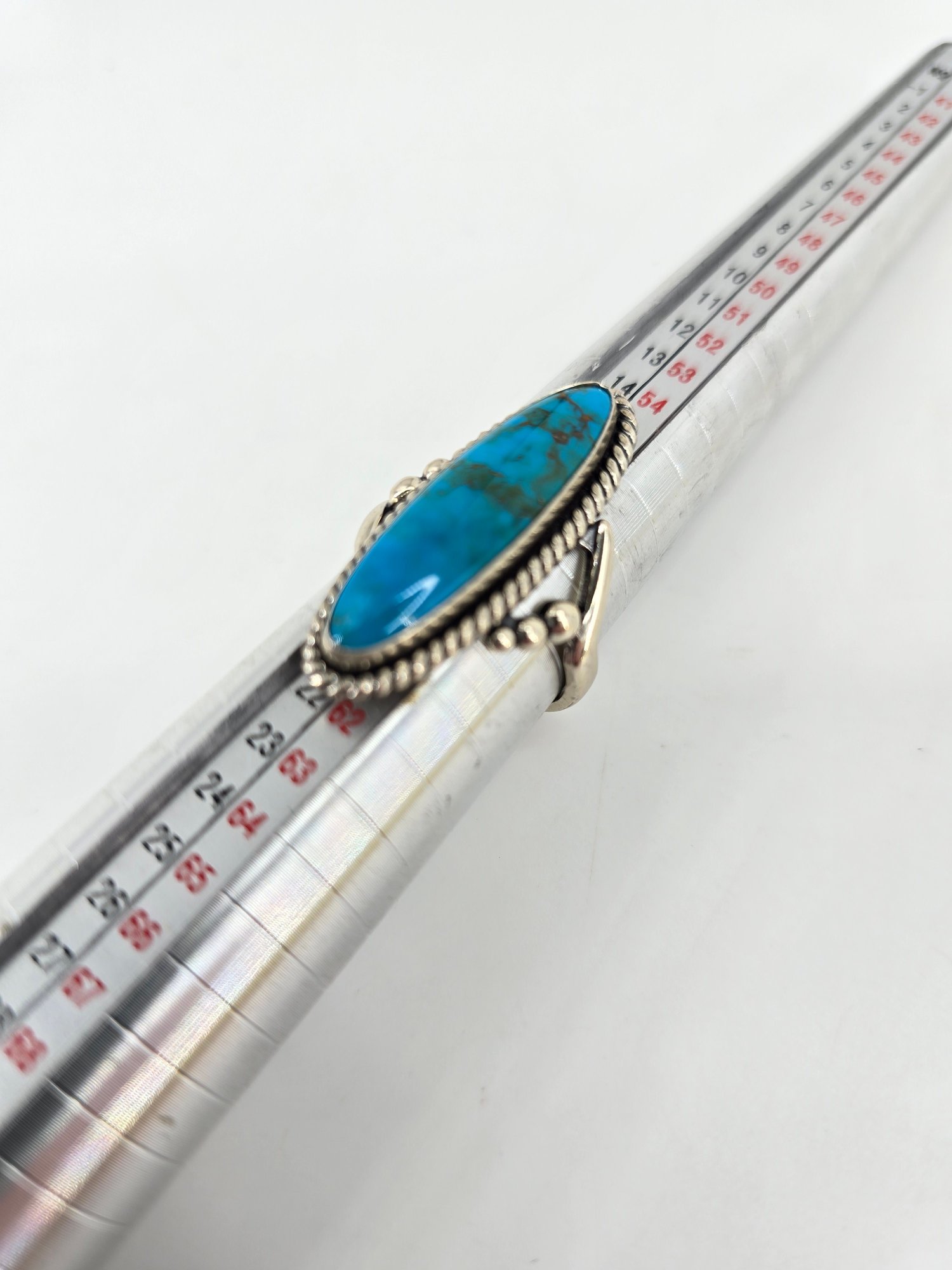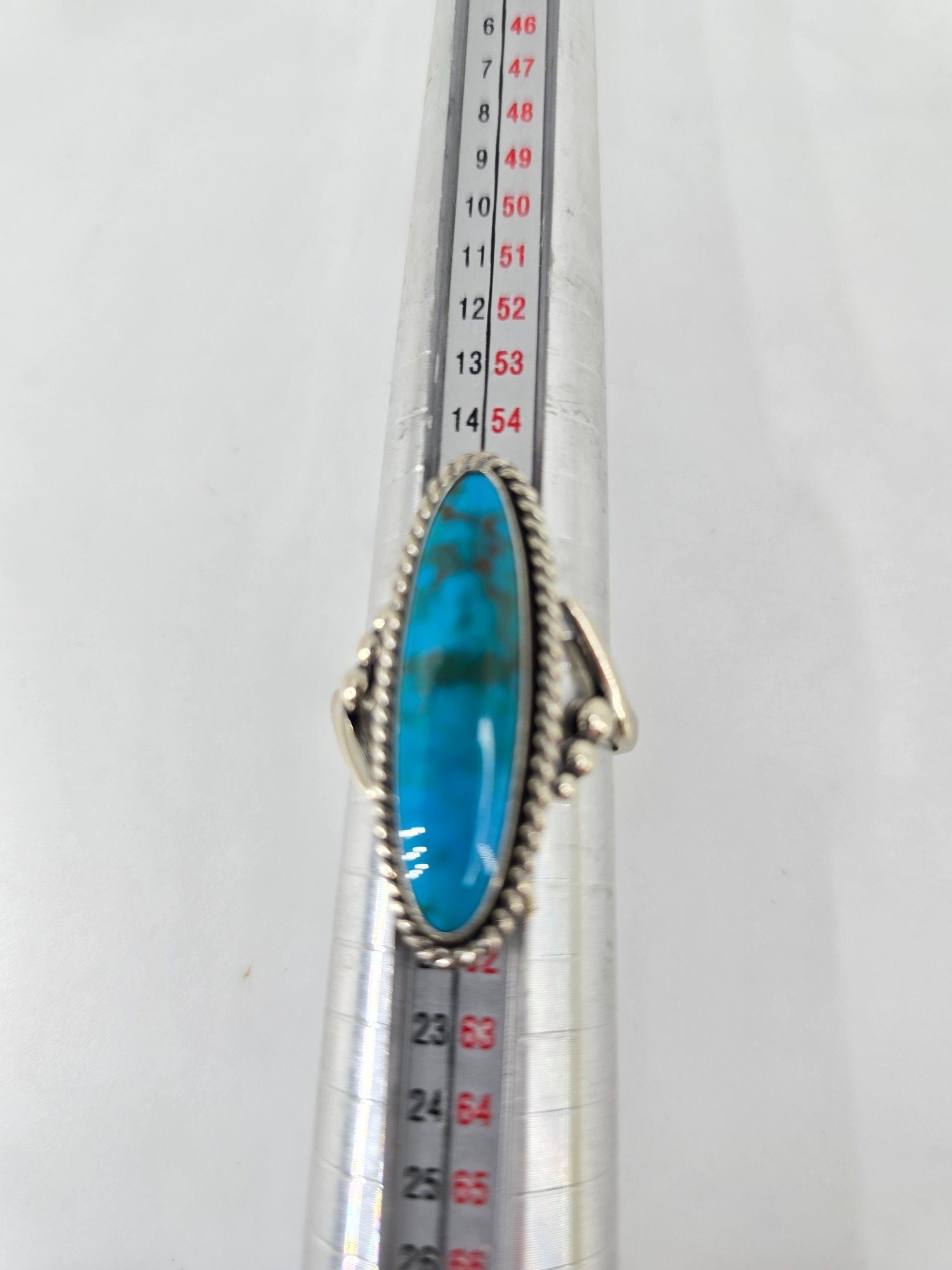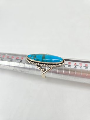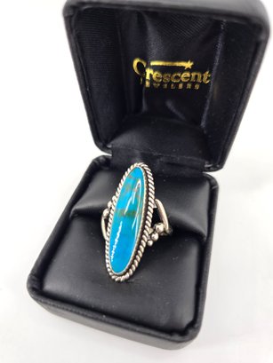 Native American-style Navajo turquoise ring featuring an elongated sterling .925 silver setting. The ring contains a long cabochon of turquoise. The stone is set in sterling .925 silver, commonly featuring a rope-twist border and split shank band. This style is characteristic of Southwestern or Native American jewelry traditions. Size 8.5, weighs 8.97g, stamped and tested.
