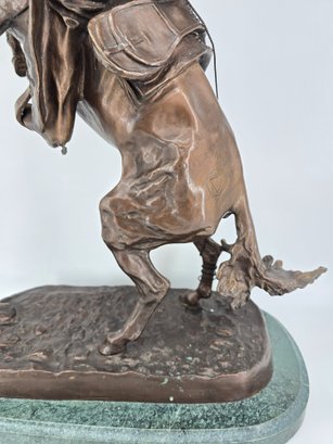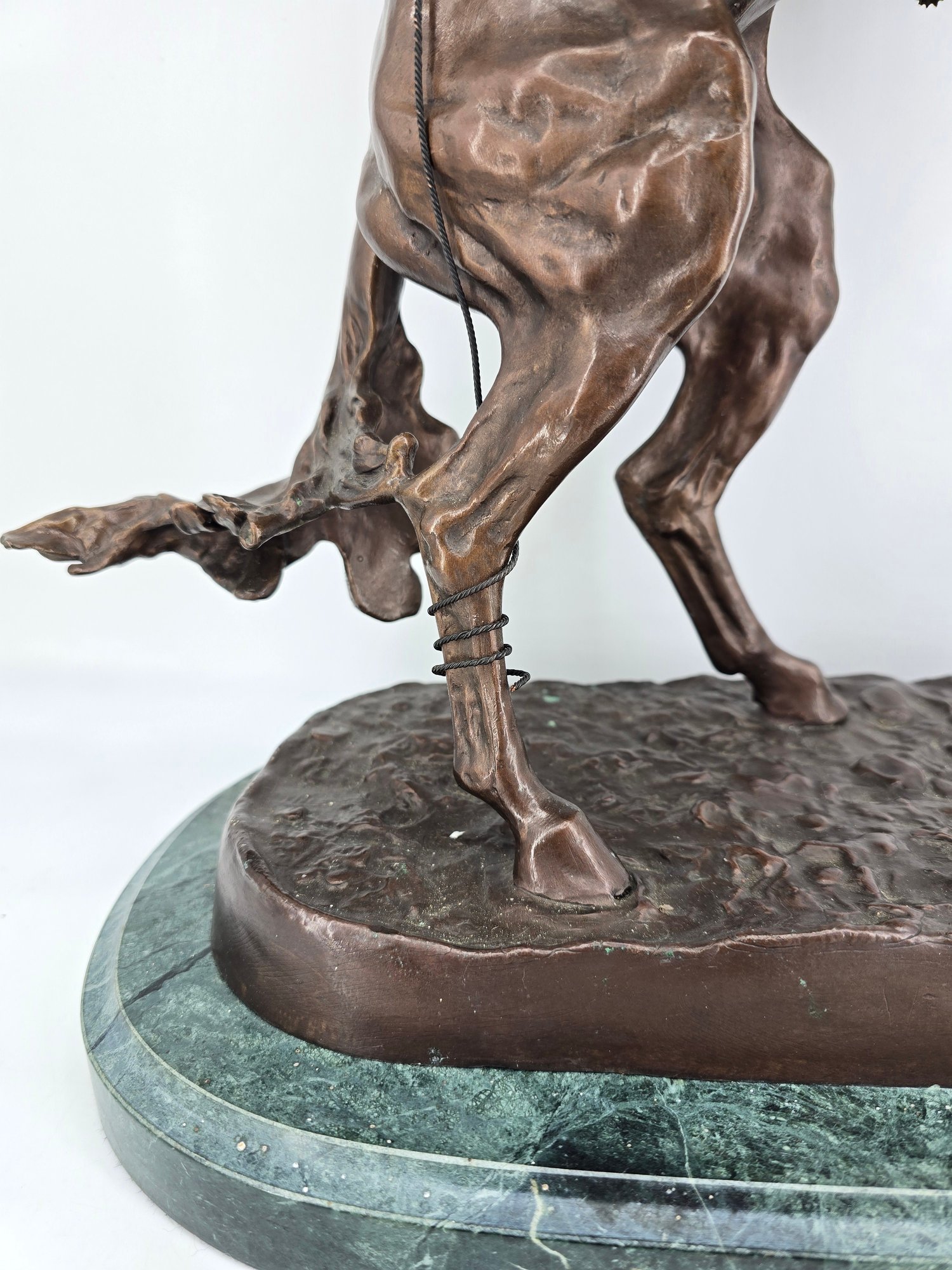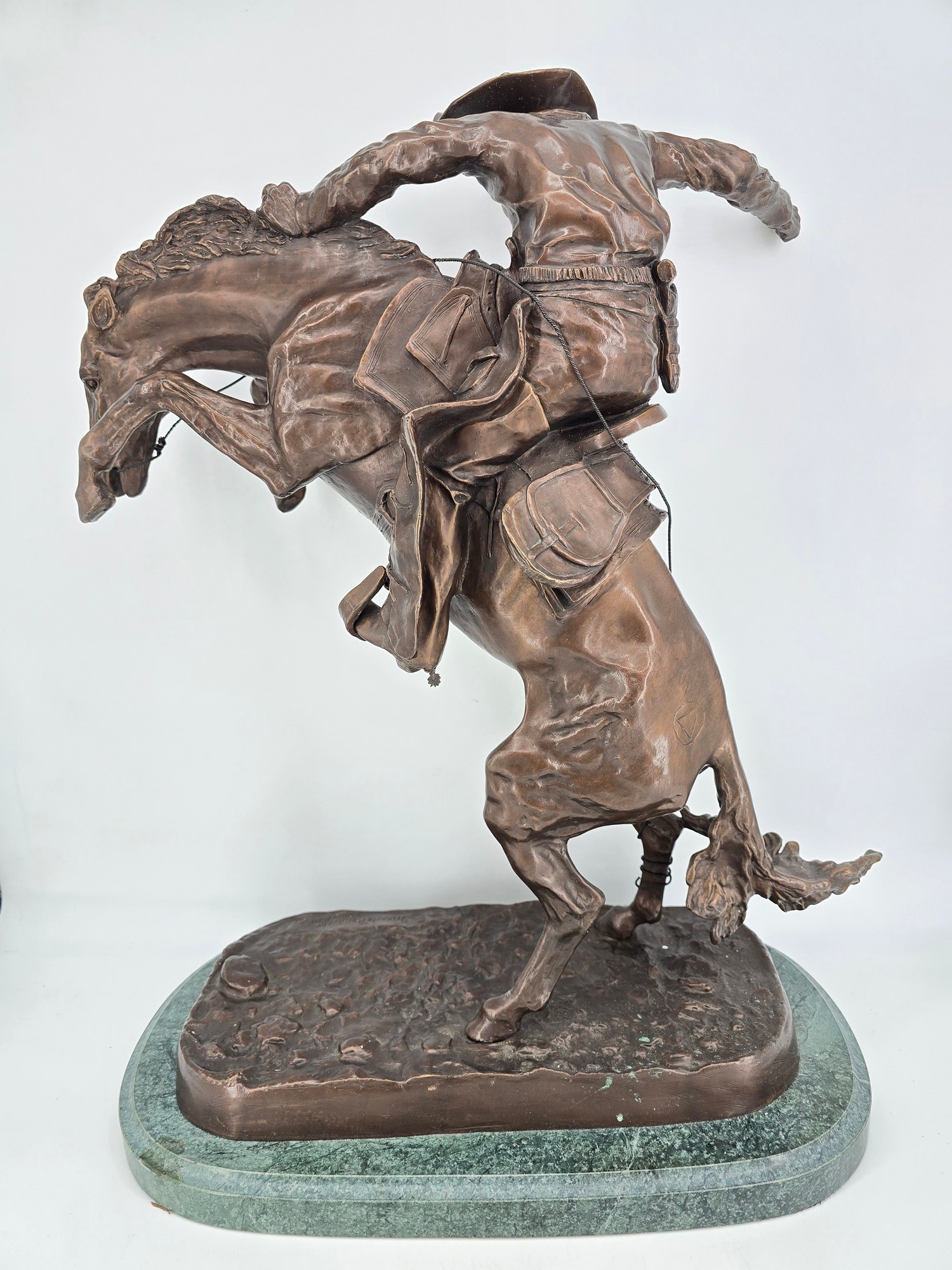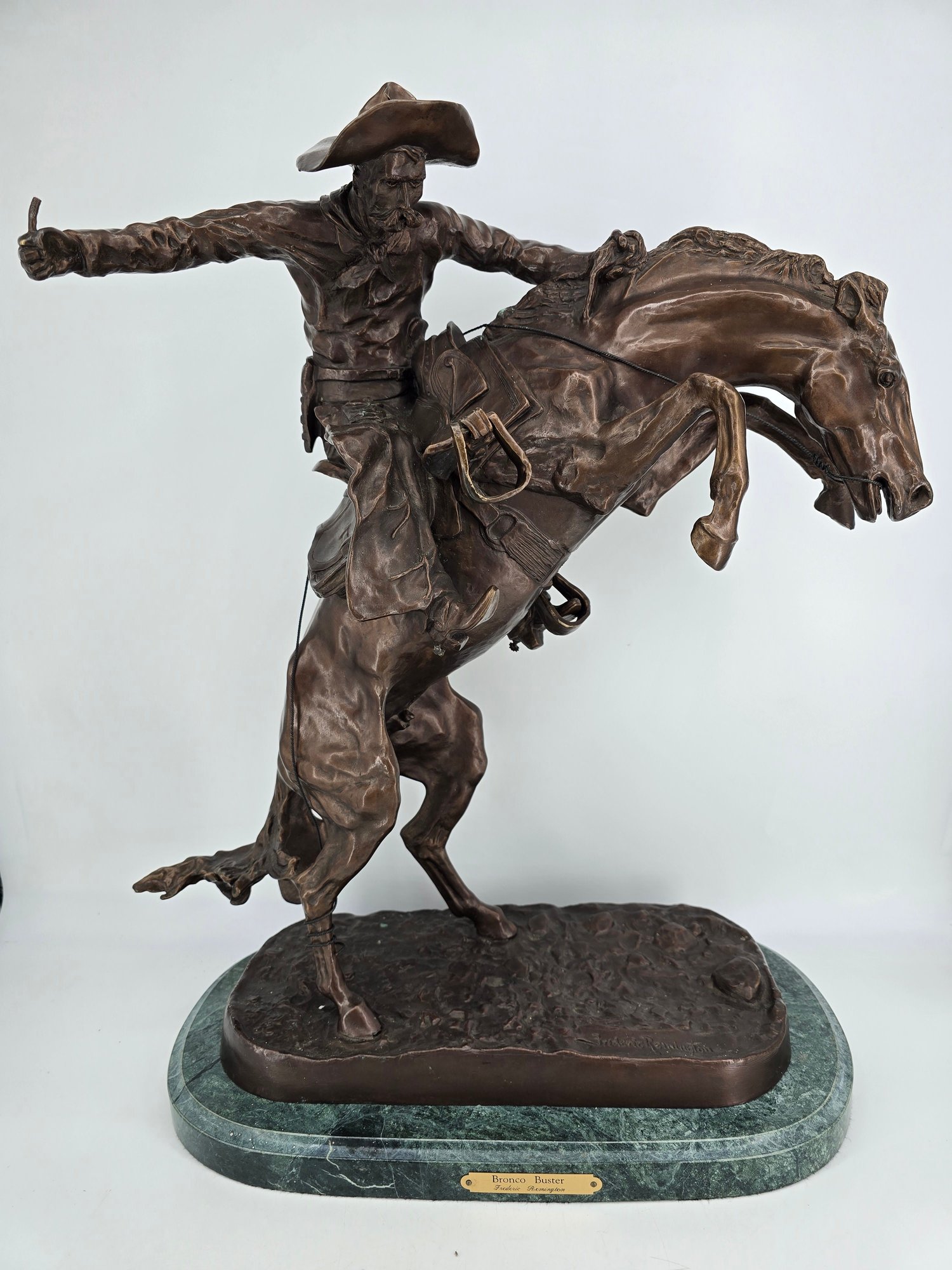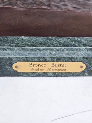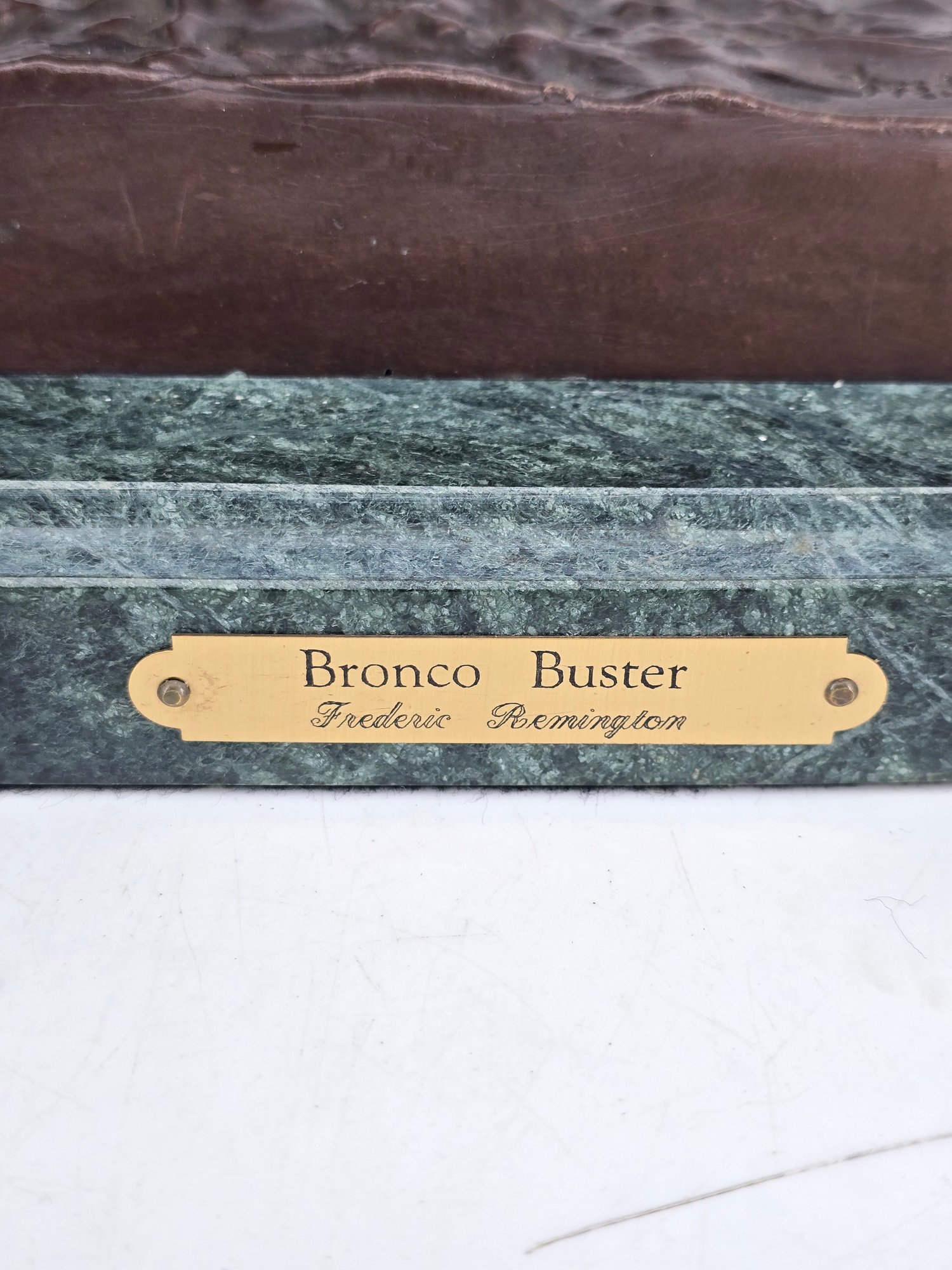 Bronze replica of Frederic Remington's famous sculpture, "The Bronco Buster". On marble stand, stands about 22.5" x 18" x 10" - See Photos - Repairable? This item is not shippable.