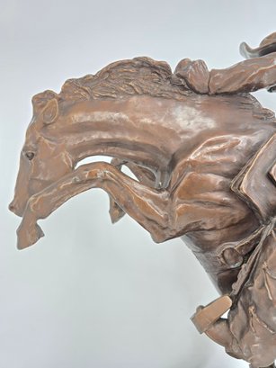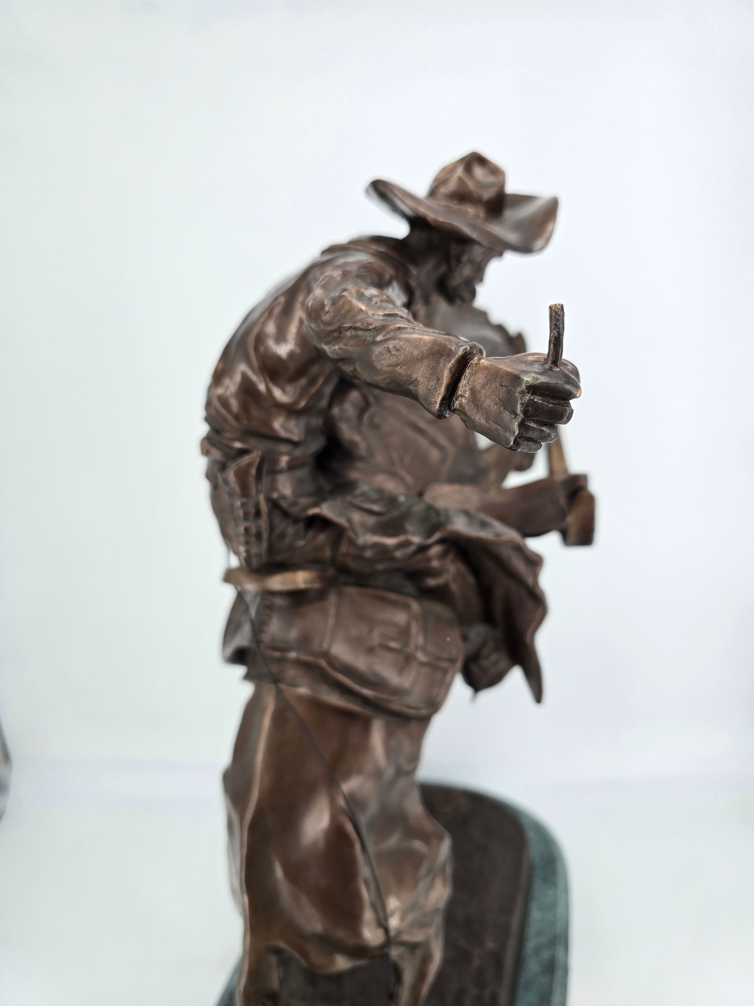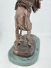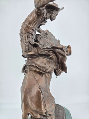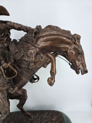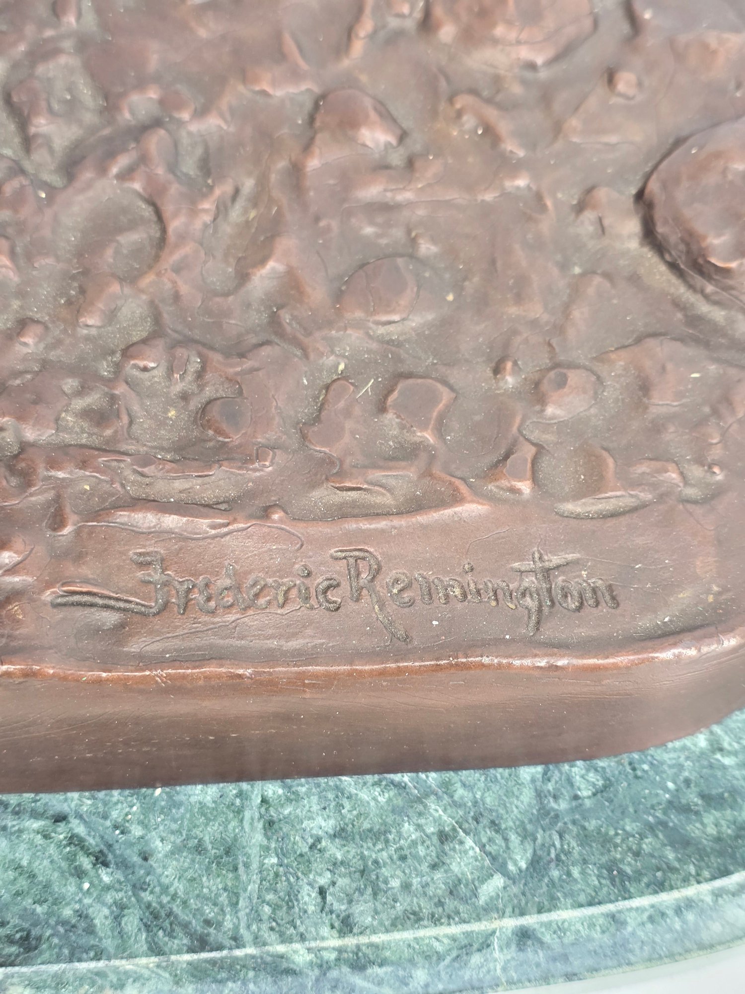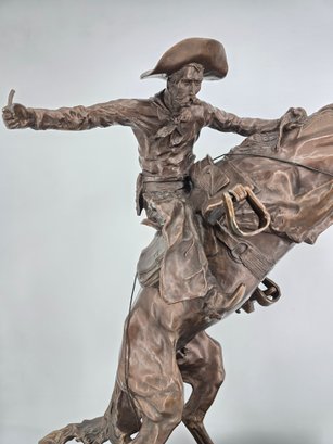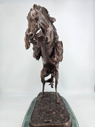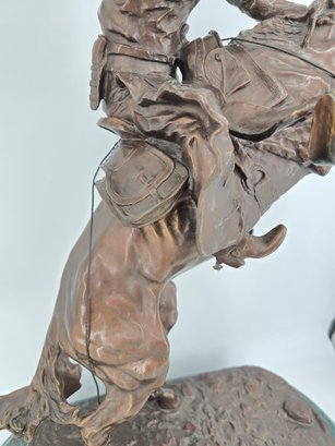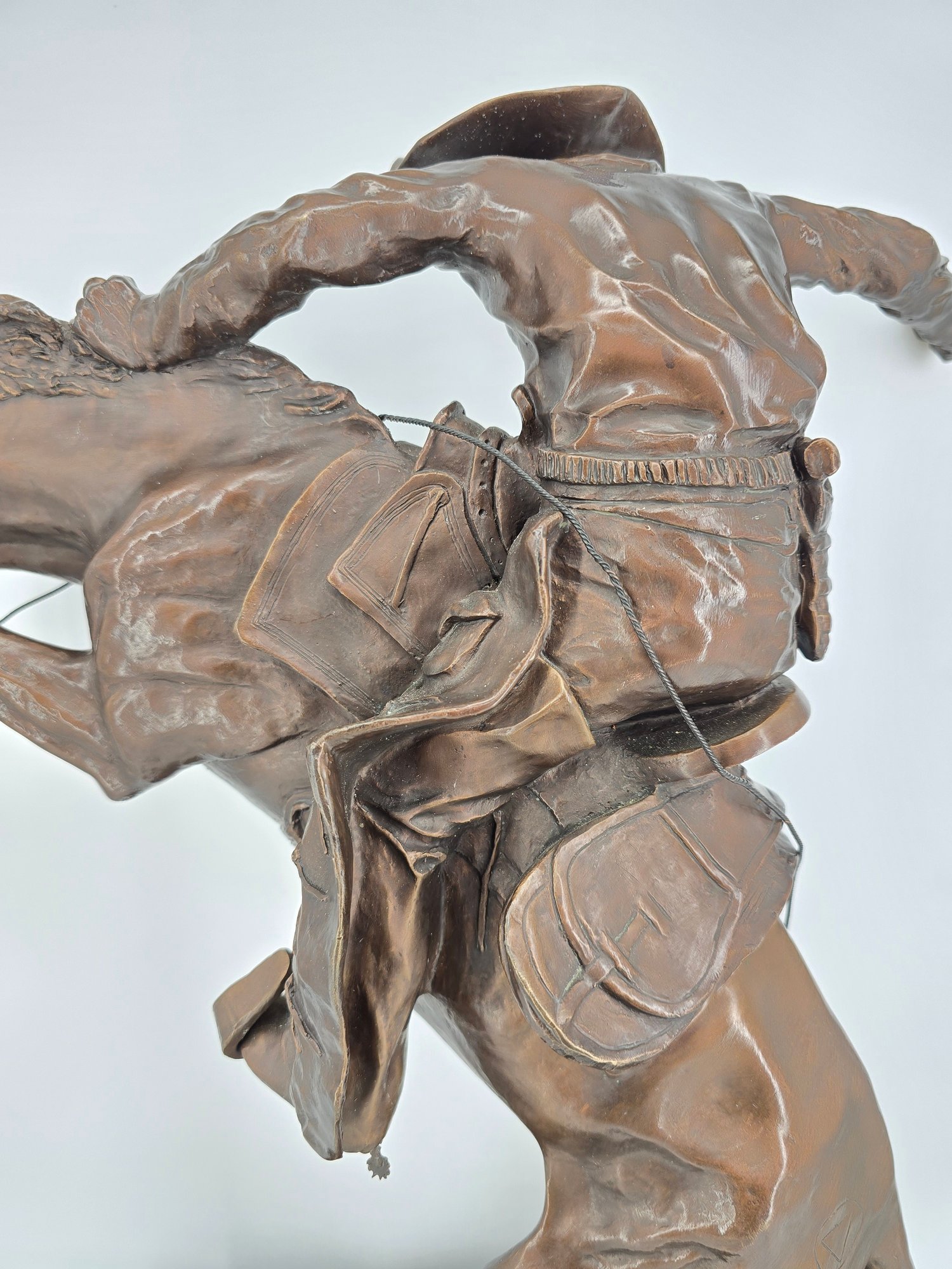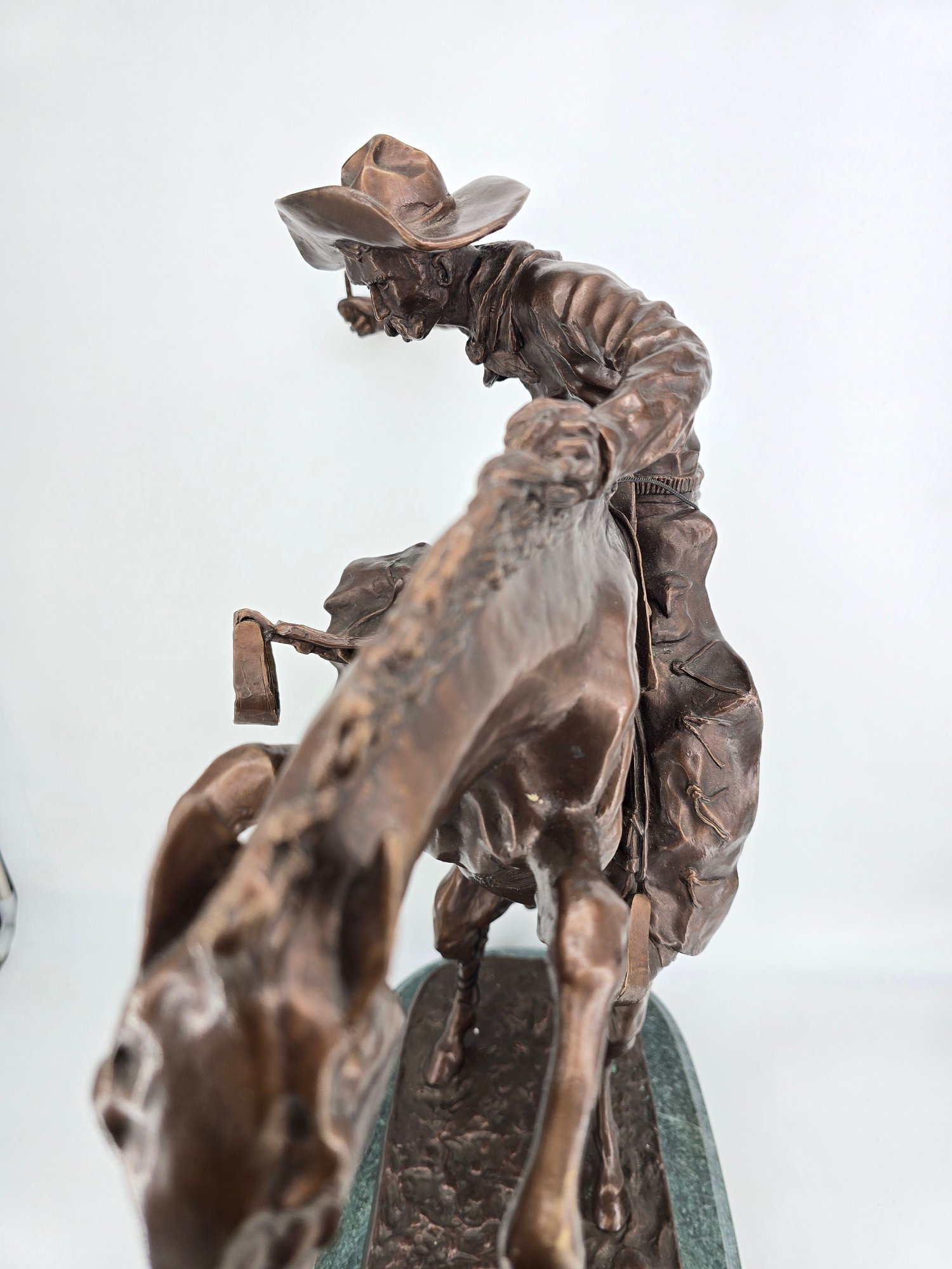 Bronze replica of Frederic Remington's famous sculpture, "The Bronco Buster". On marble stand, stands about 22.5" x 18" x 10" - See Photos - Repairable? This item is not shippable.
