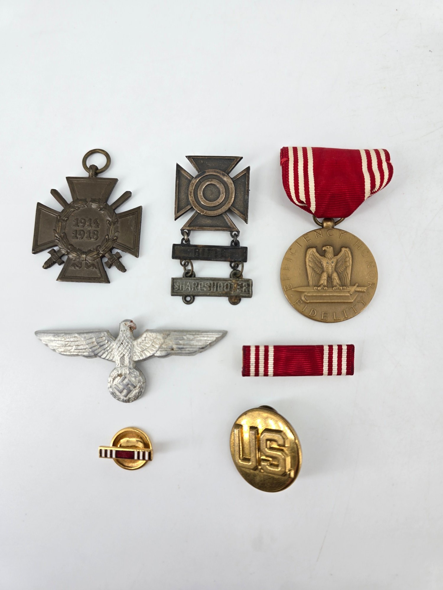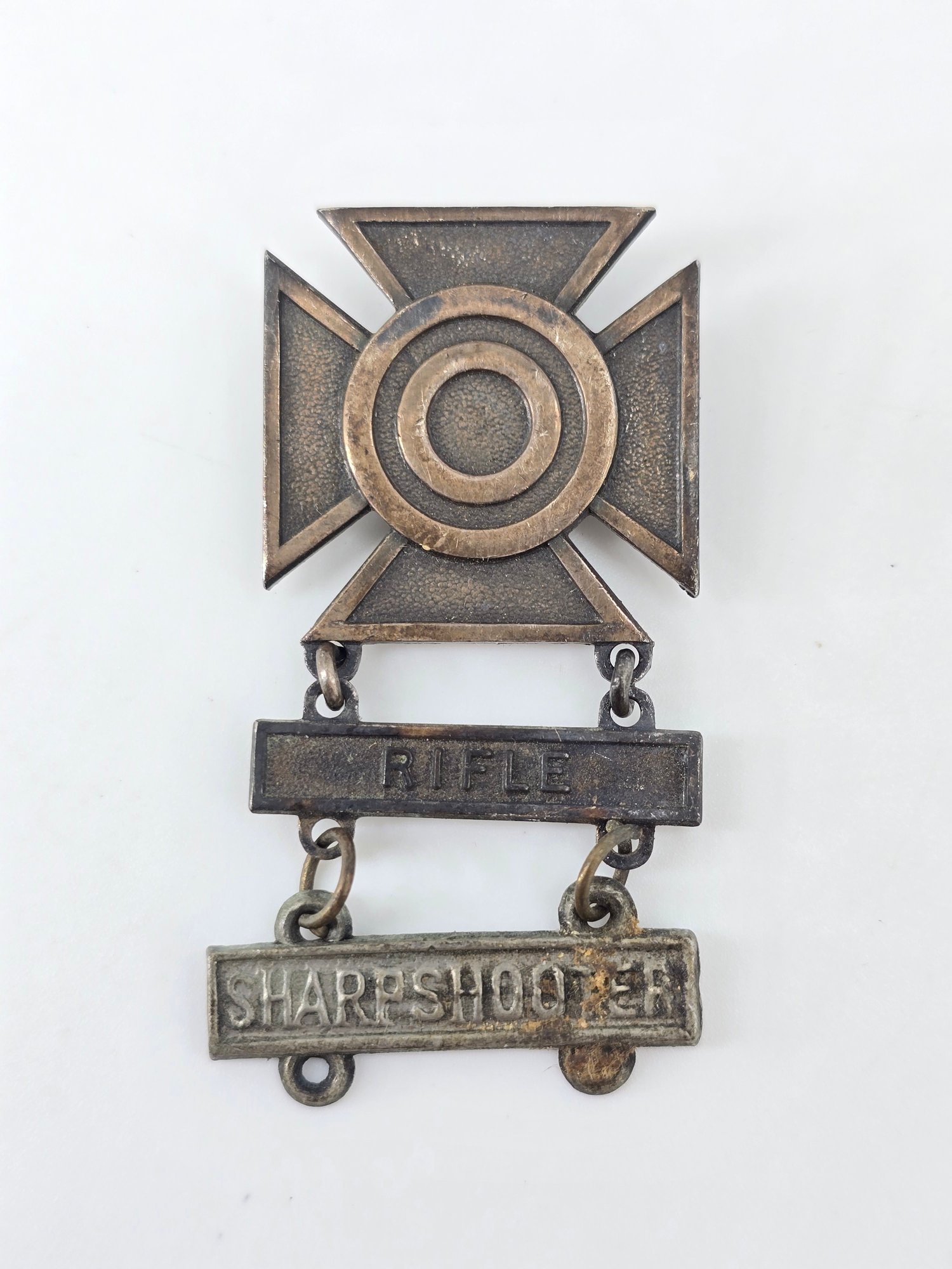 Sharpshooter Badge: The cross-shaped badge in the top center is a military marksmanship badge, specifically for a sharpshooter.