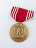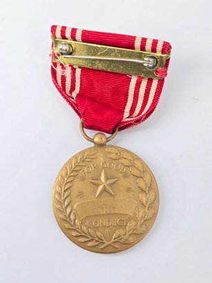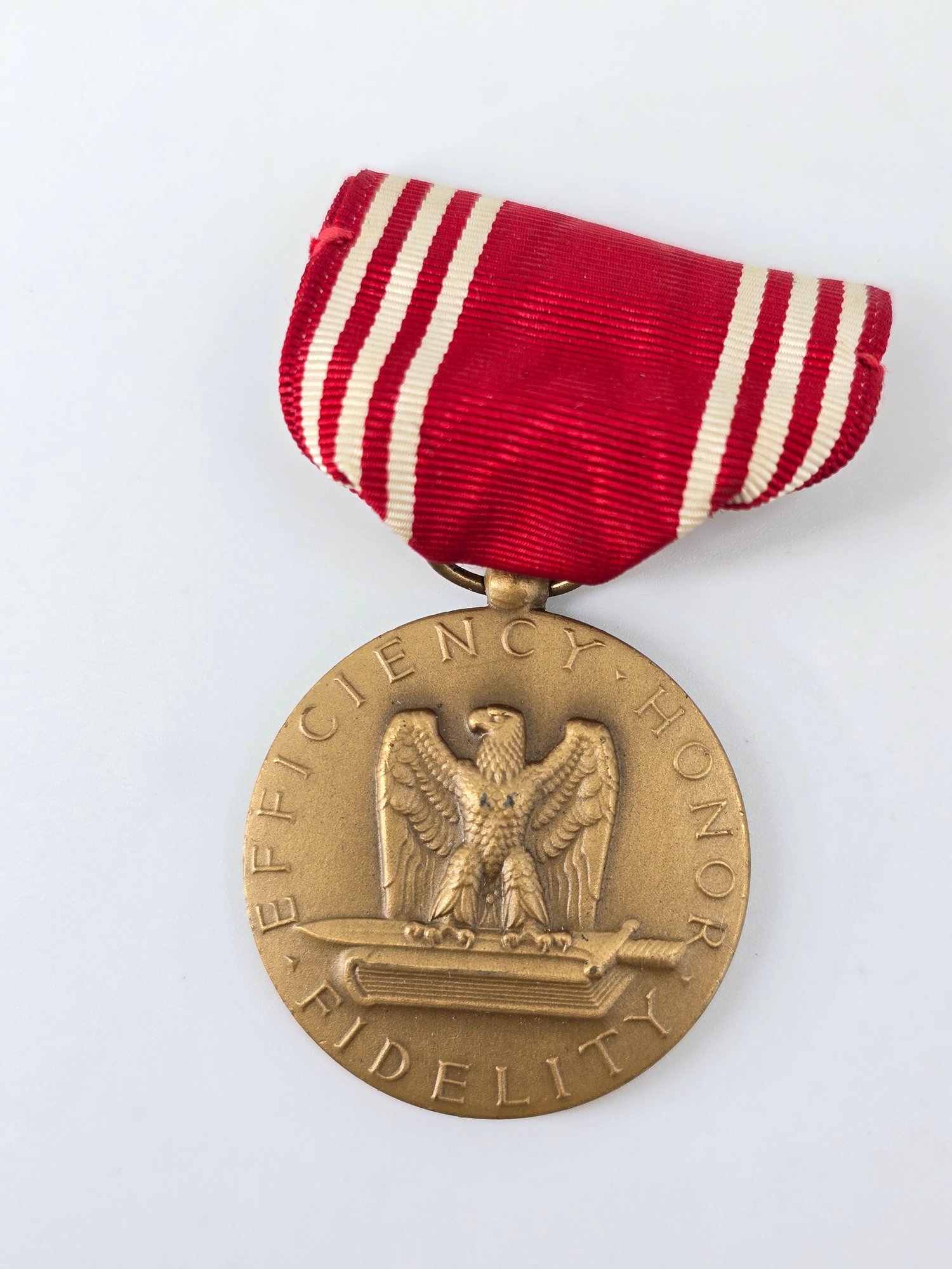 Army Good Conduct Medal: The red-ribboned medal on the upper right is a U.S. Army Good Conduct Medal, awarded for exemplary behavior and fidelity.