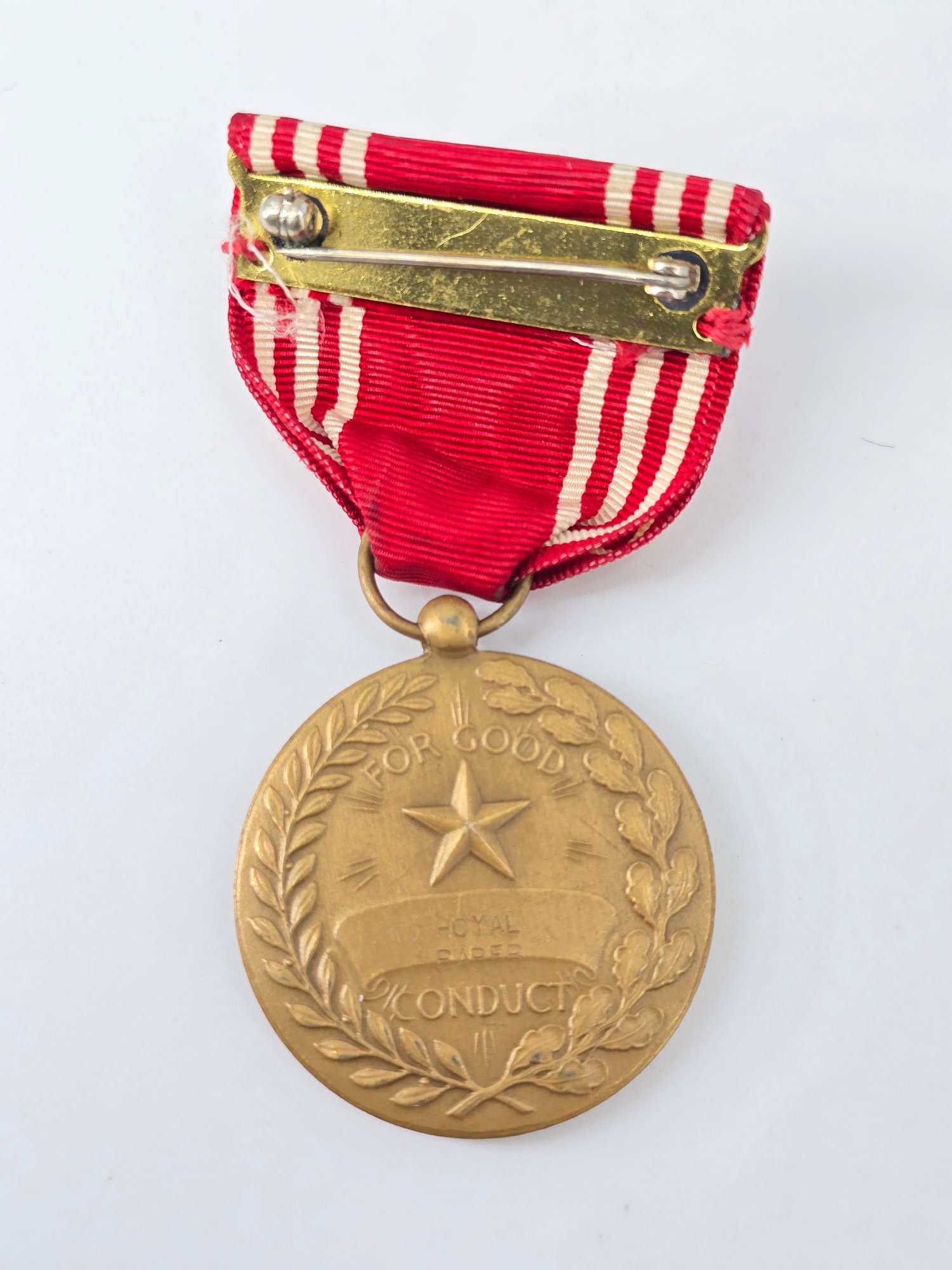 Ribbon Bar: The small red ribbon bar corresponds to the Good Conduct Medal. See Photos. Silver badge weighs 13.31g TW
