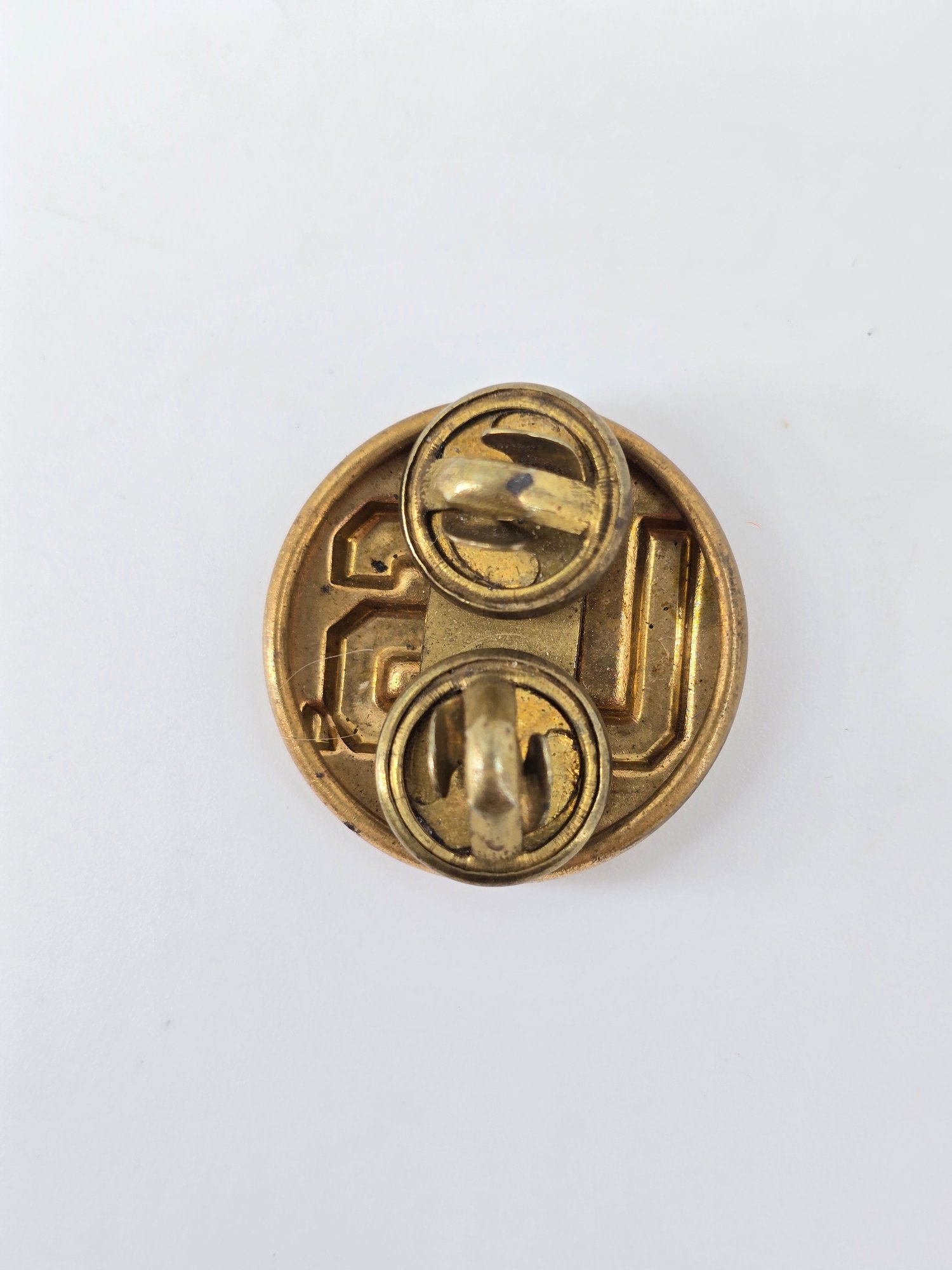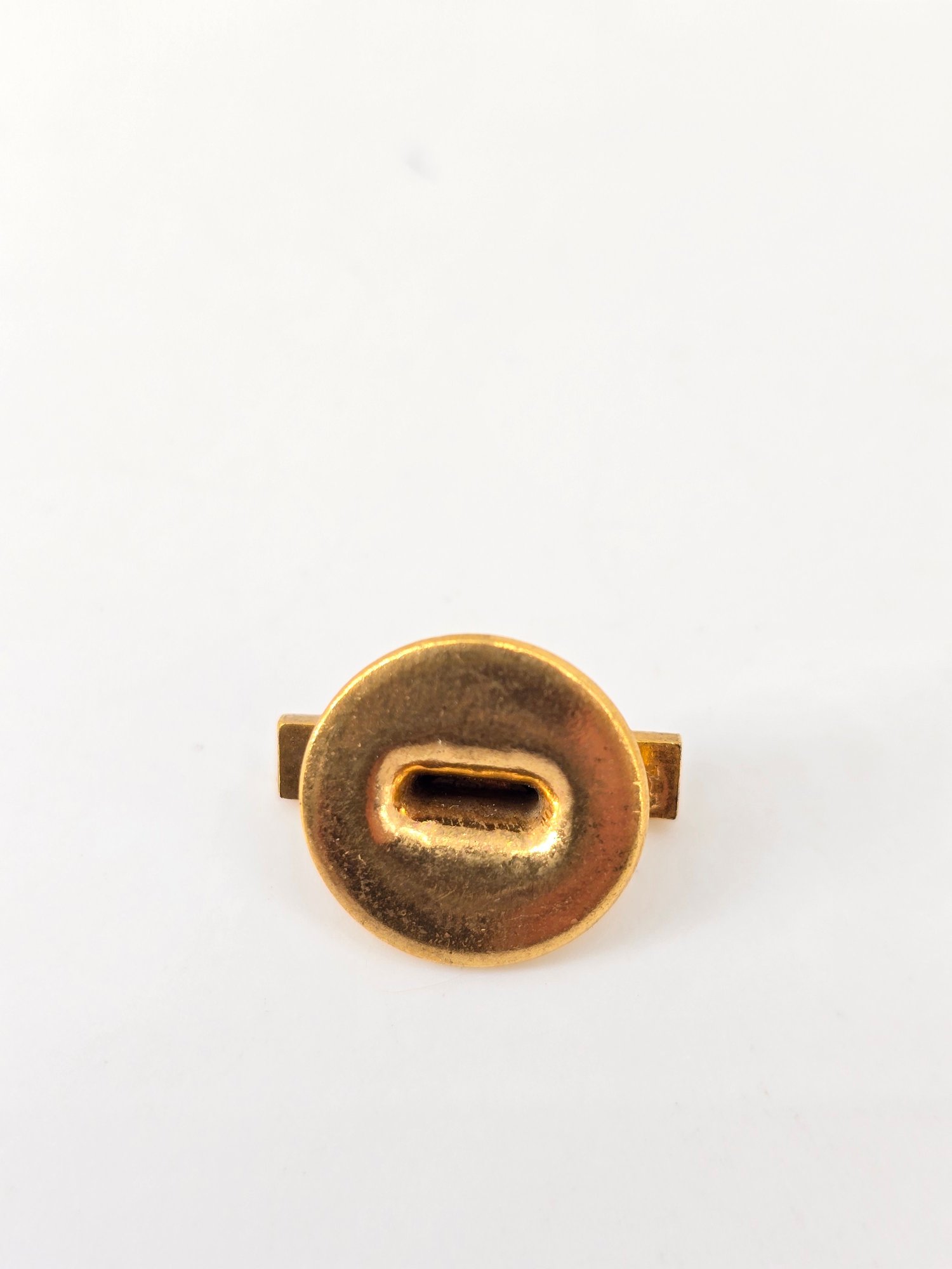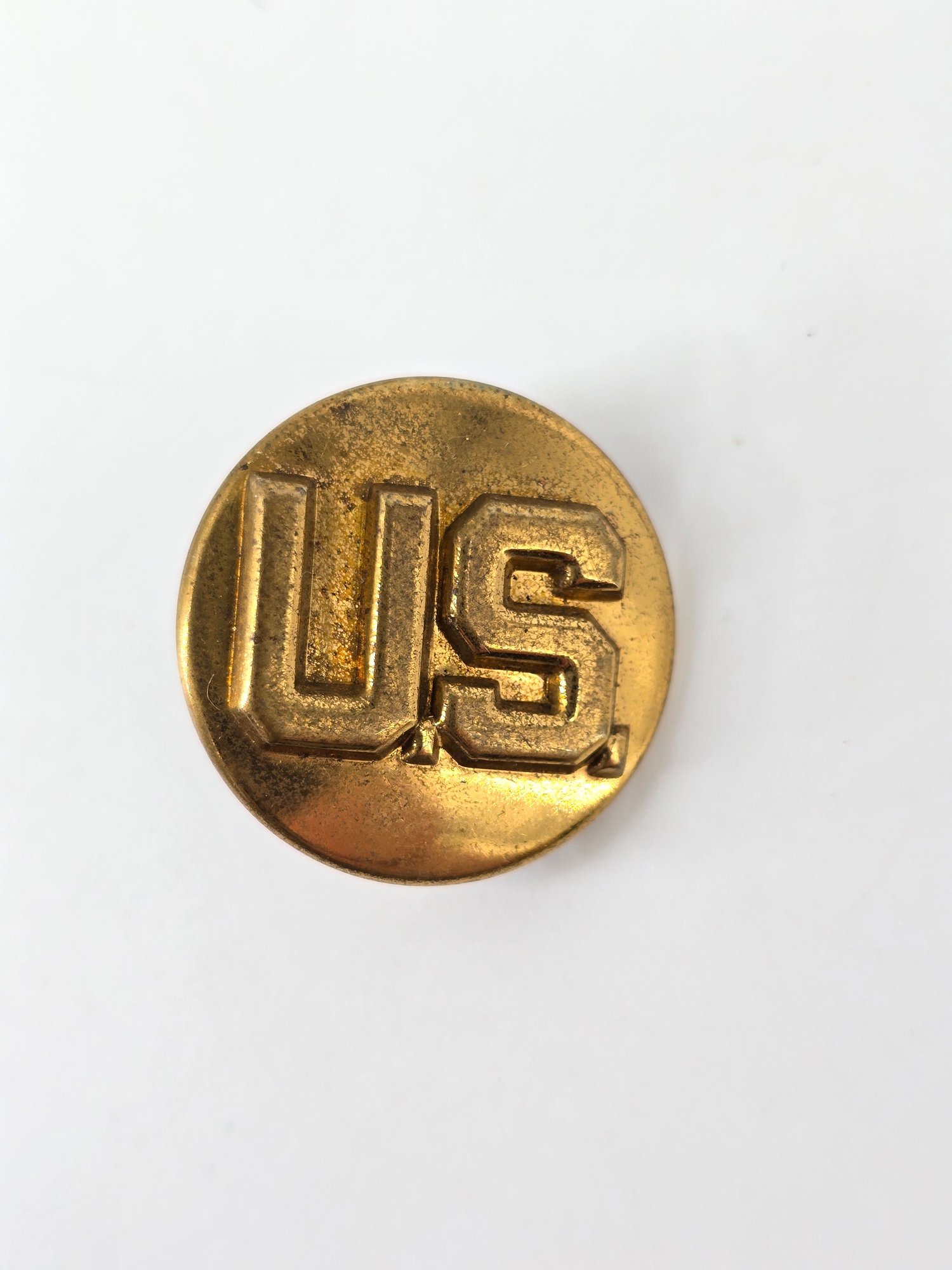 US Collar Disk: The small brass pin with "US" on the bottom right is a standard-issue collar insignia for U.S. Army soldiers.