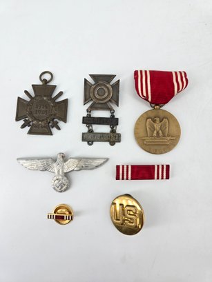 Collection of vintage military medals, insignia, and awards, most from the United States military, dating around World War II.