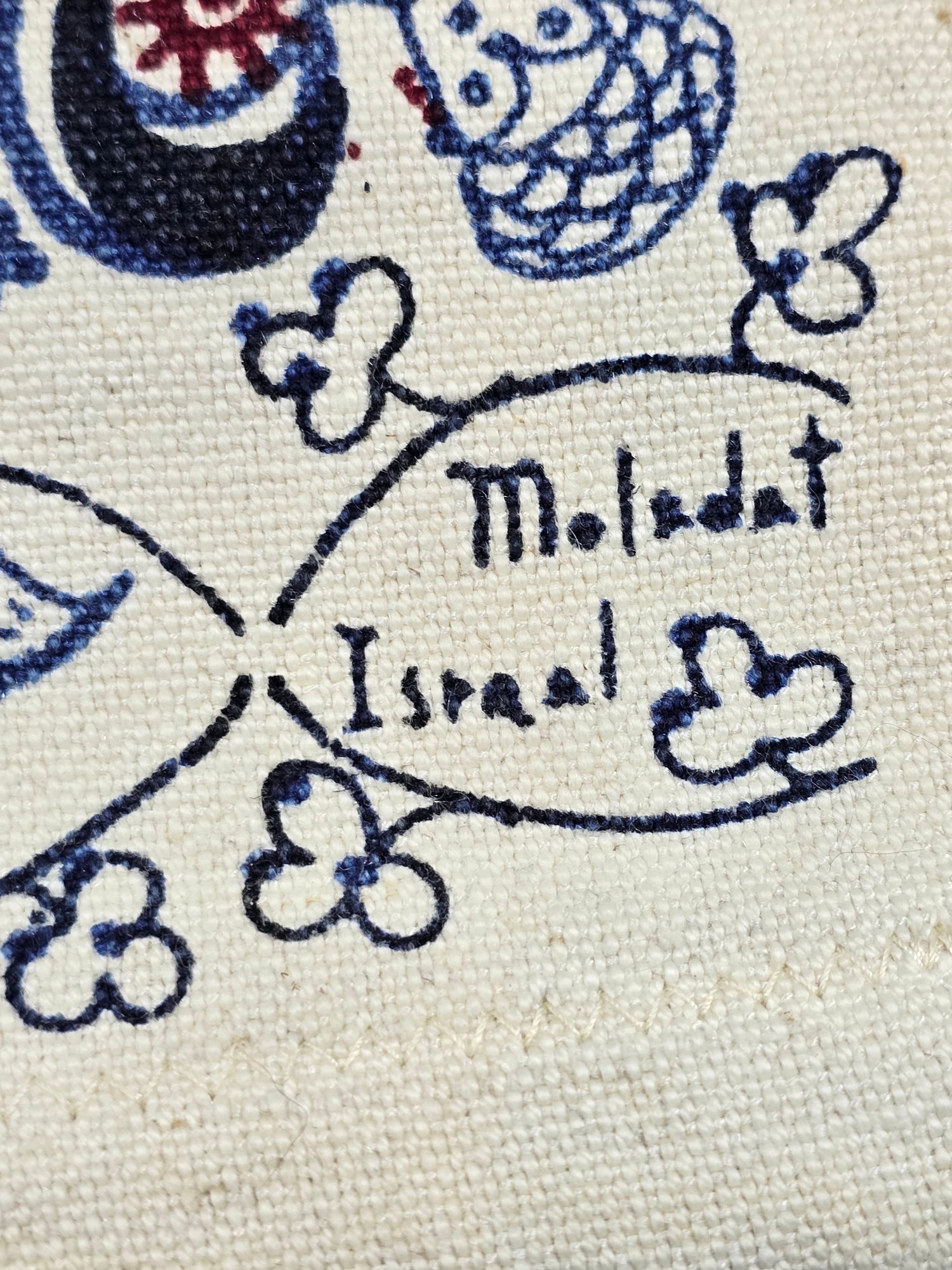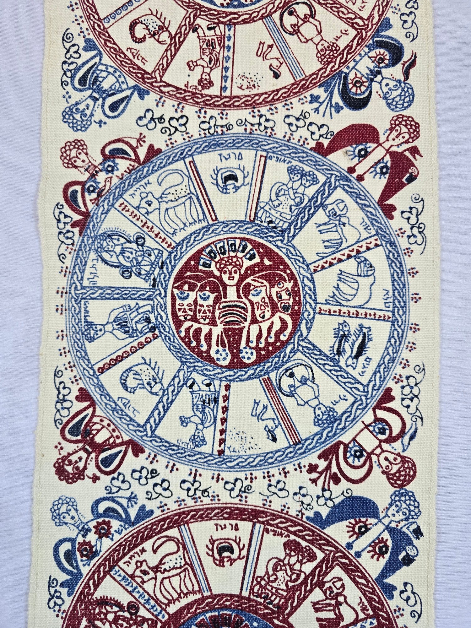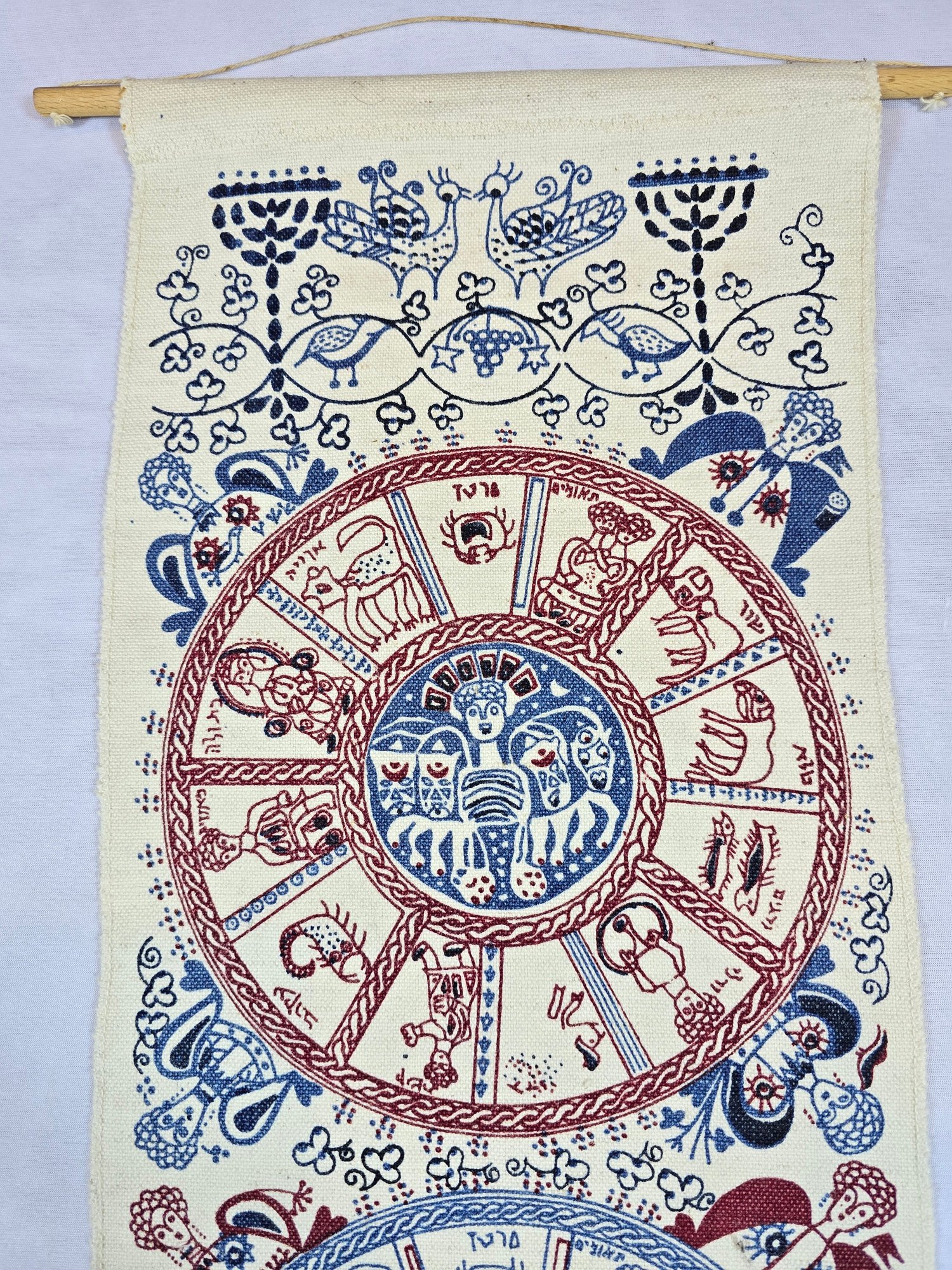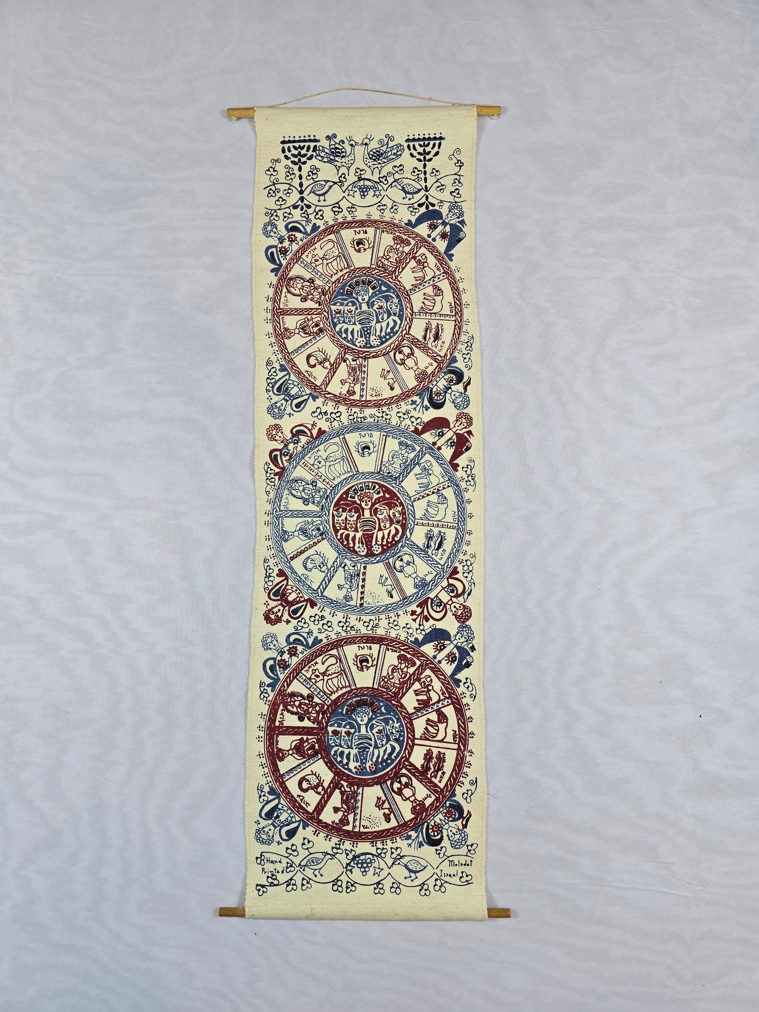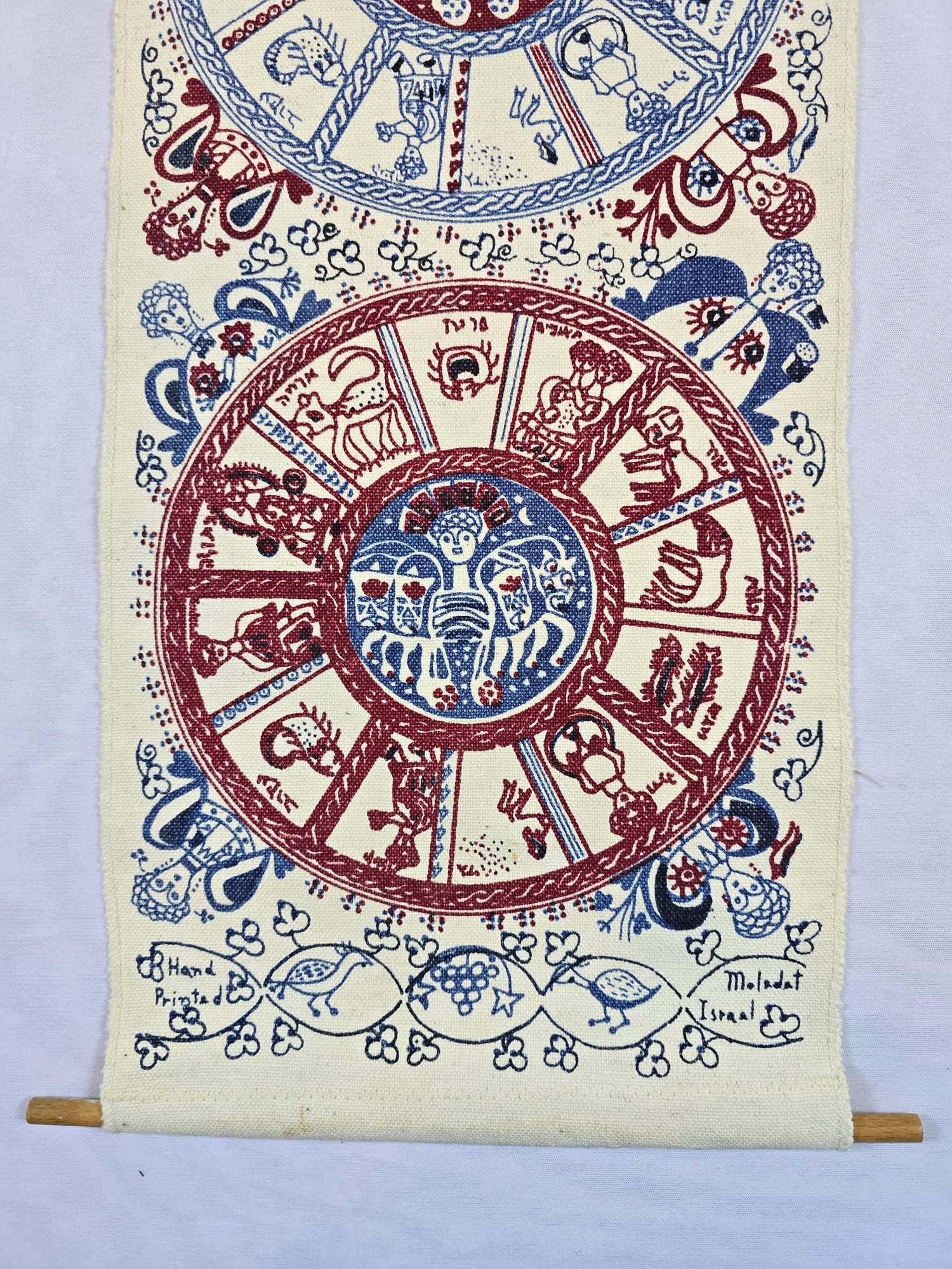Hand-printed Israeli wall hanging, depicting a cosmological scheme of the twelve months and their corresponding zodiac signs.