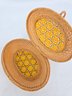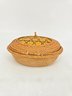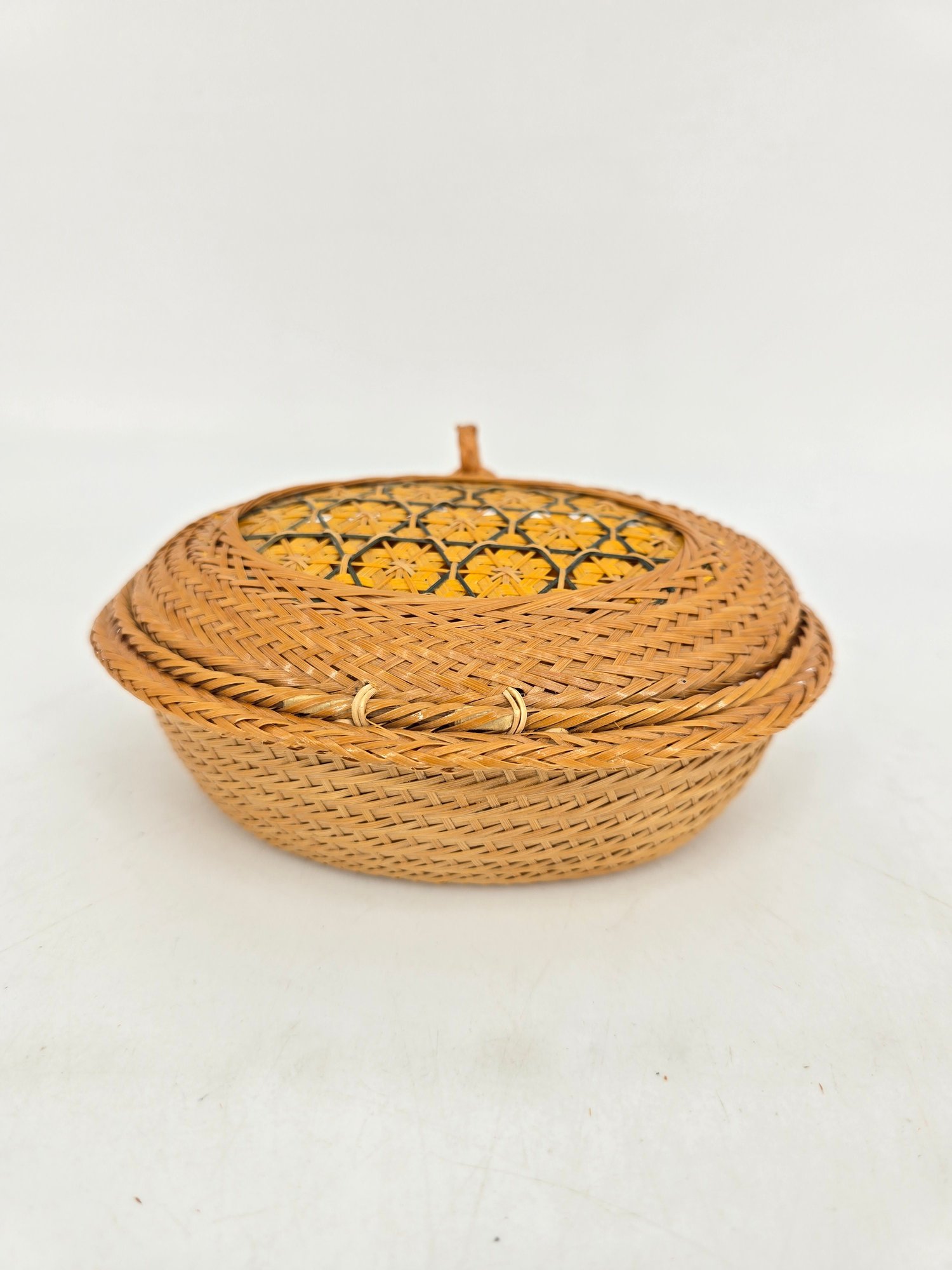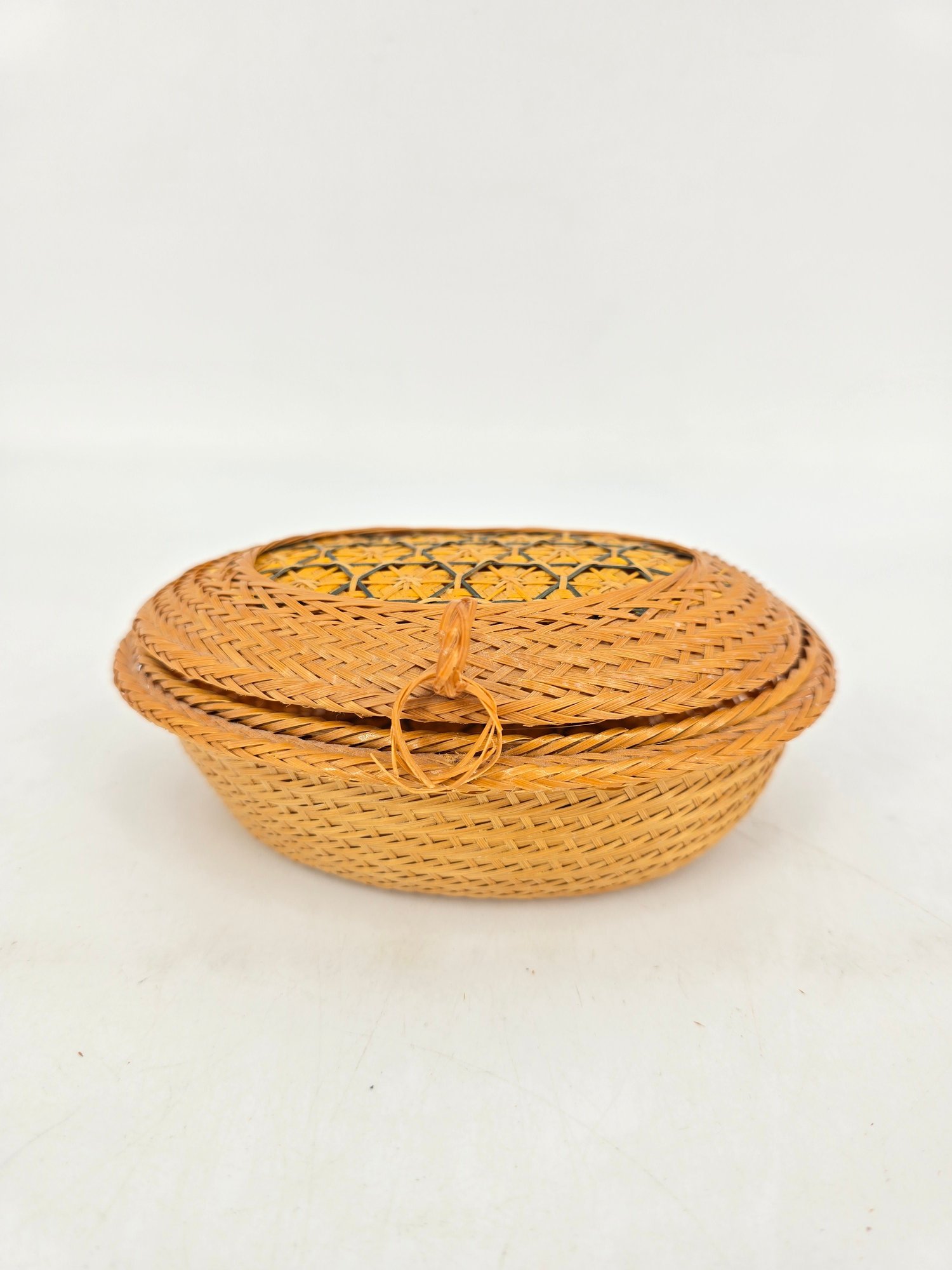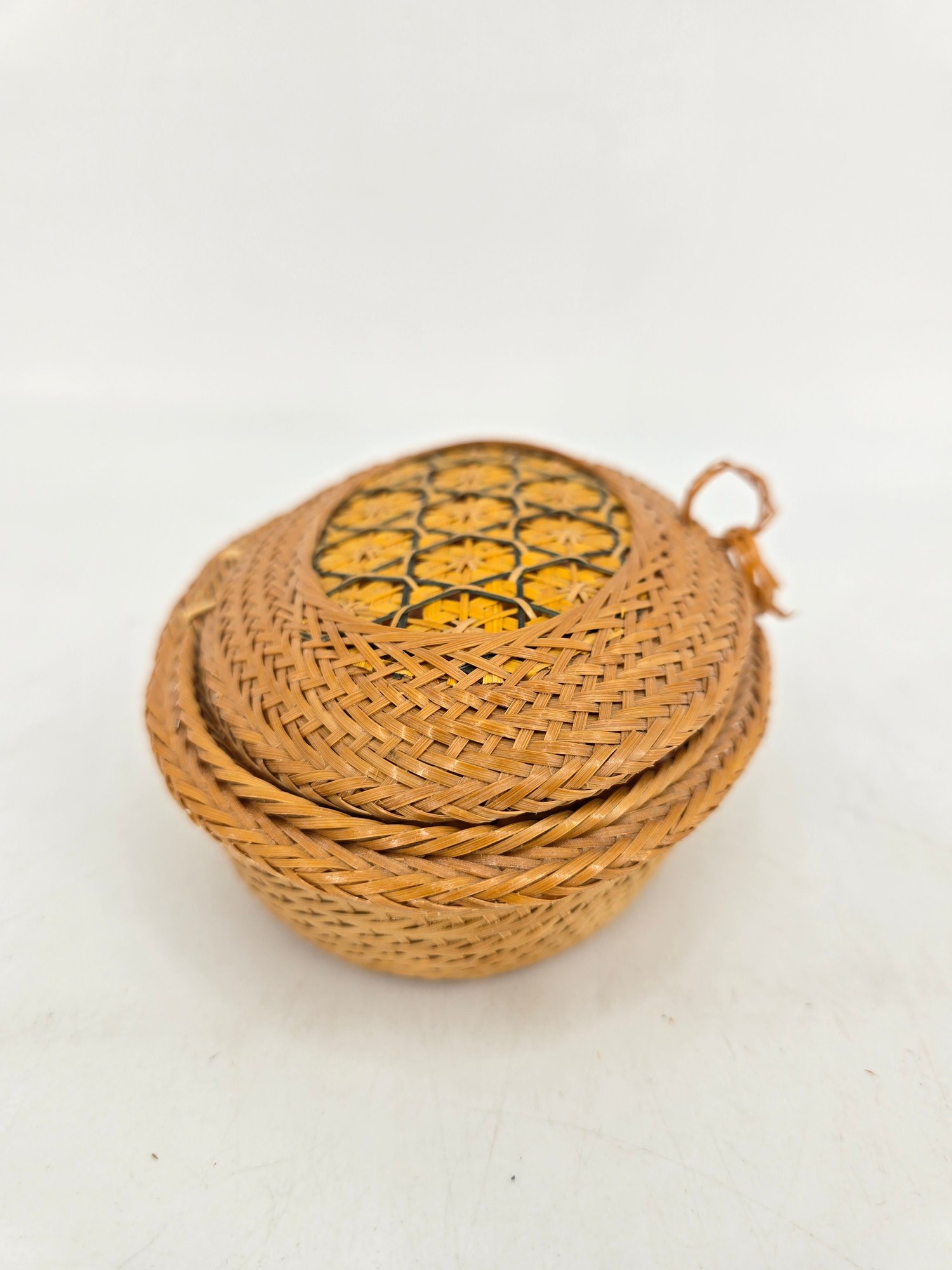 Next a small, handmade woven rattan or bamboo basket with a decorative lidded top.