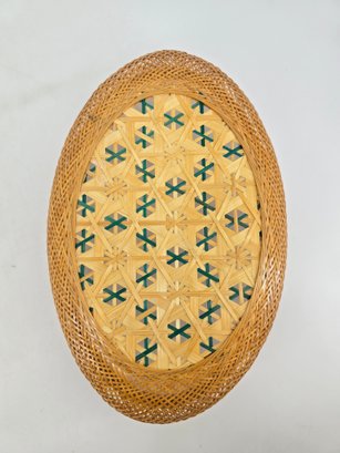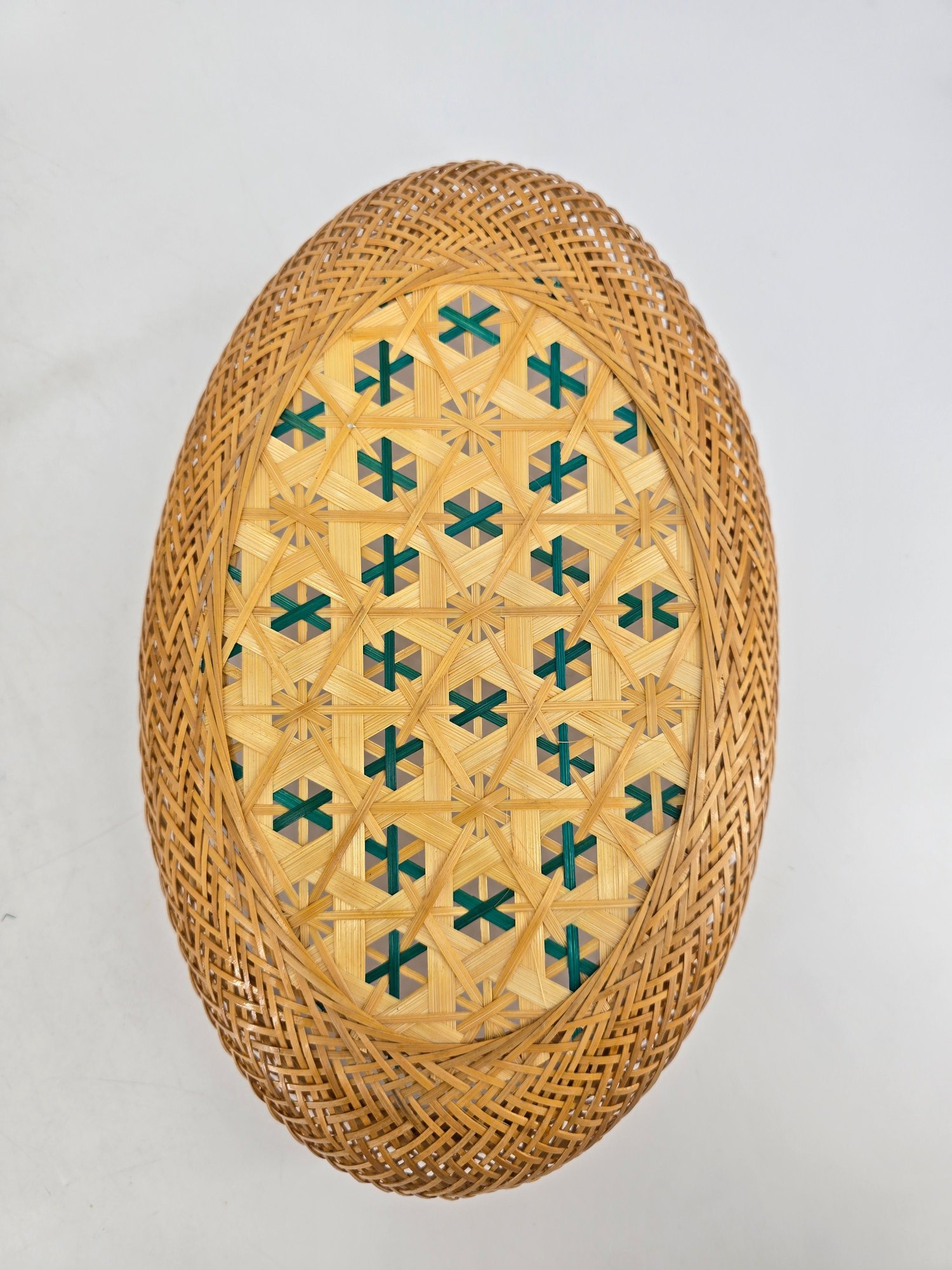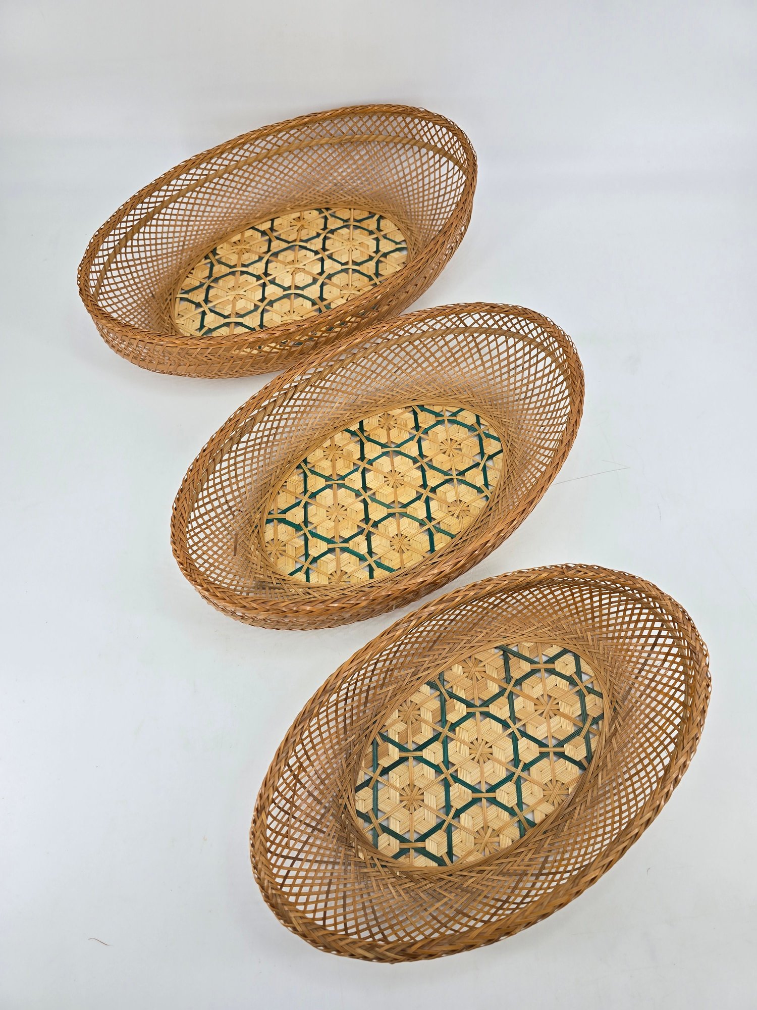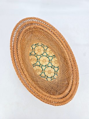 Vintage oval bamboo wicker baskets - set of three -with decorative green accents on the bottom.