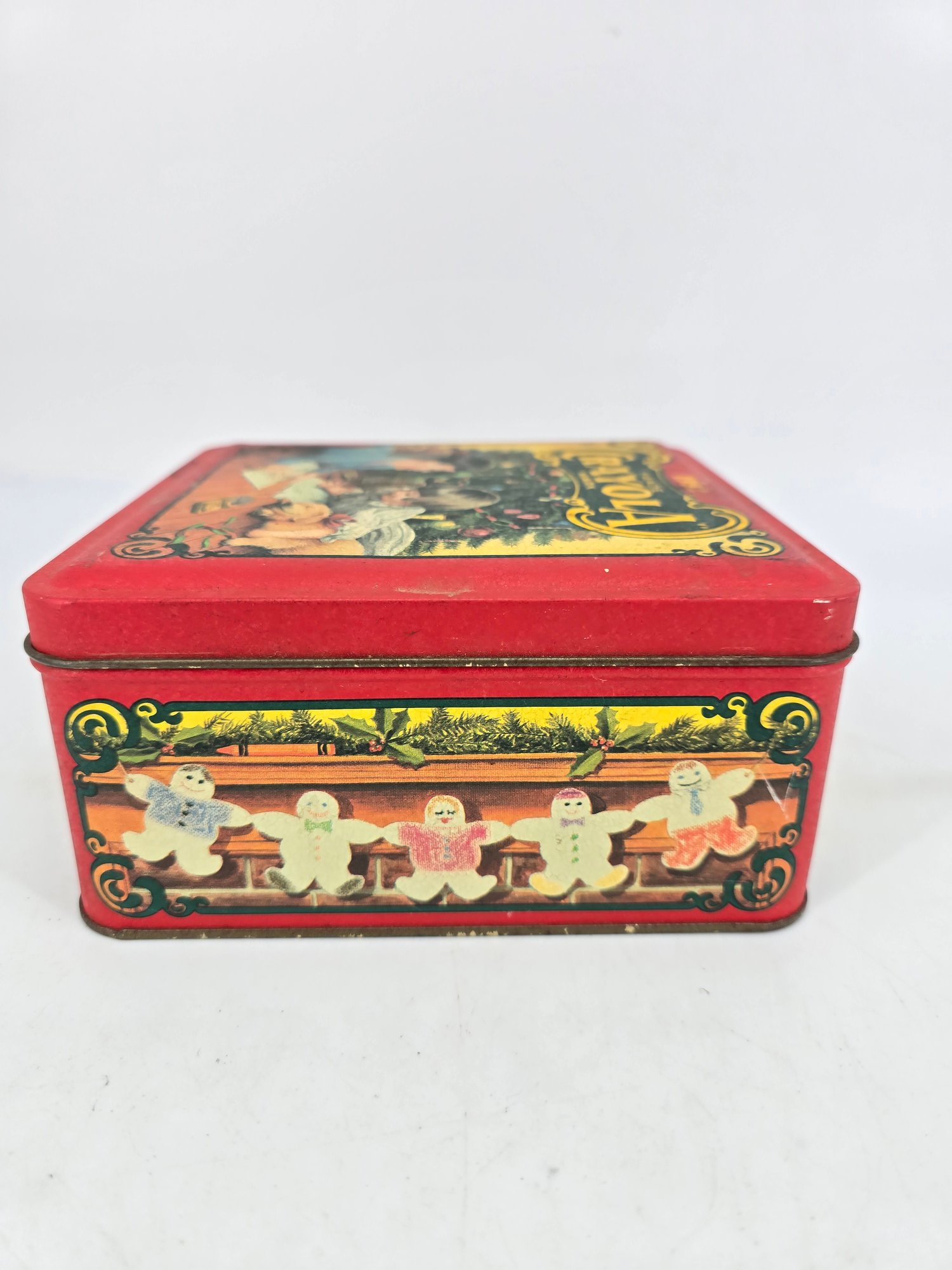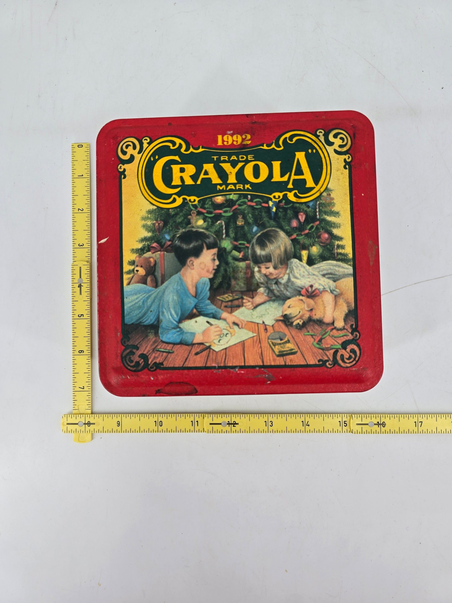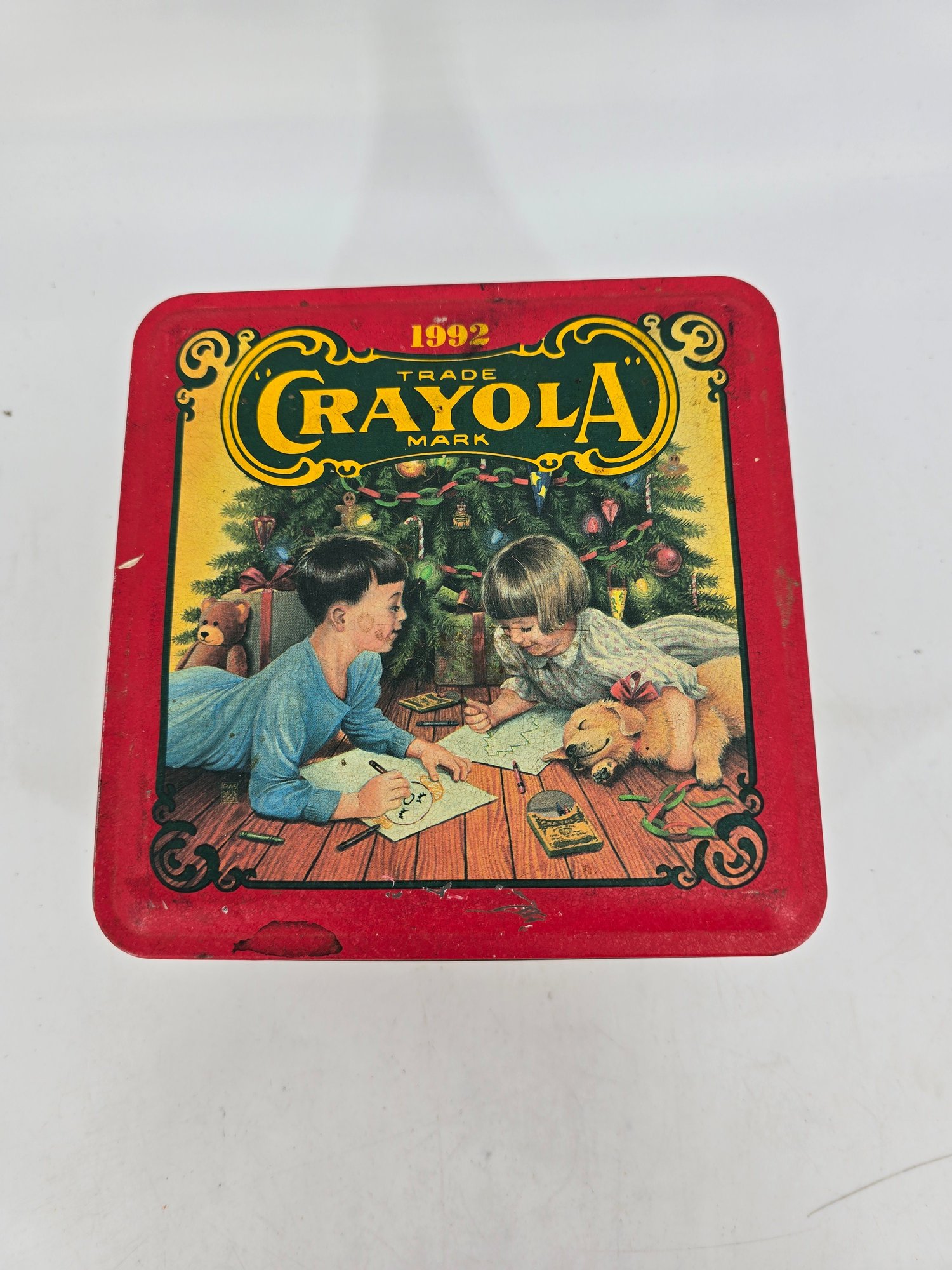 The red tin is a 1992 Crayola Collectible Holiday Tin originally packaged with crayons and a bear ornament.