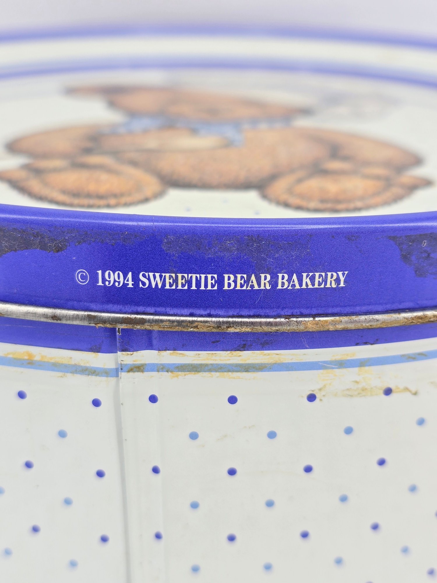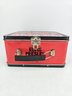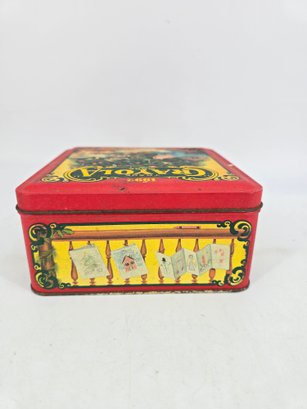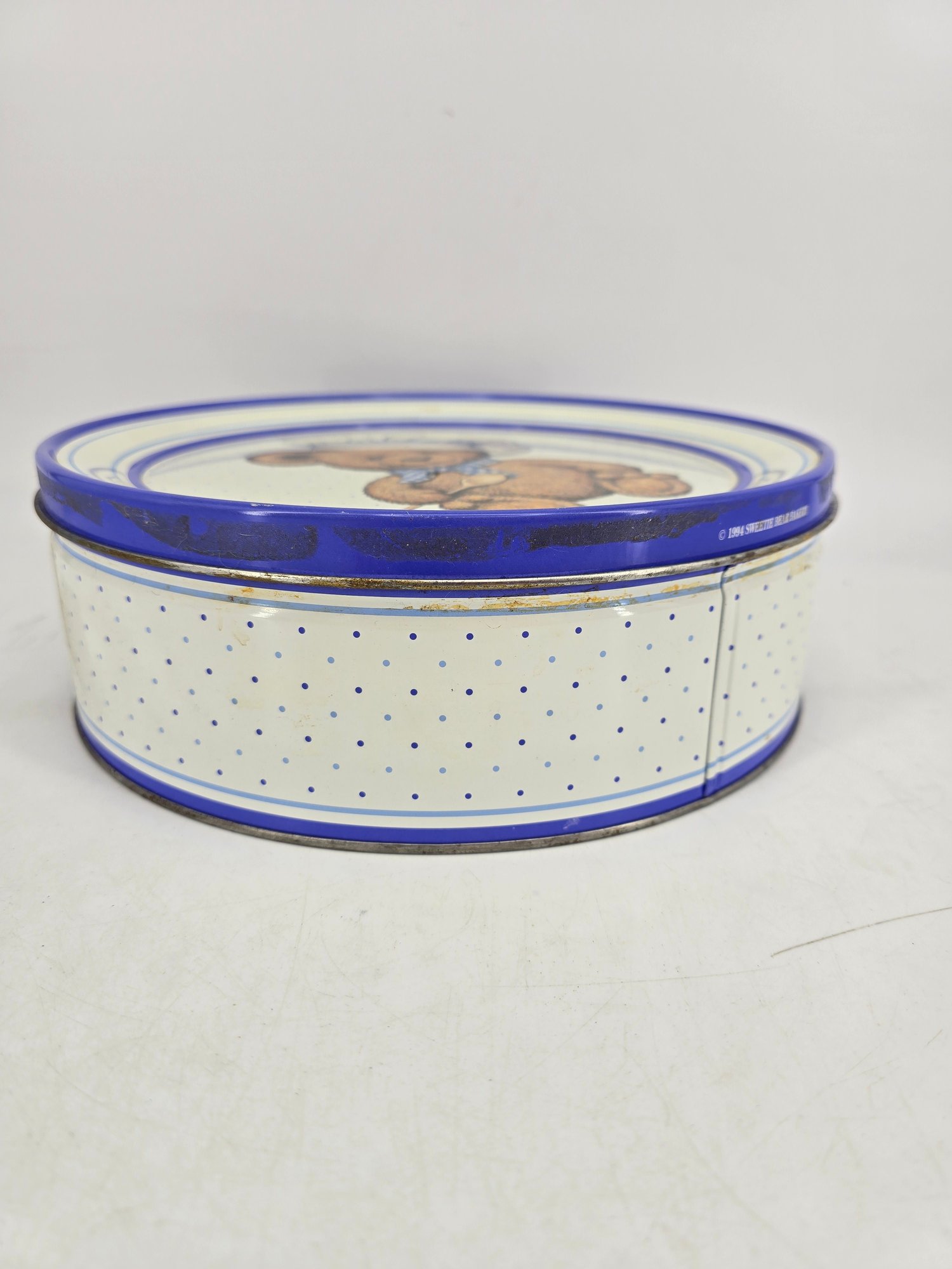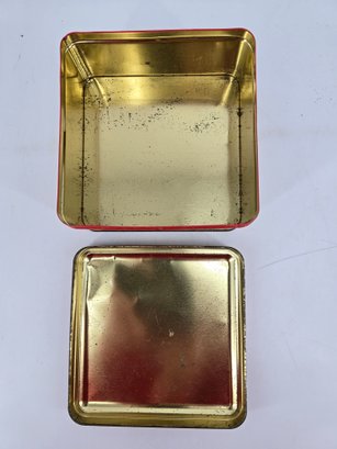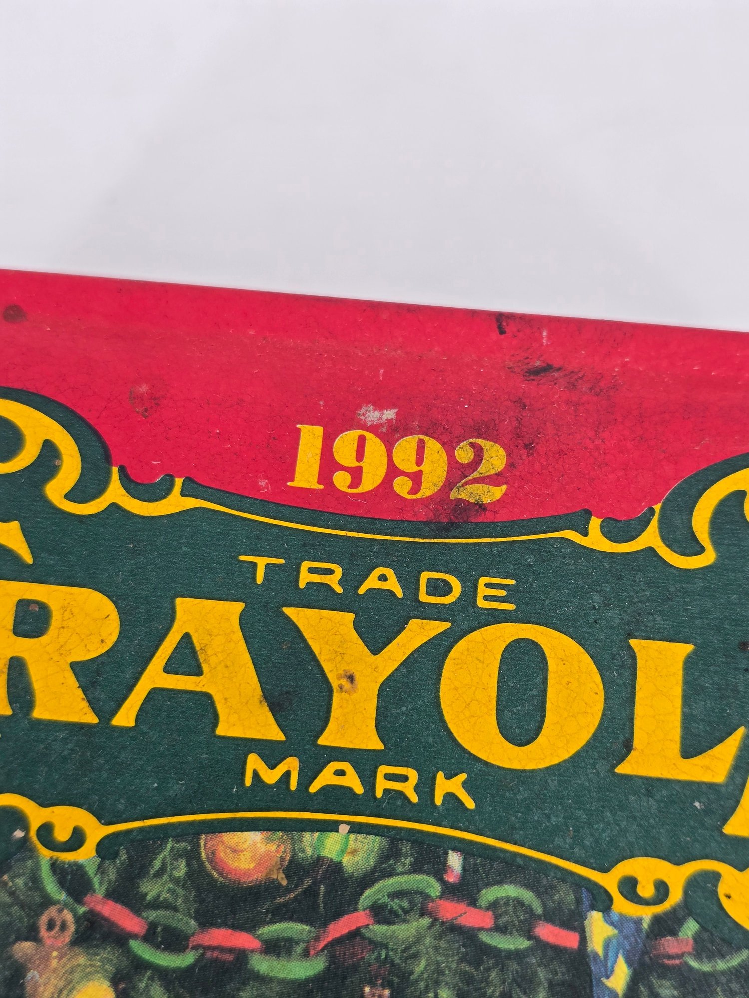 The red tin is a 1992 Crayola Collectible Holiday Tin originally packaged with crayons and a bear ornament.