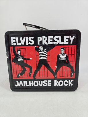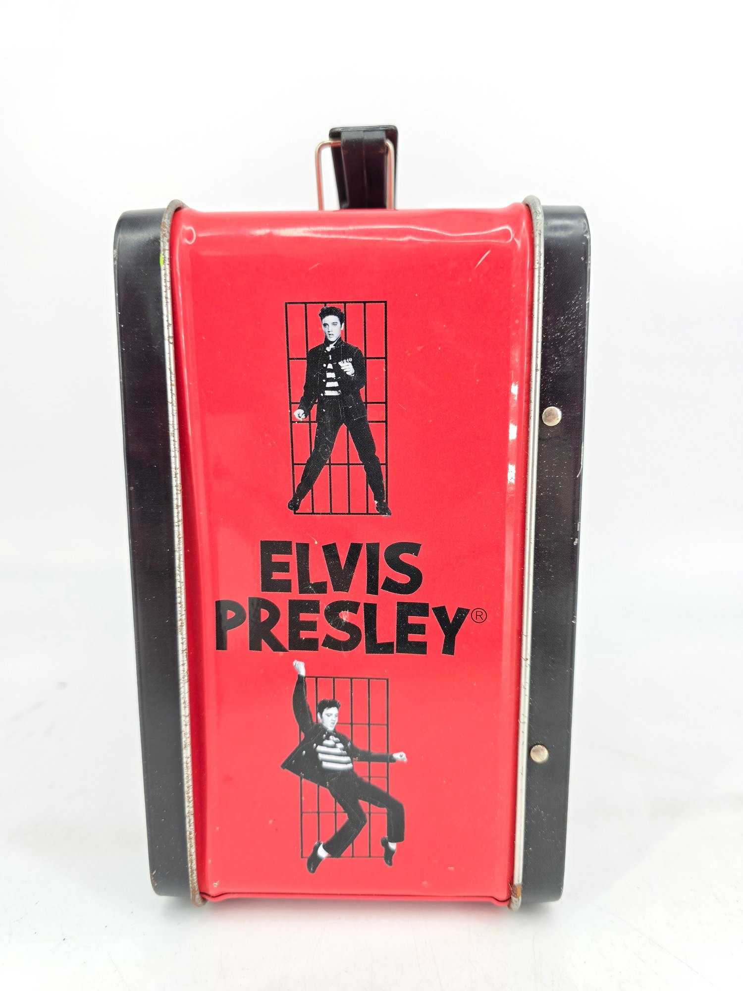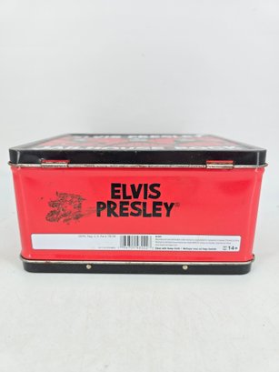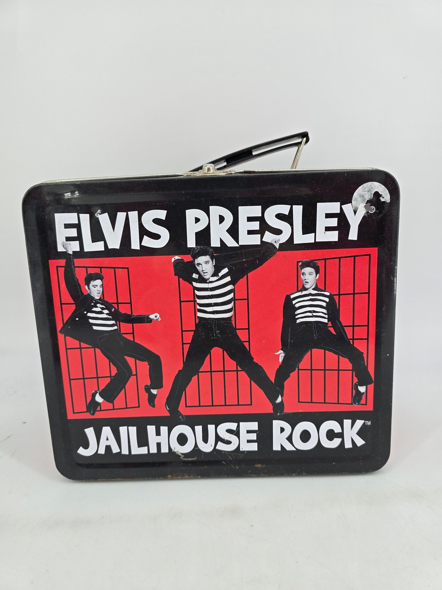 The tin featuring Elvis Presley is a Jailhouse Rock lunchbox-style tin.