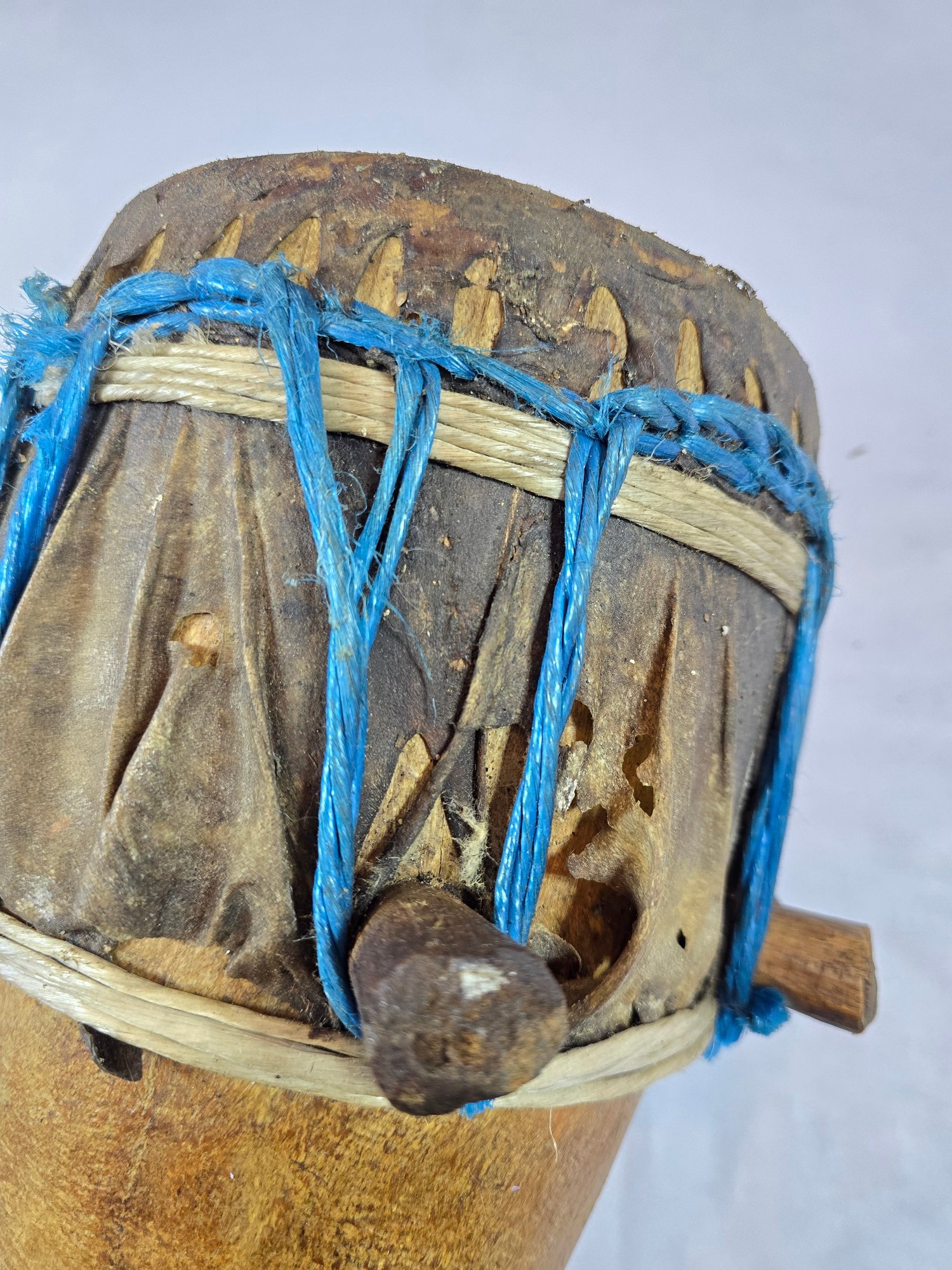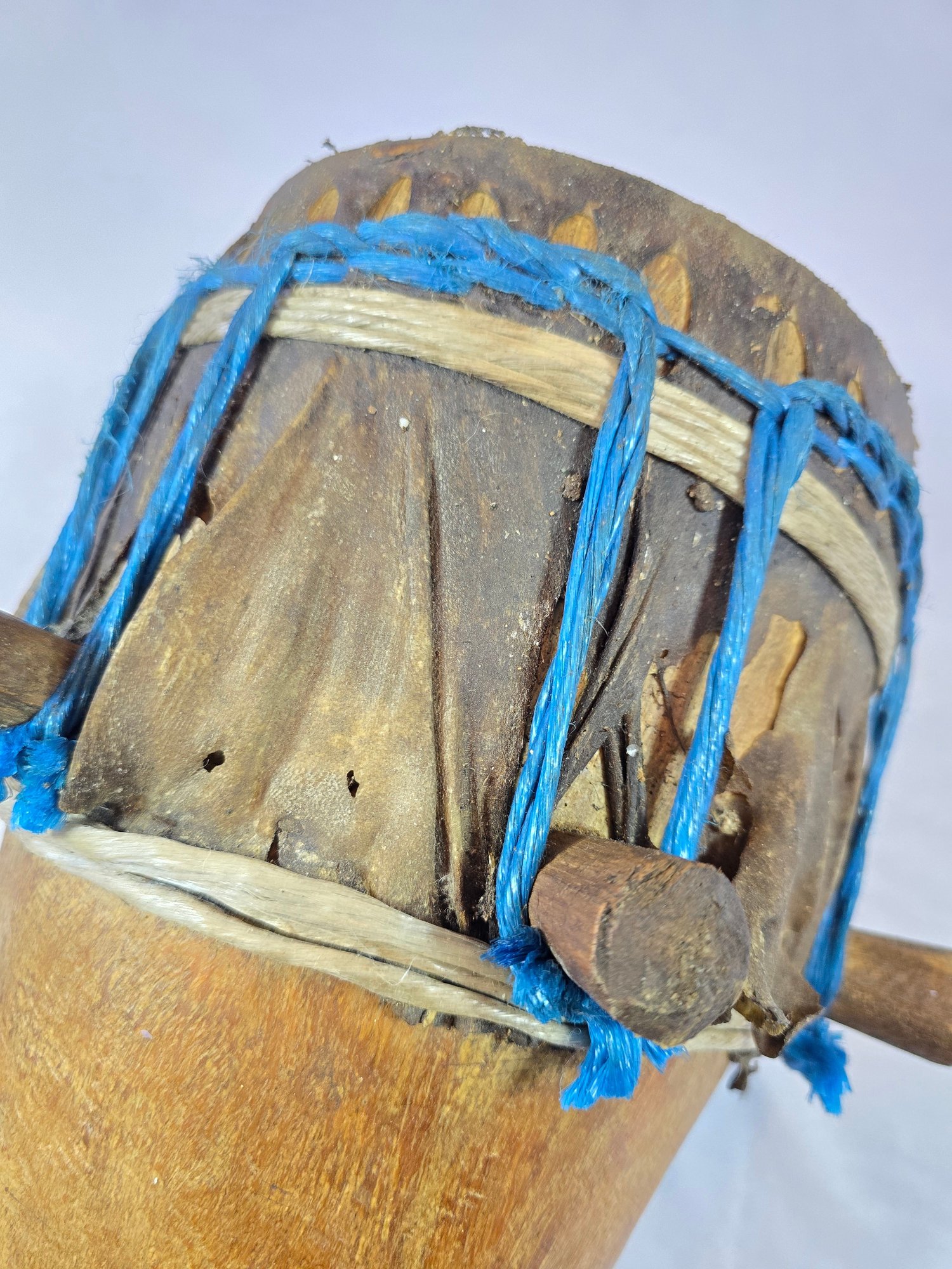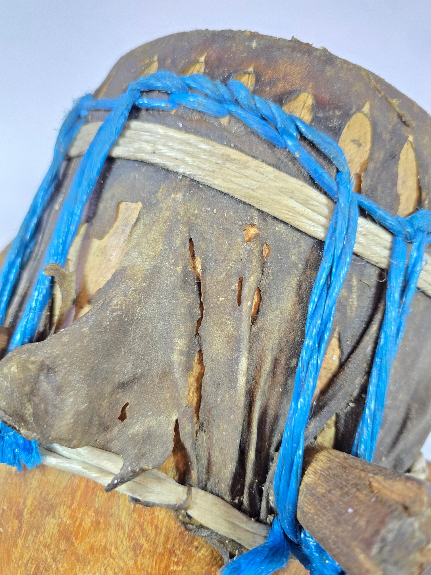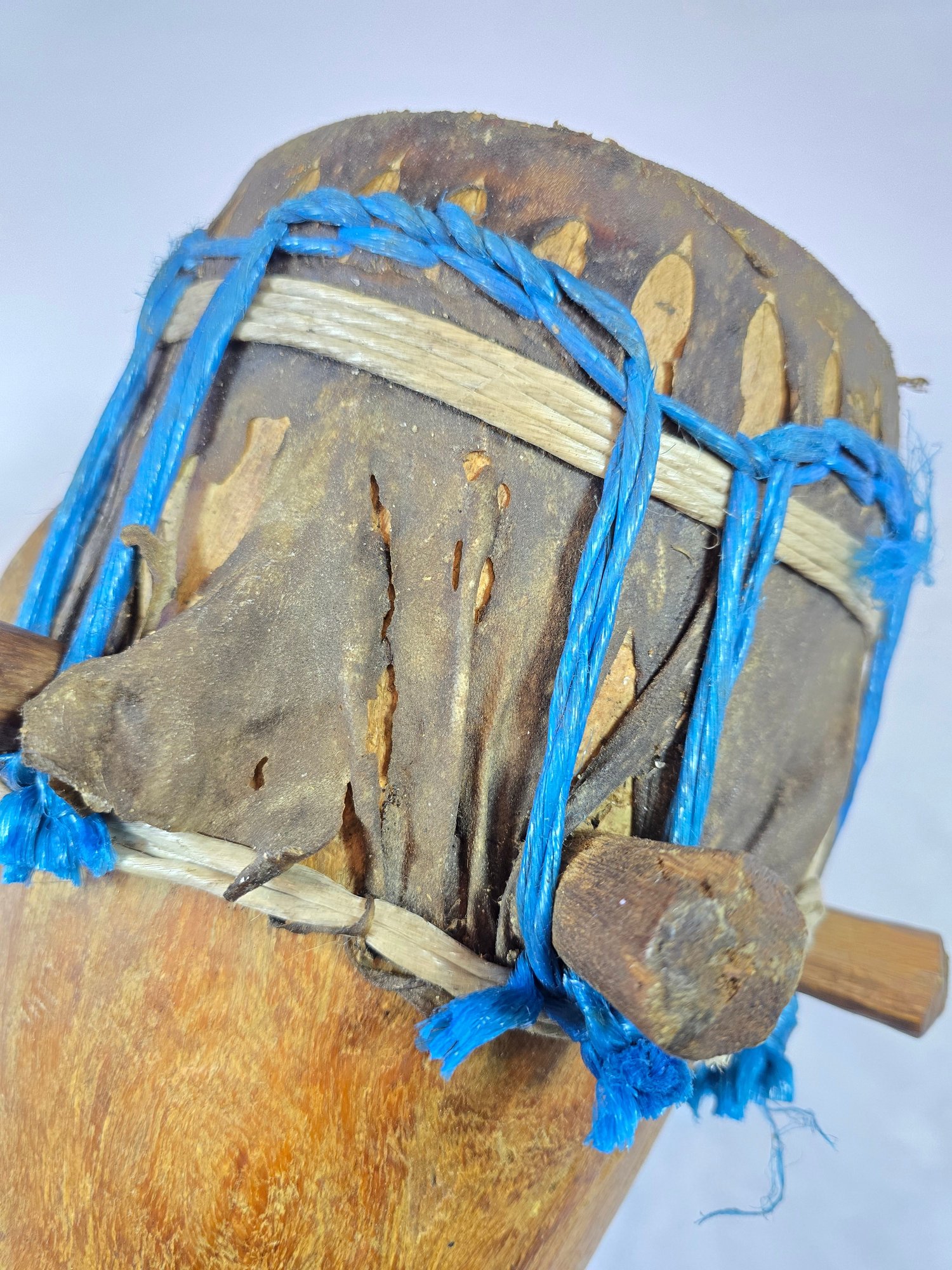 The drum head is made of goatskin, held in place by pegs and cordage.