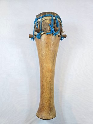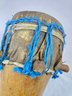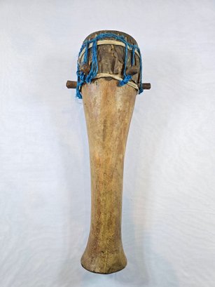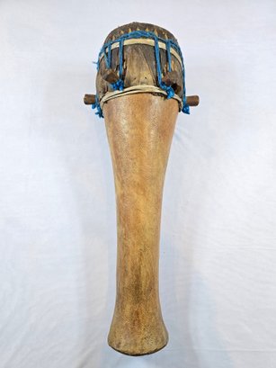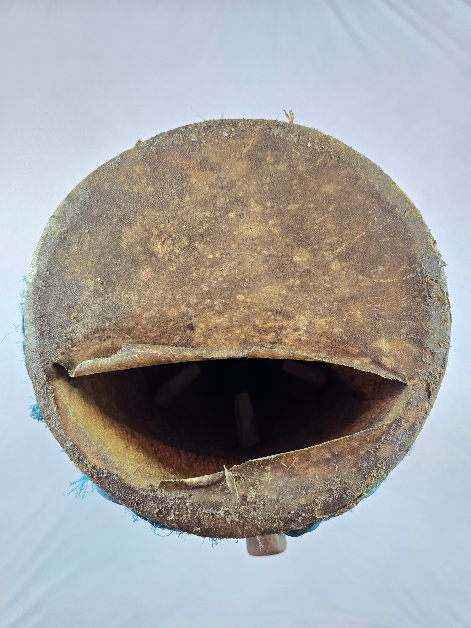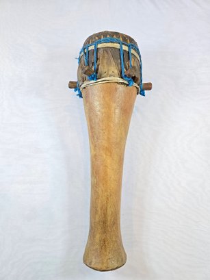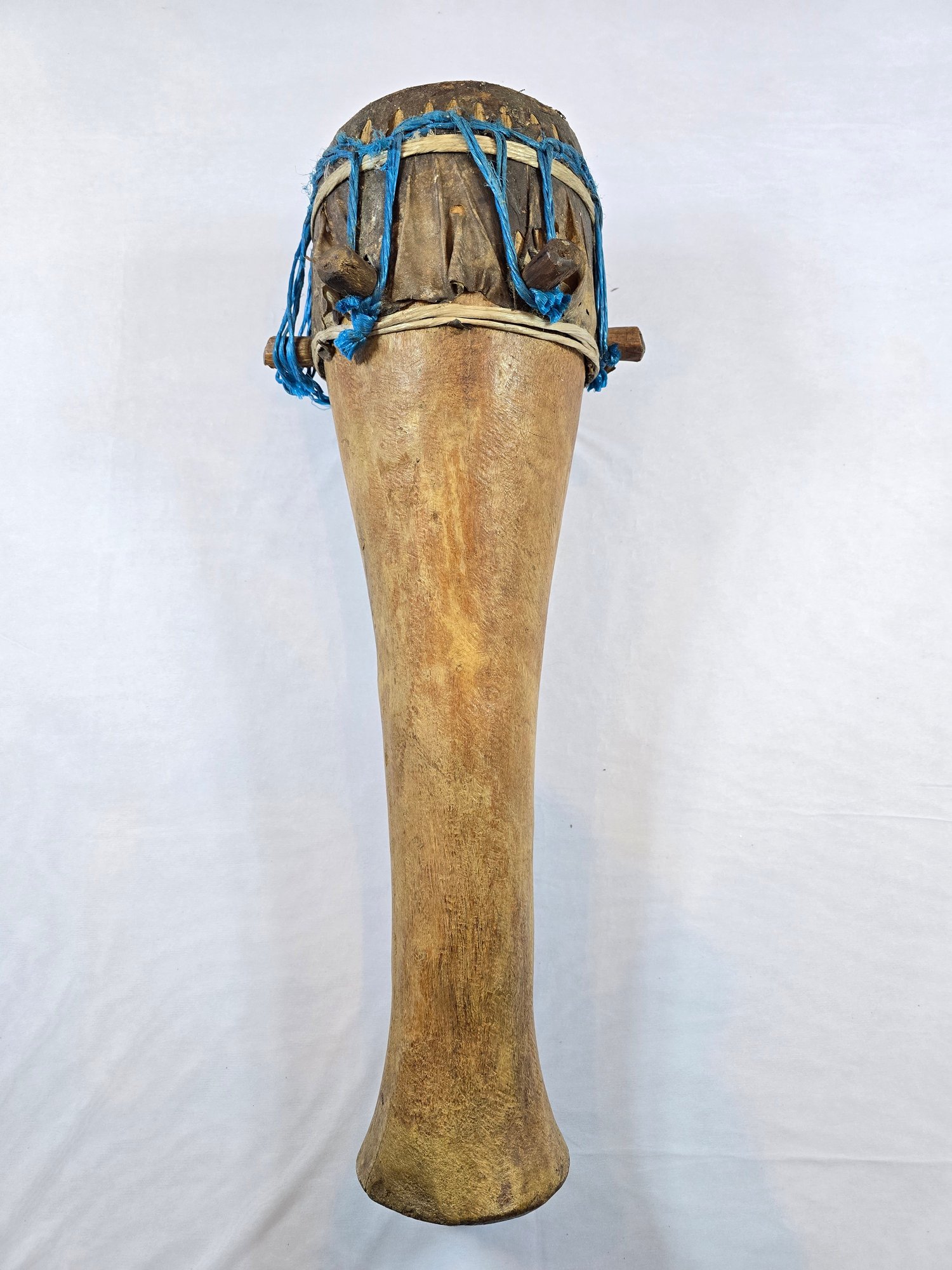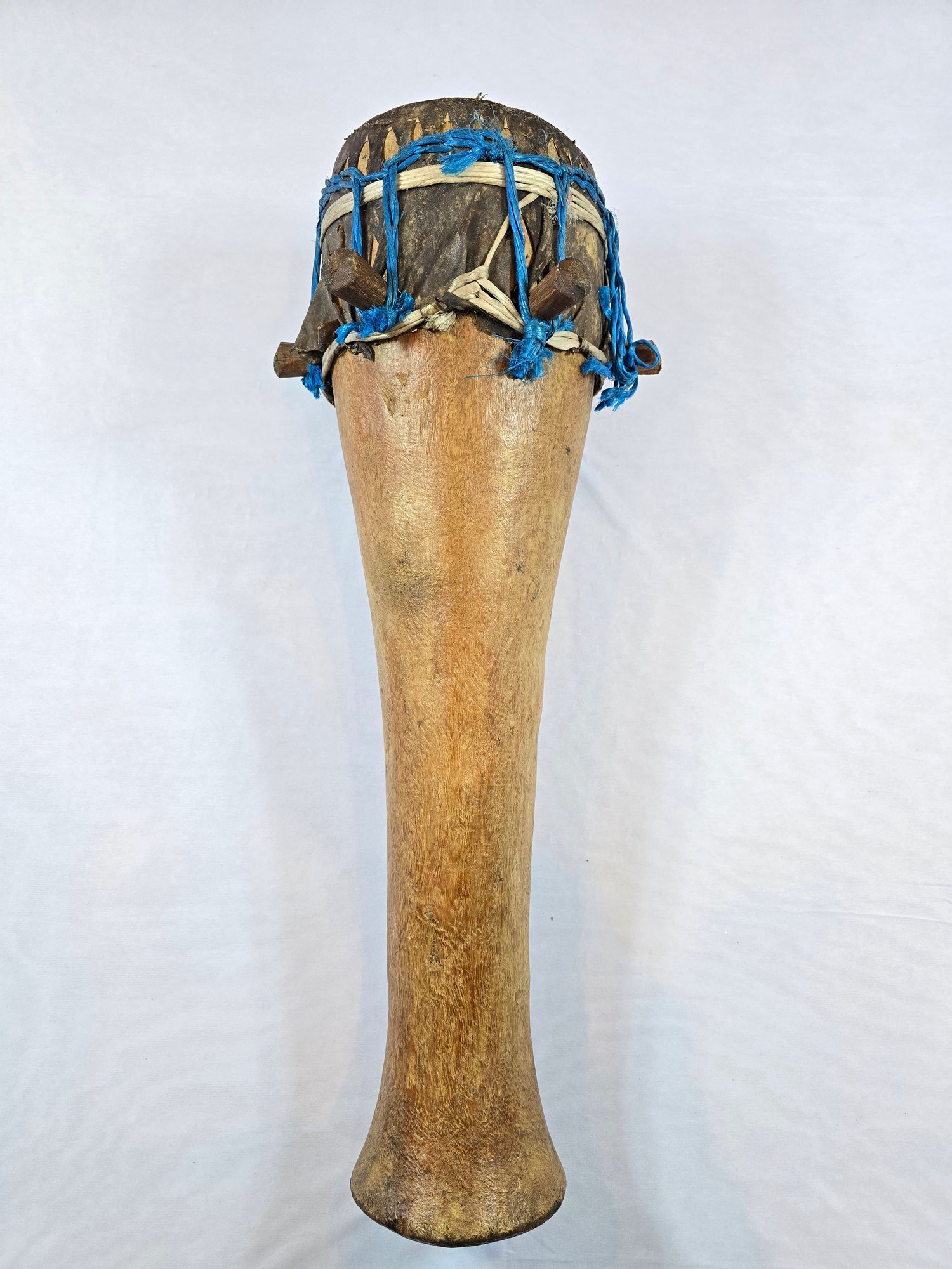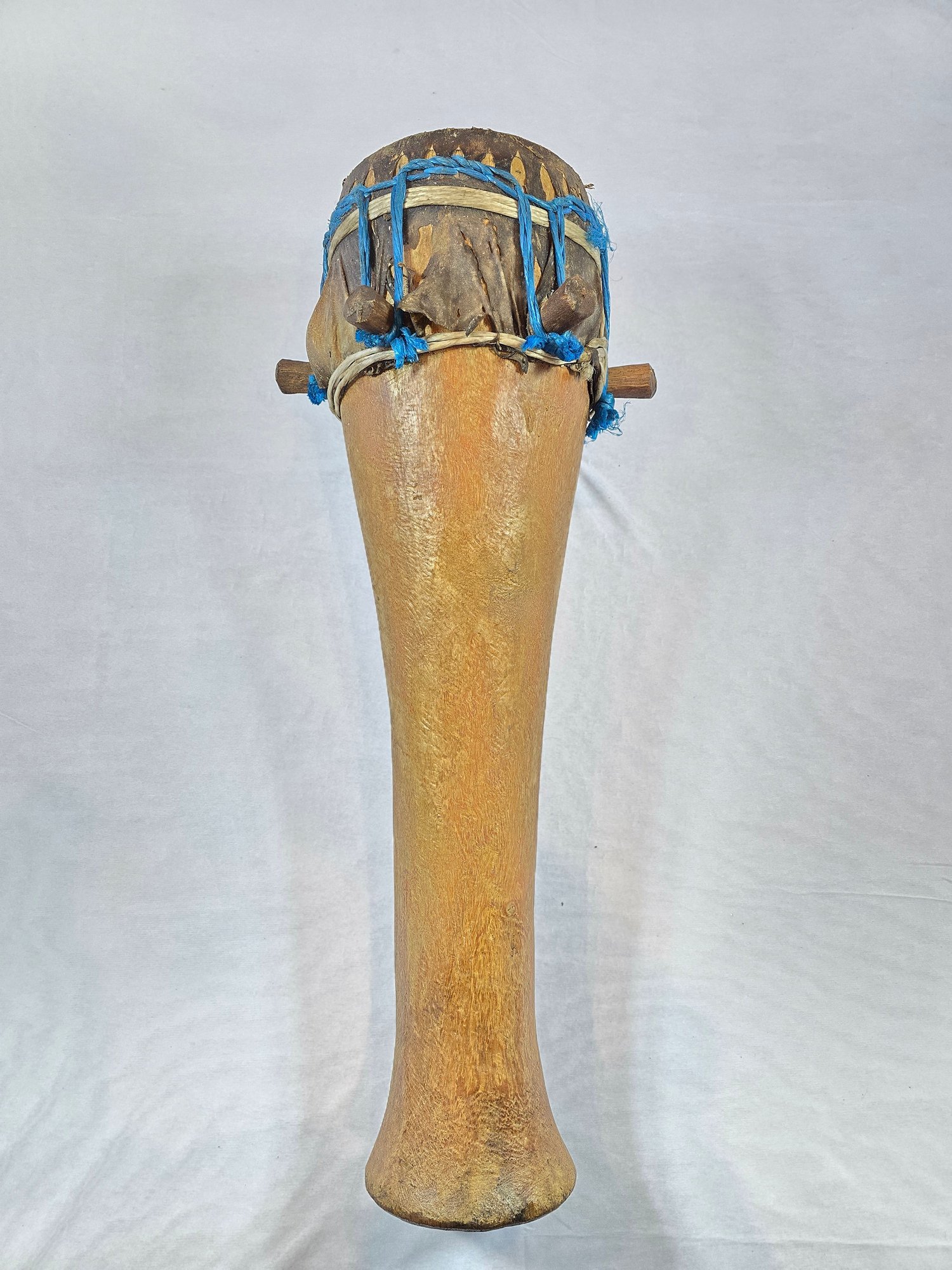 The drum head is made of goatskin, held in place by pegs and cordage.