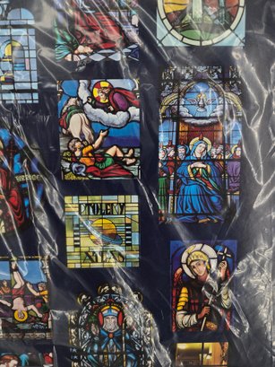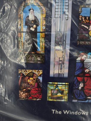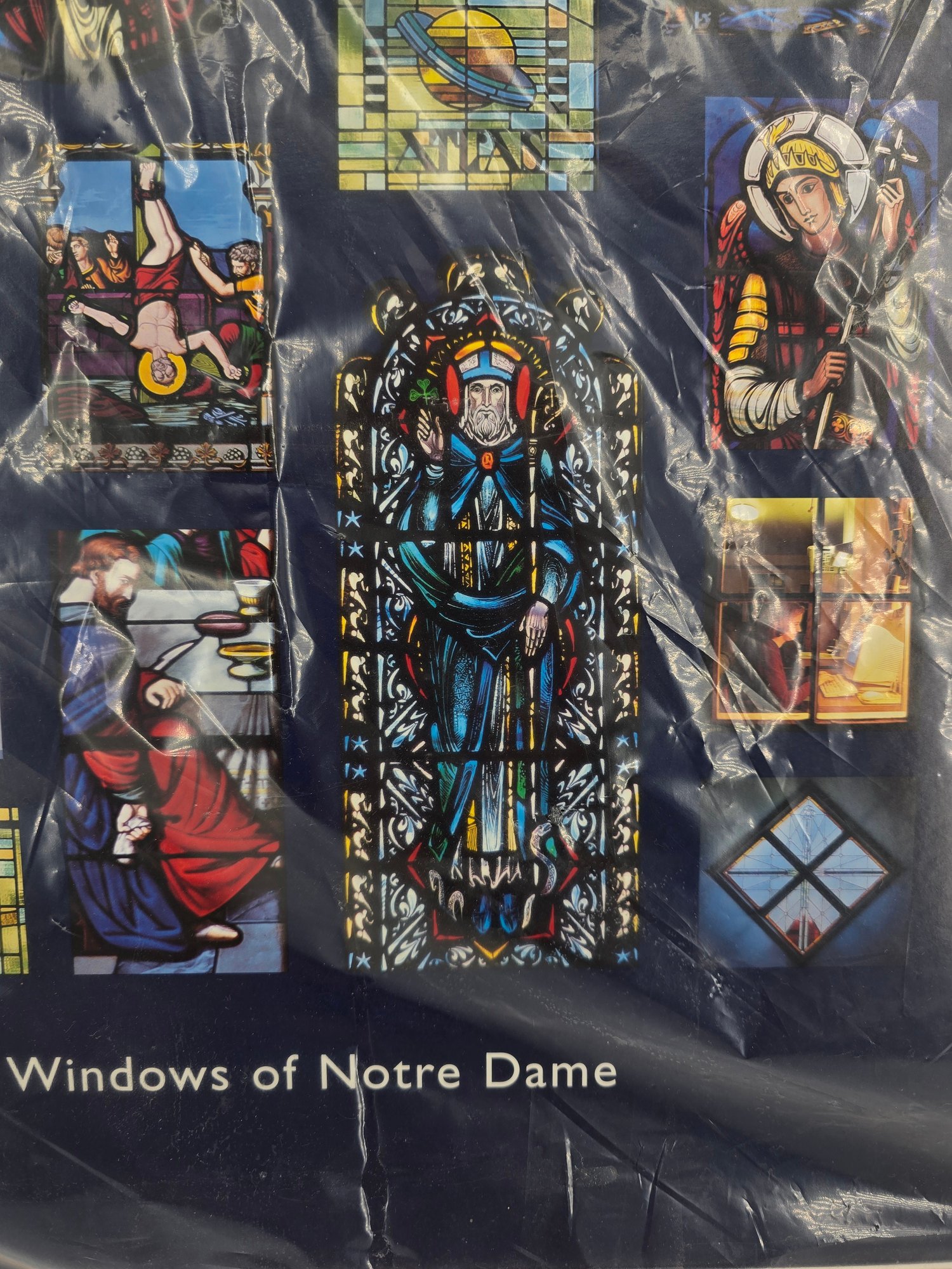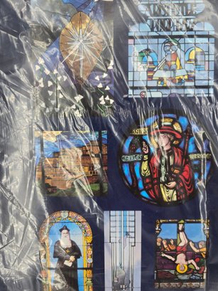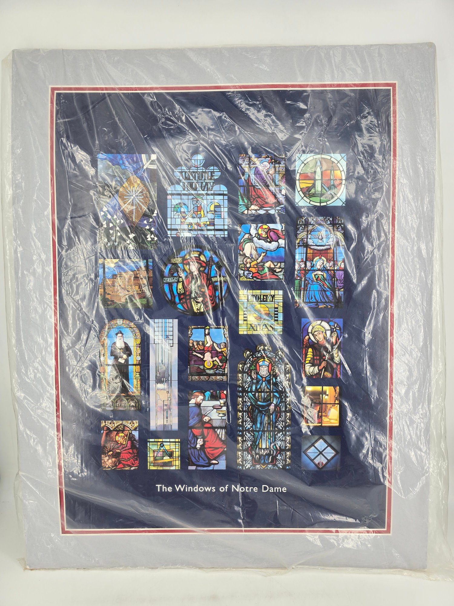 vintage art print depicting a collage of stained-glass windows from Notre Dame Cathedral. A collection of 15 distinct stained-glass panels, each showing a different religious scene or figure. The bottom center text reads, "The Windows of Notre Dame." The artwork is sealed in protective plastic packaging. 22" x 28" no shipping on this item.