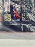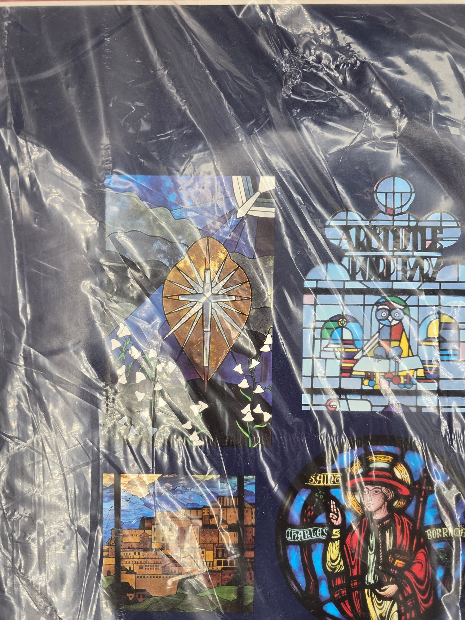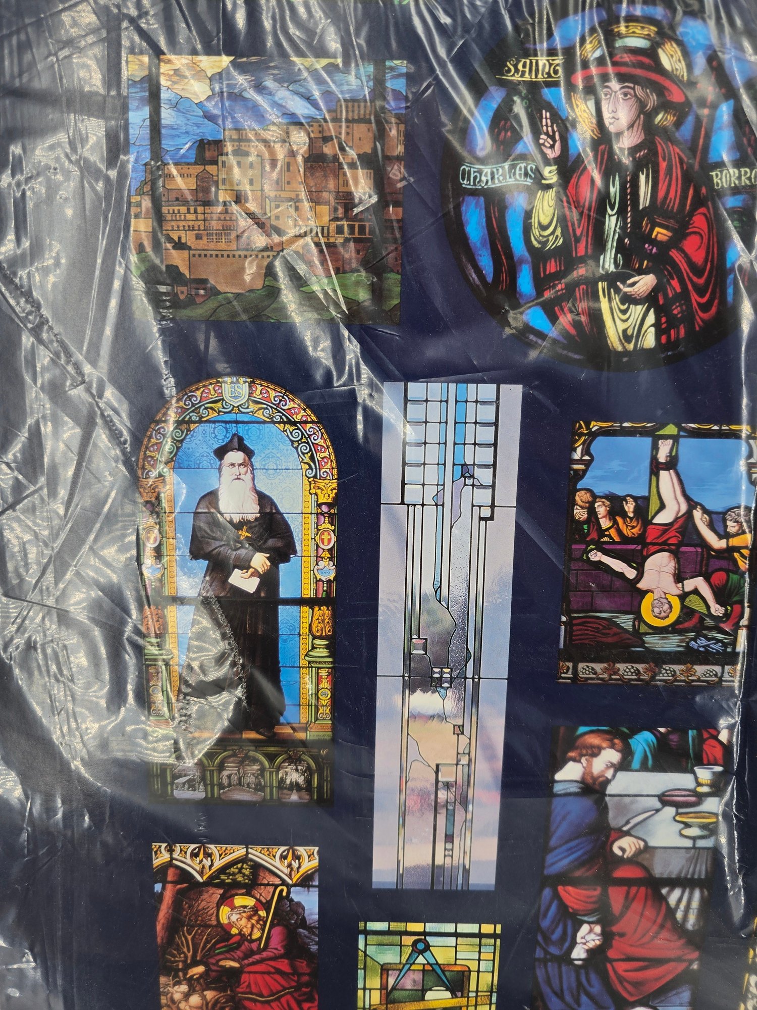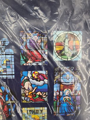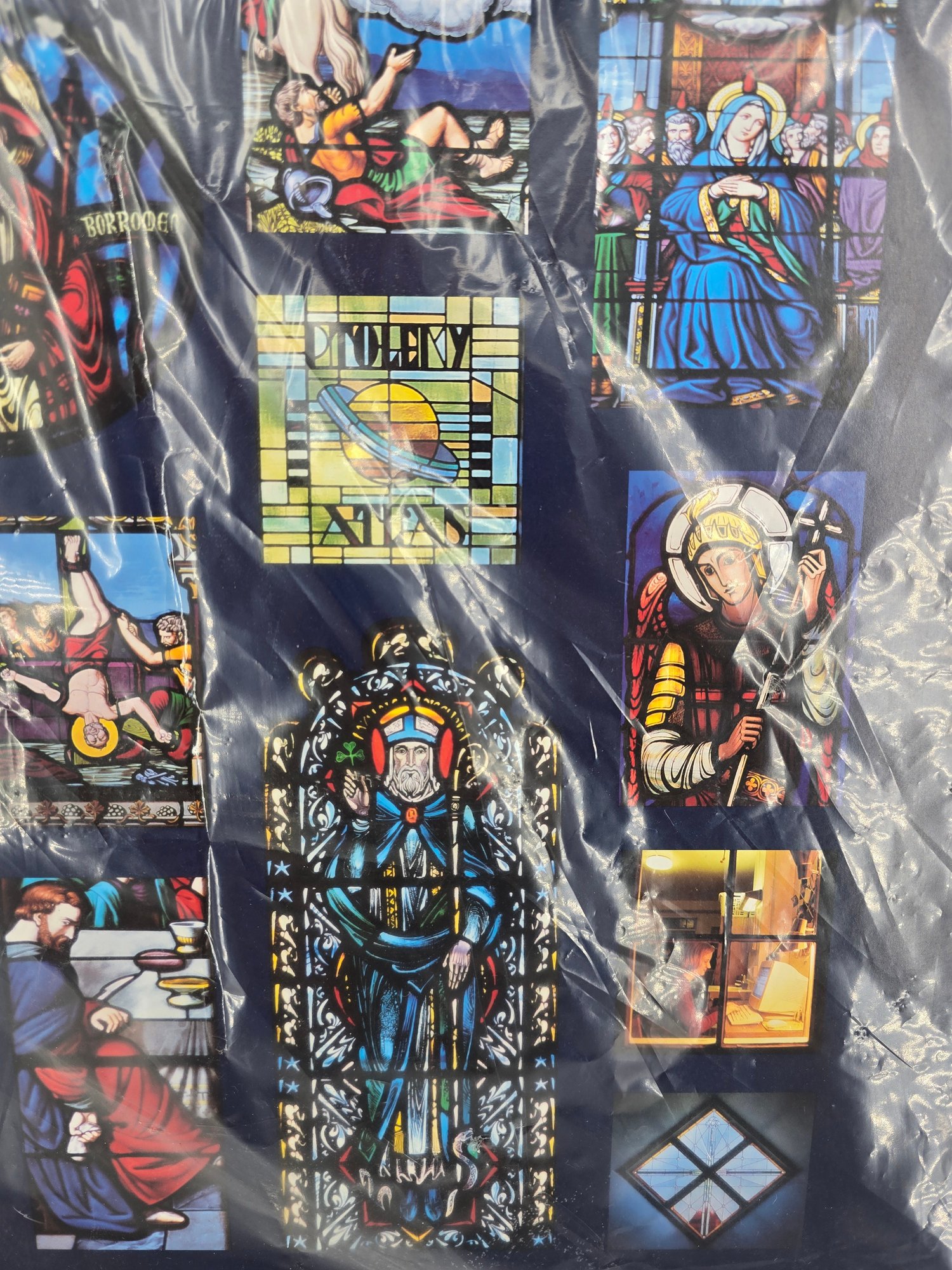 vintage art print depicting a collage of stained-glass windows from Notre Dame Cathedral. A collection of 15 distinct stained-glass panels, each showing a different religious scene or figure. The bottom center text reads, "The Windows of Notre Dame." The artwork is sealed in protective plastic packaging. 22" x 28" no shipping on this item.