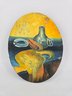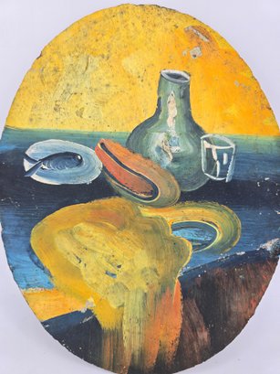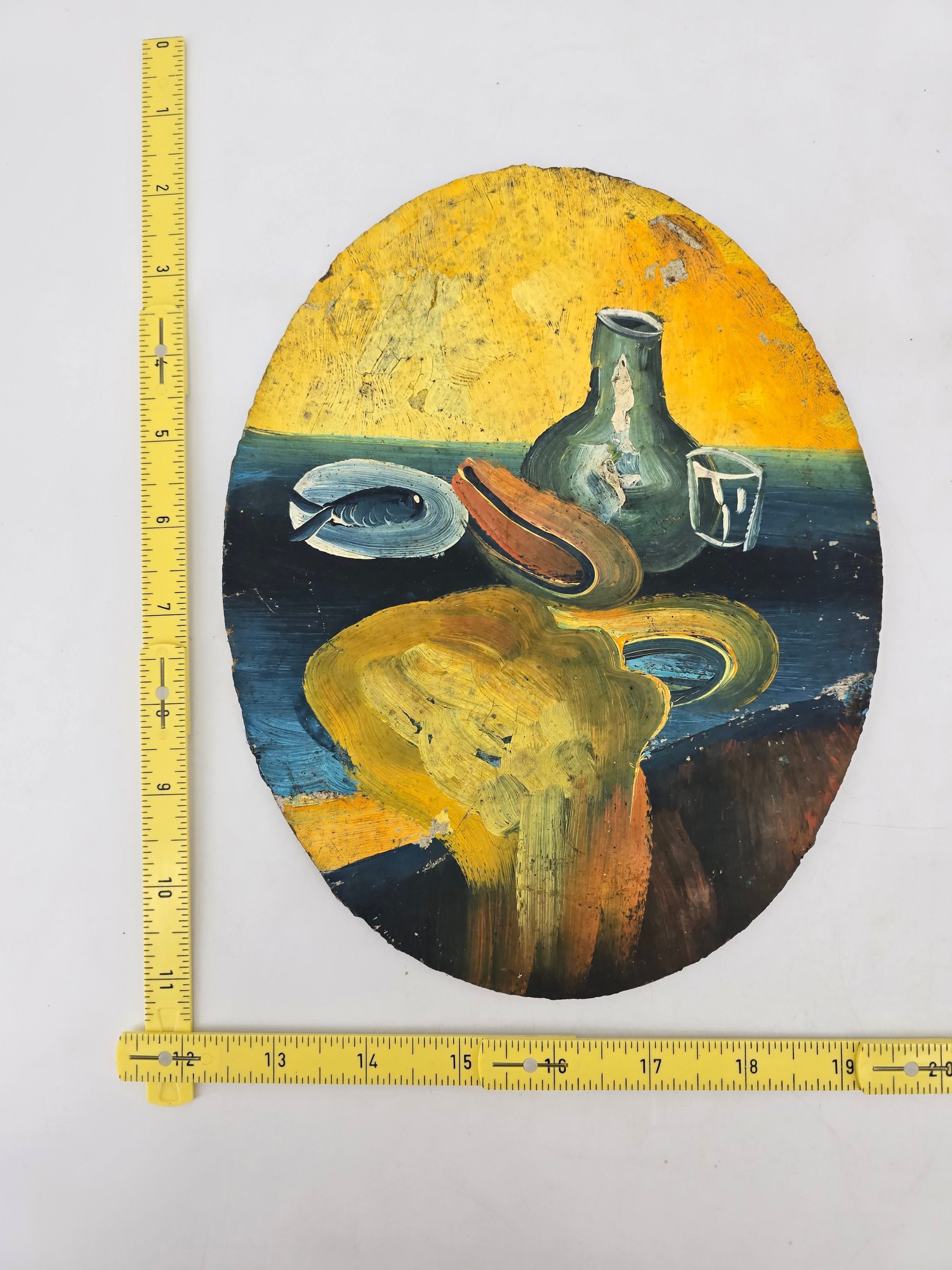This artwork is a still life painting featuring everyday objects like a jug, glass, and fish on a plate, with what appears to be a mess pouring over the edge of the table, what do you see? Measures About 9.5" x 7 25" - on board - see Photos.