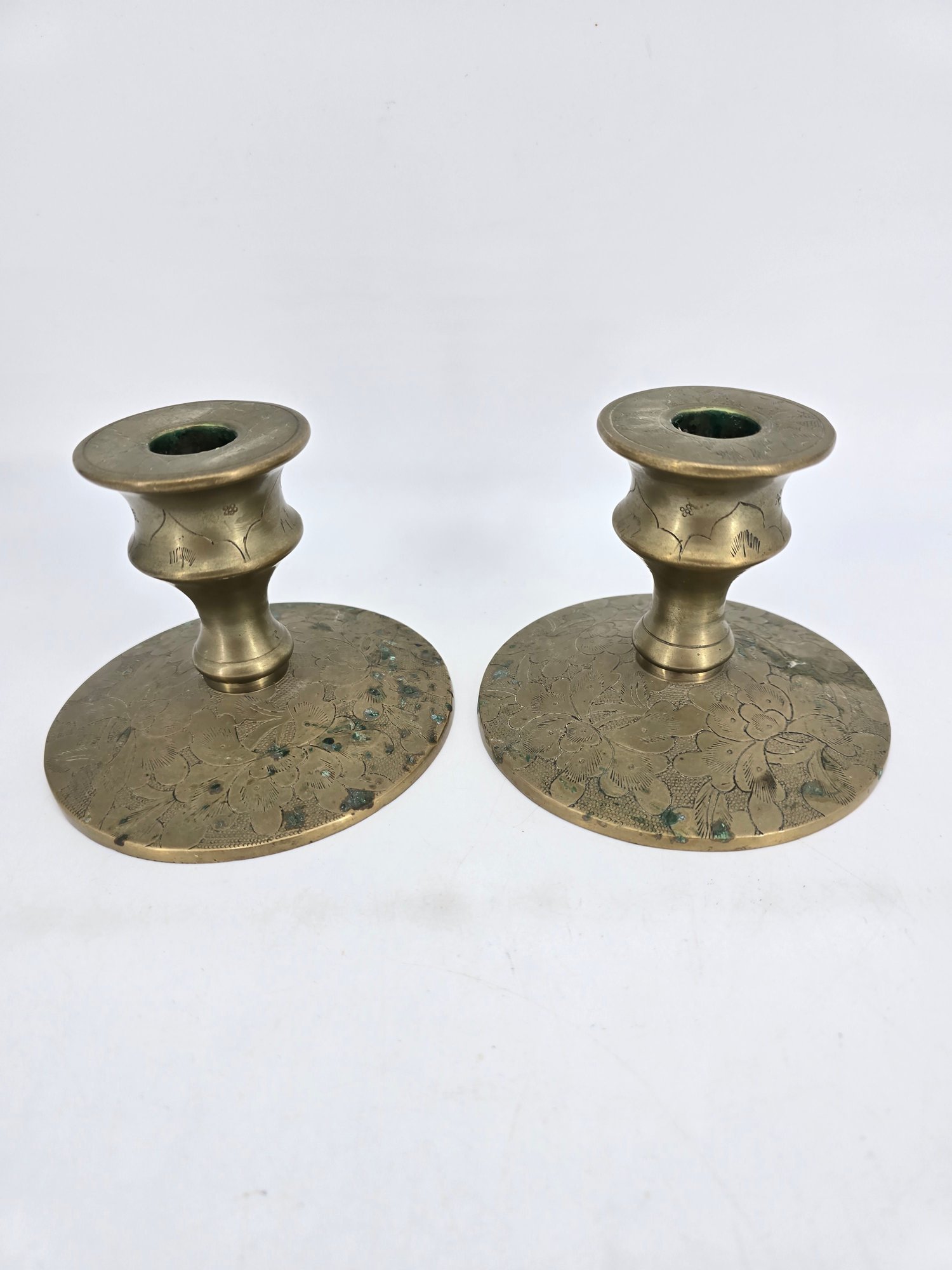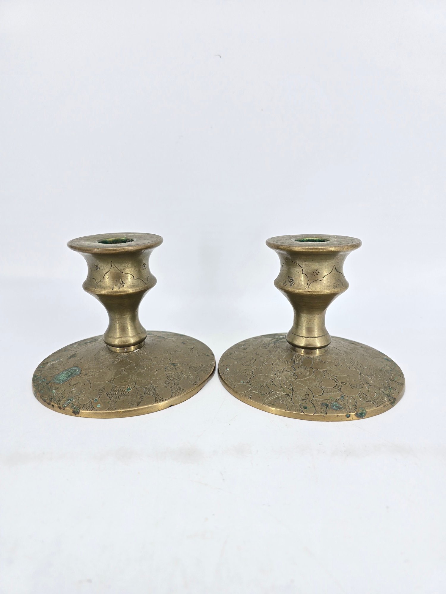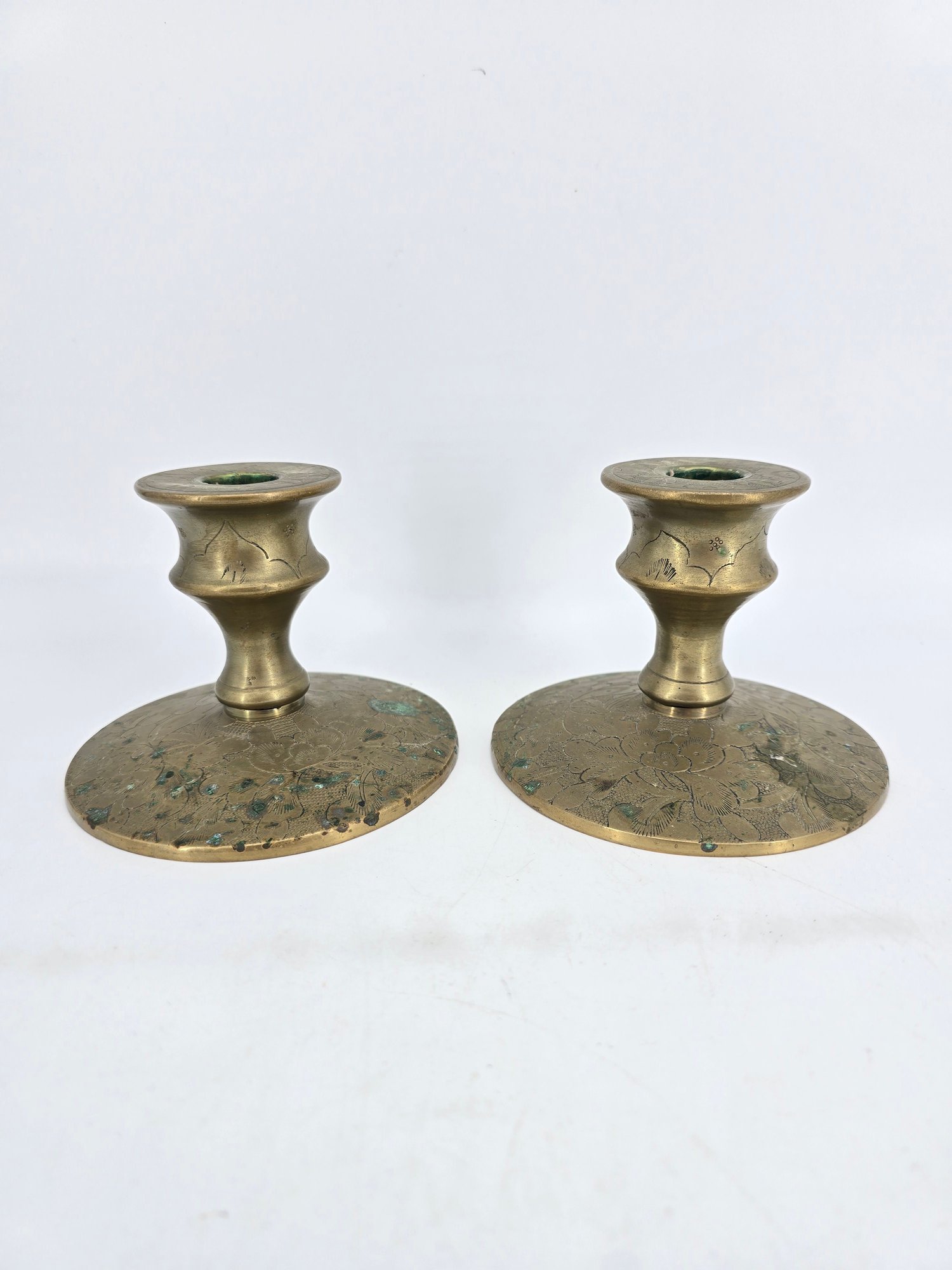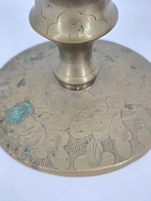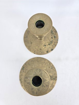 Pair of vintage brass candle holders featuring etched floral and vine patterns.