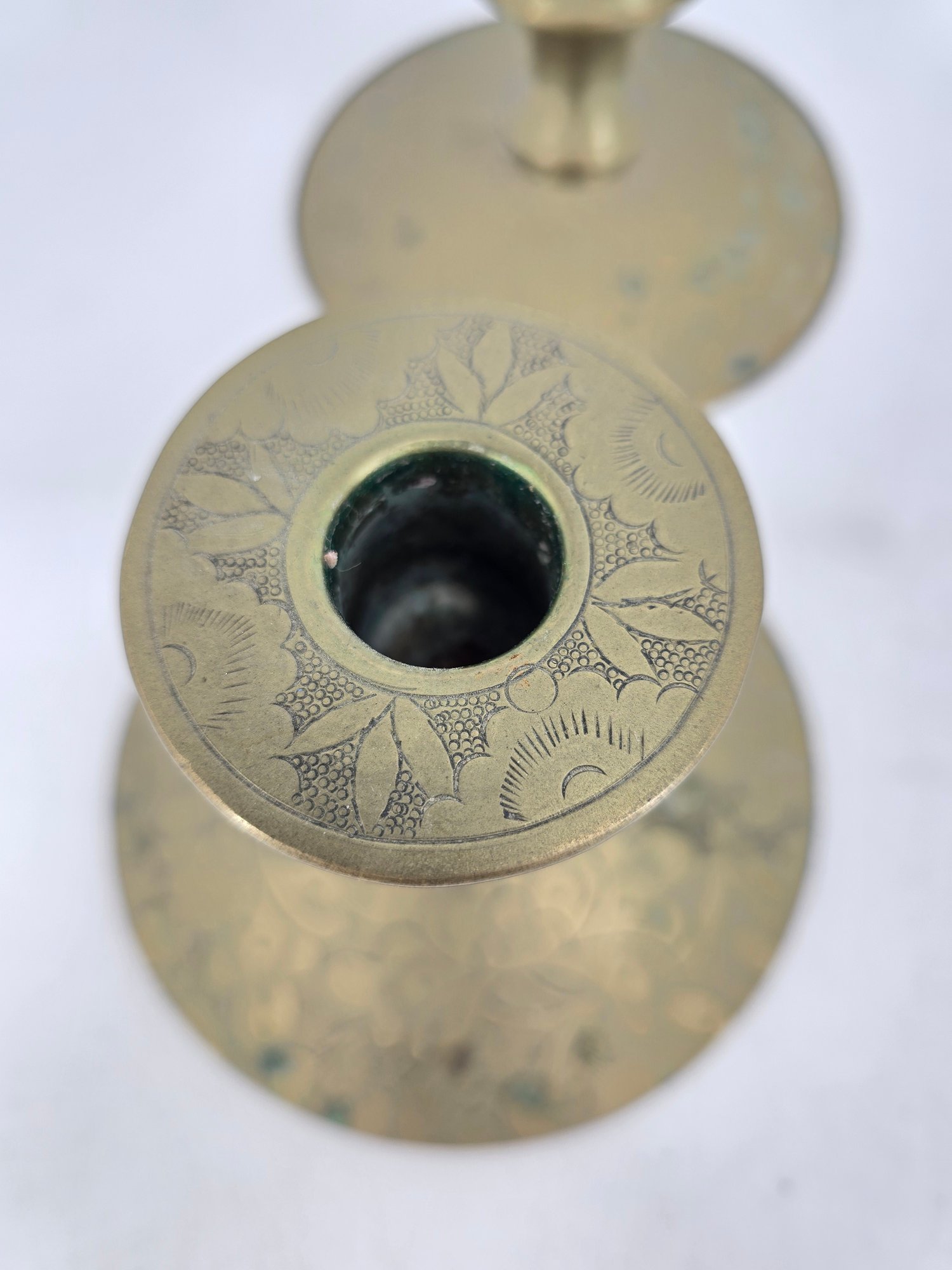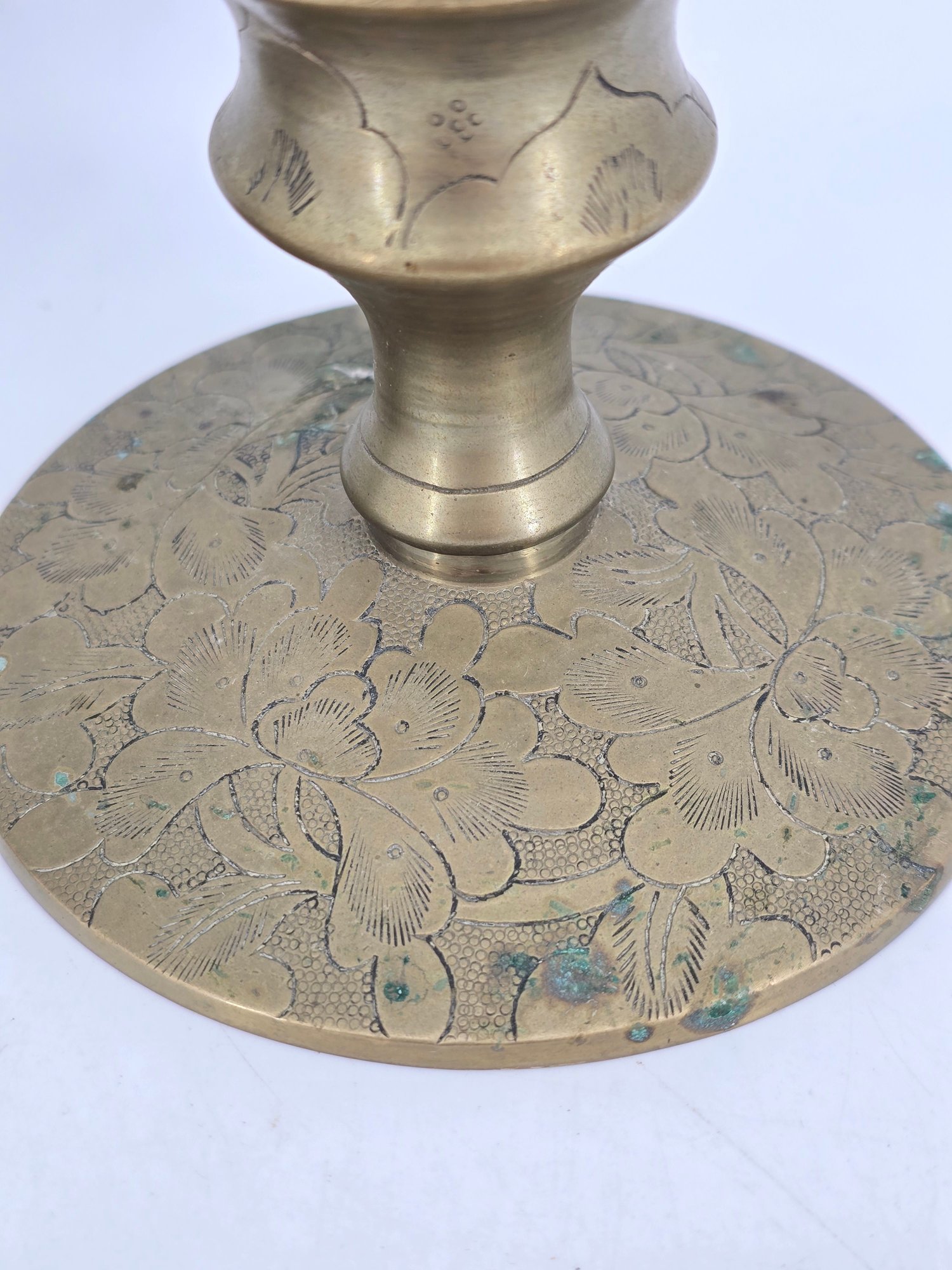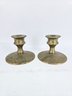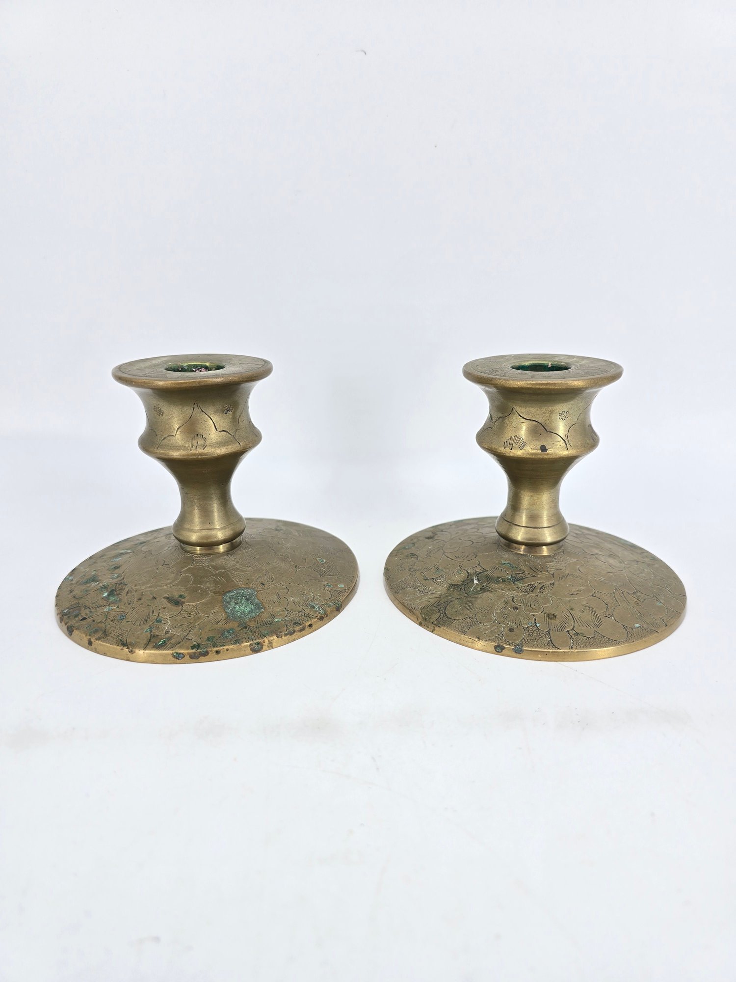Pair of vintage brass candle holders featuring etched floral and vine patterns.