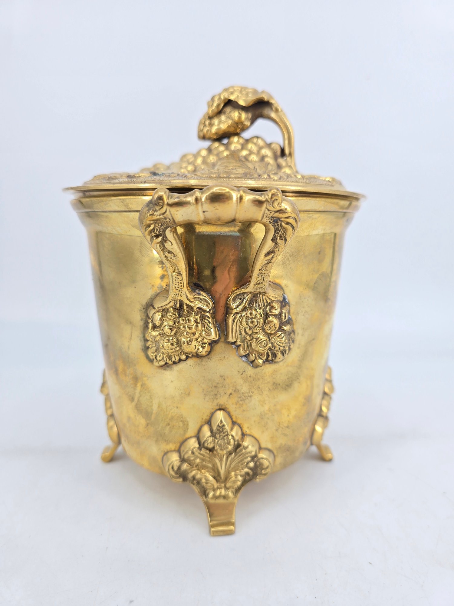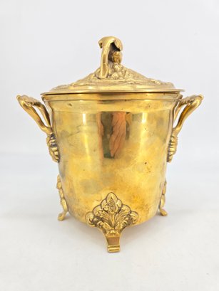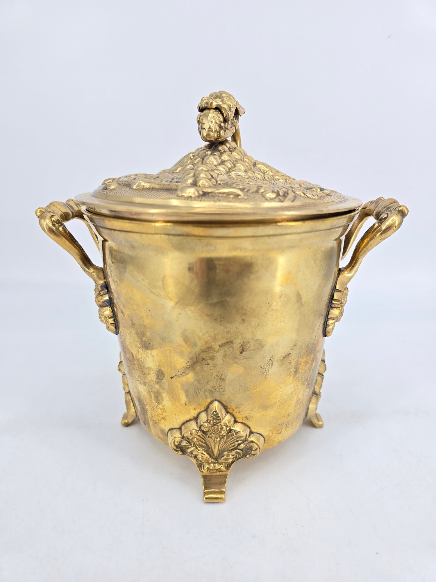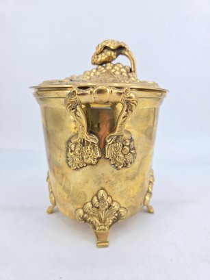 Vintage brass lidded ice bucket or planter with a grapevine motif.