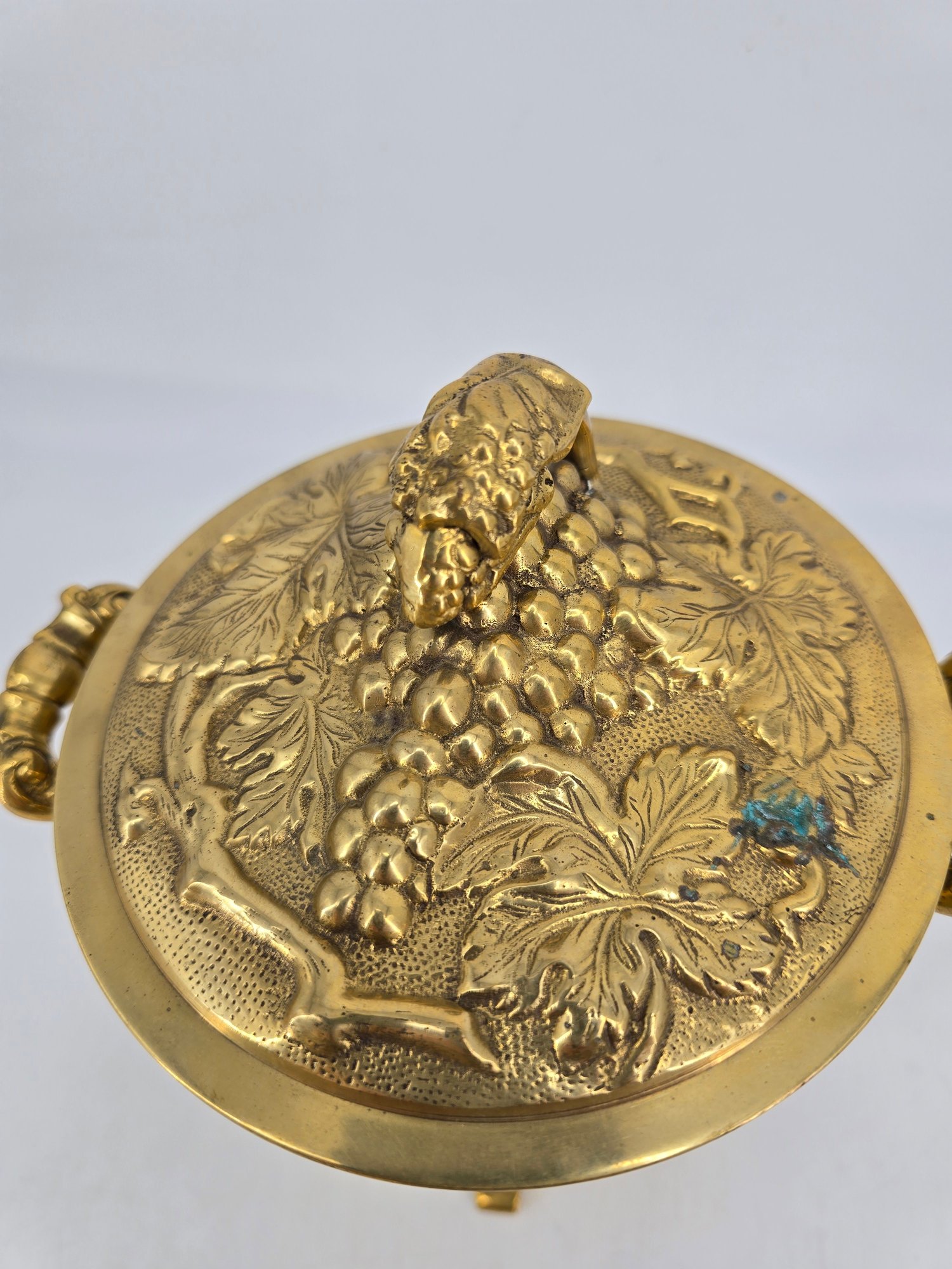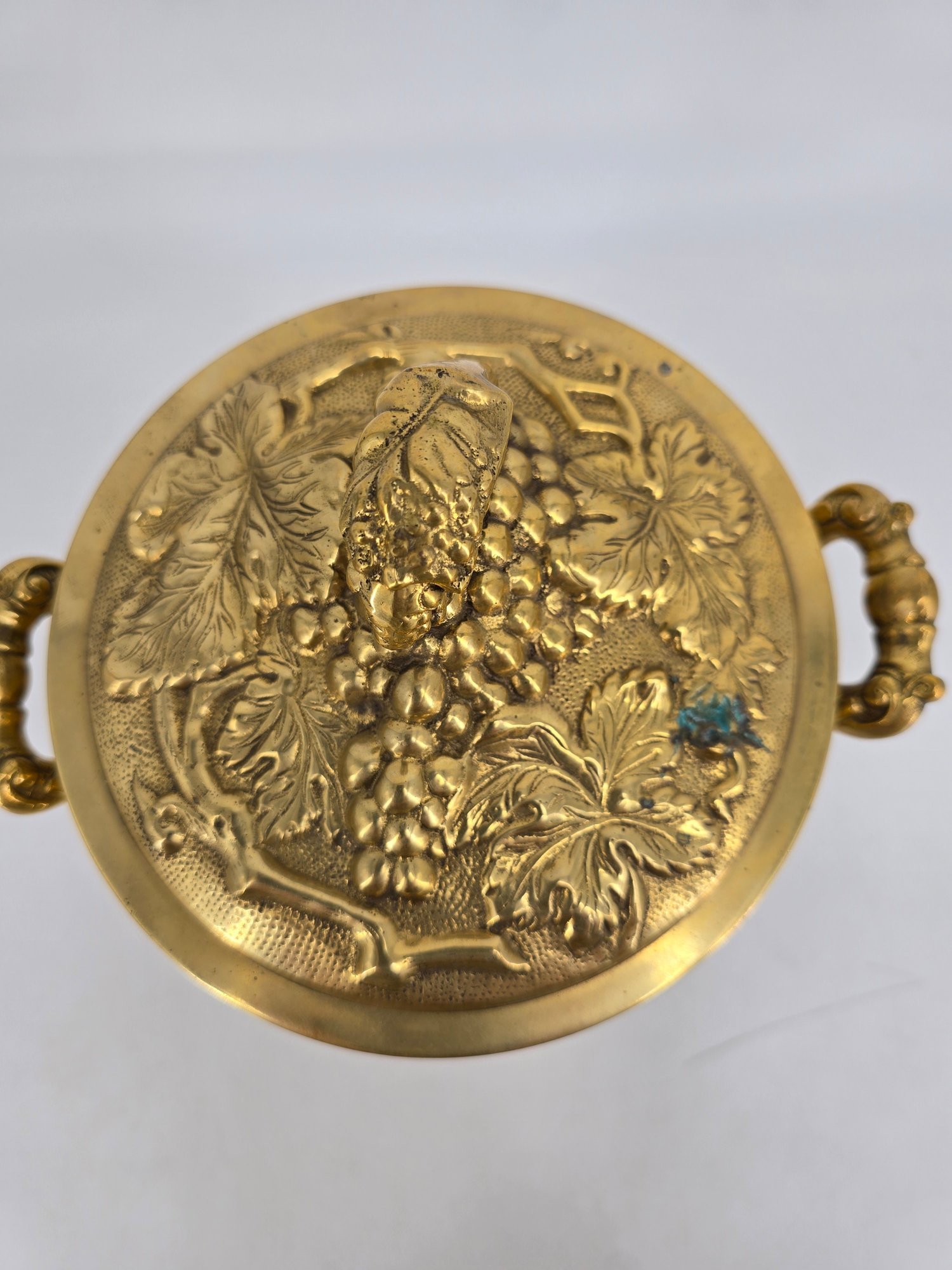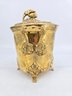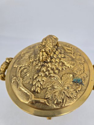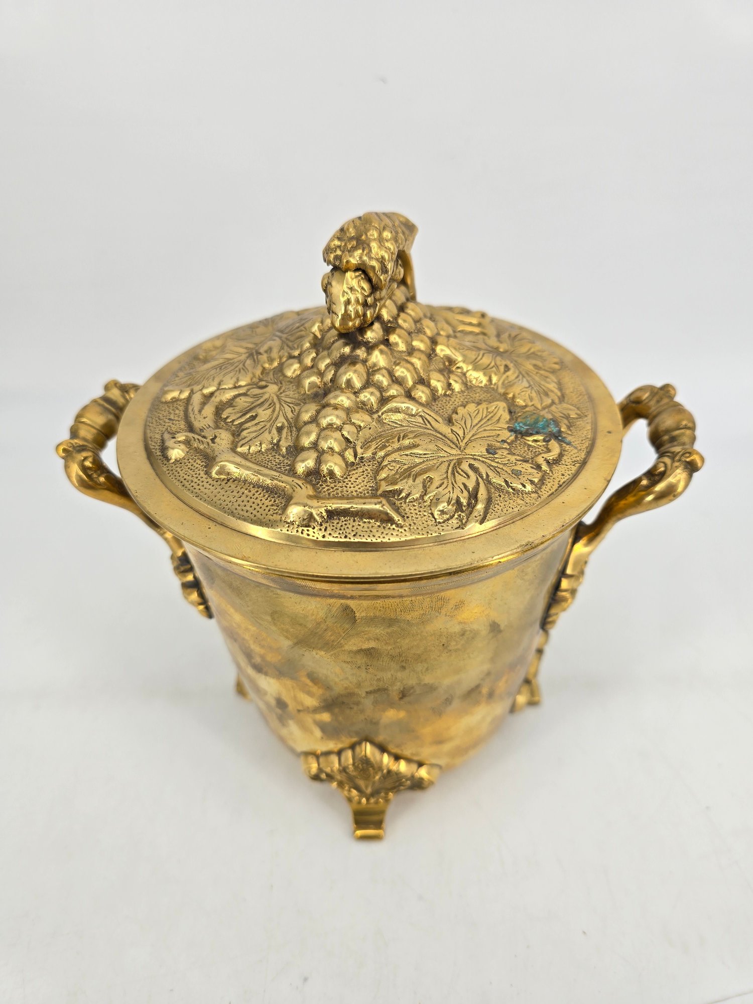 Vintage brass lidded ice bucket or planter with a grapevine motif.