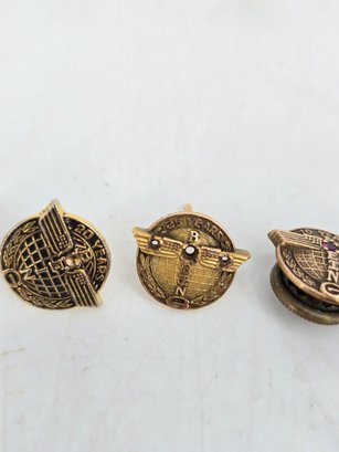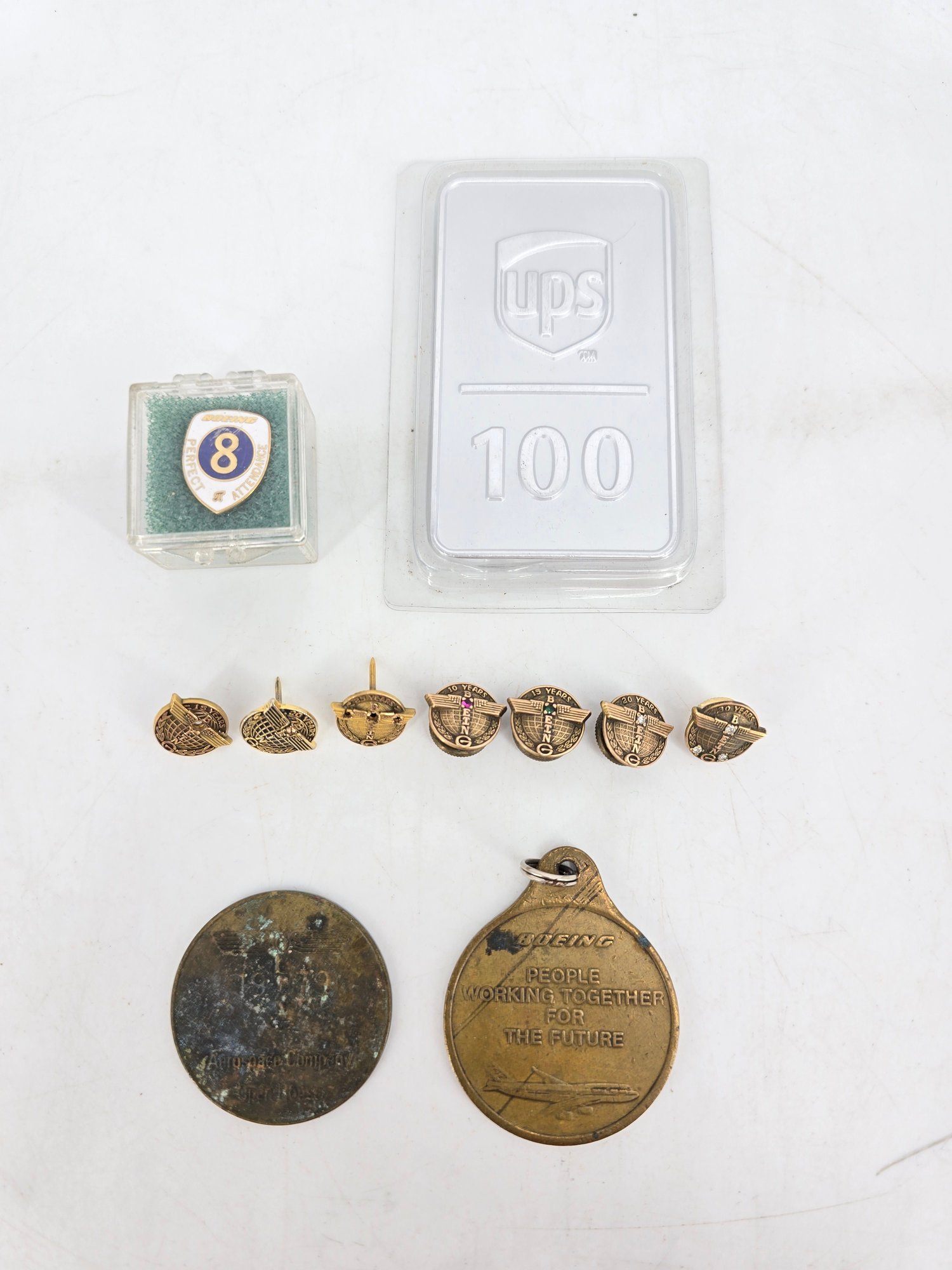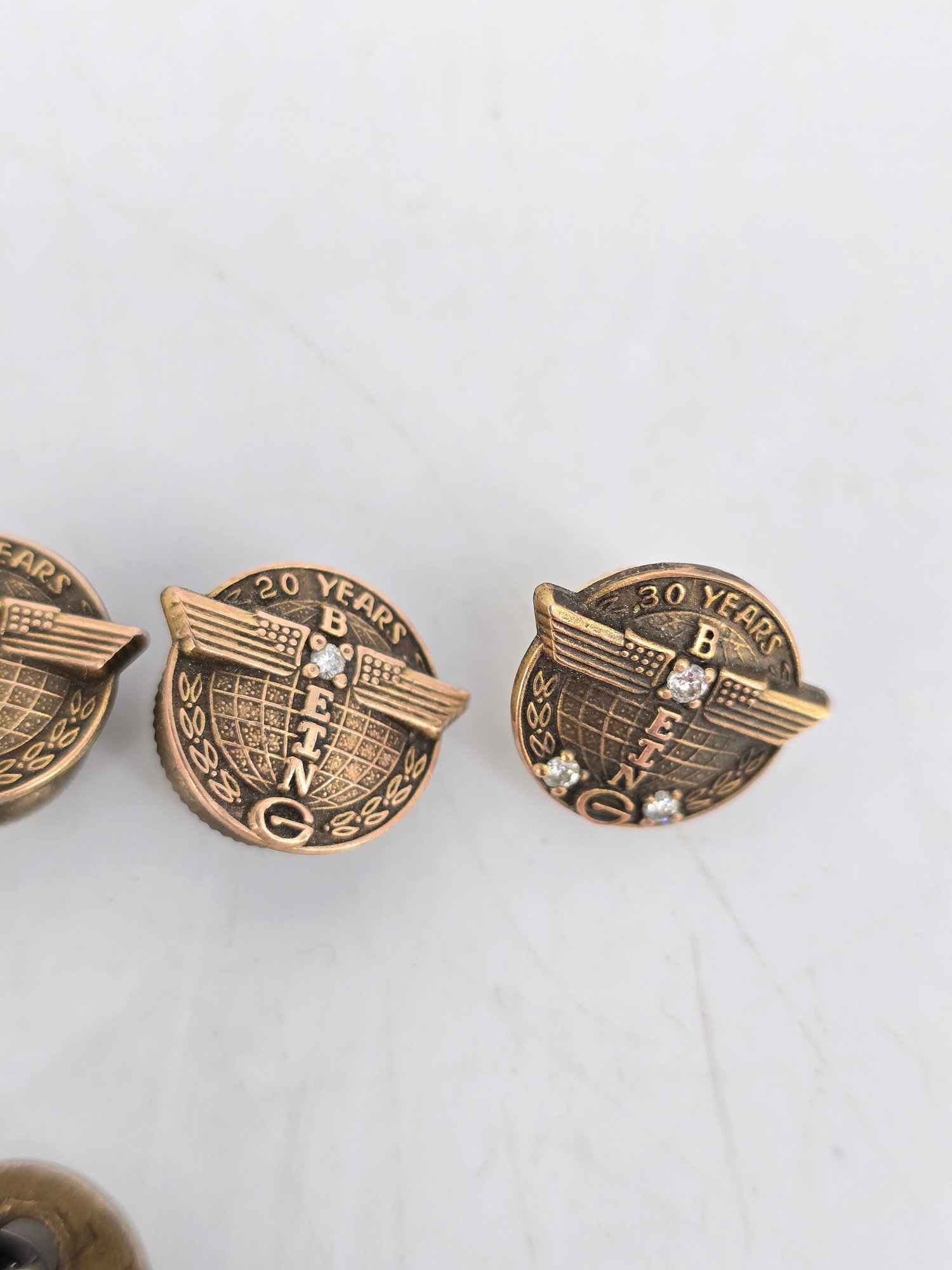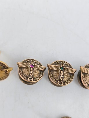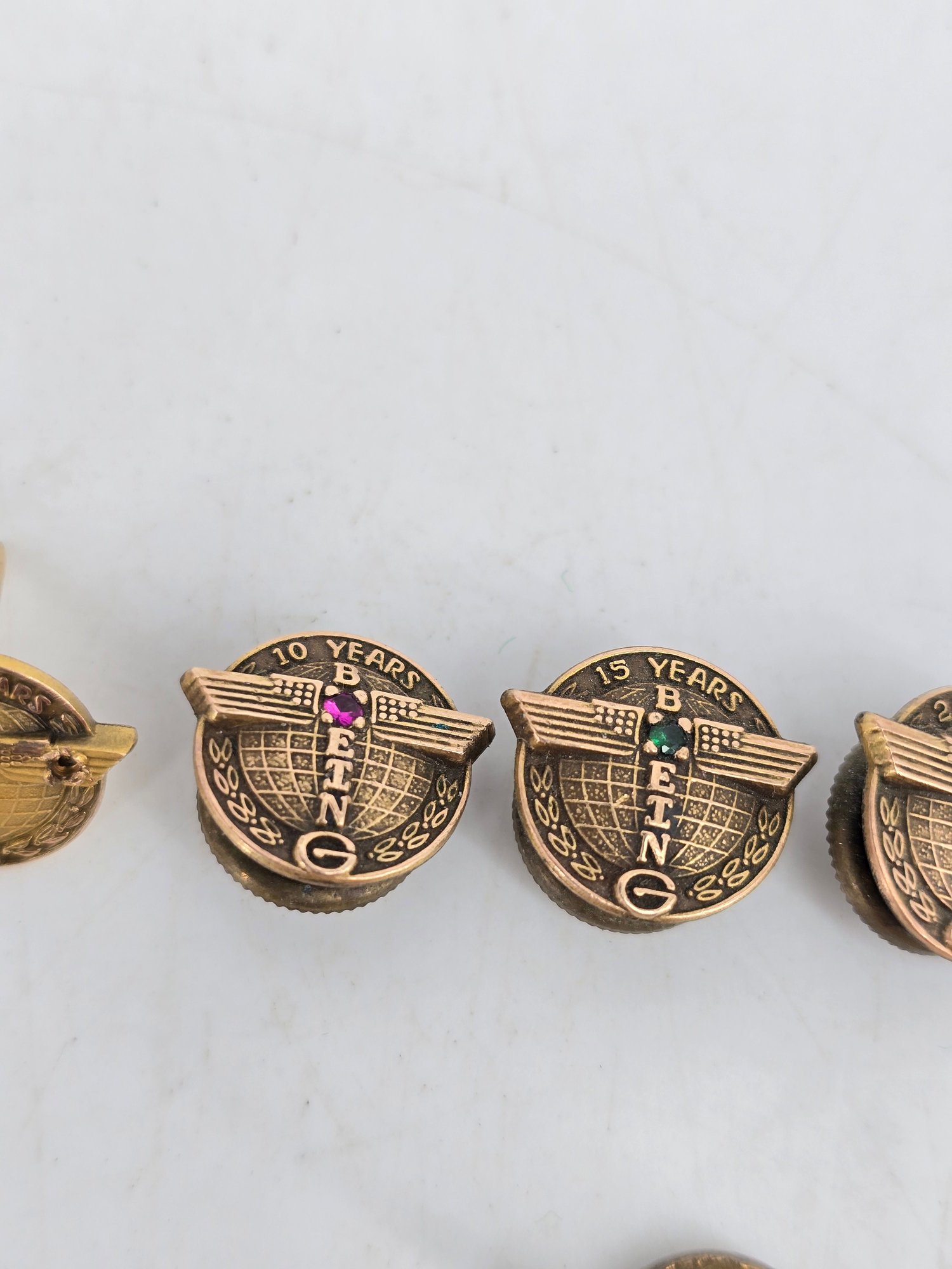 Boeing Service Pins: Several gold-filled 1/10 10k pins indicating different years of service, with some featuring stones and some missing stones, see photos.