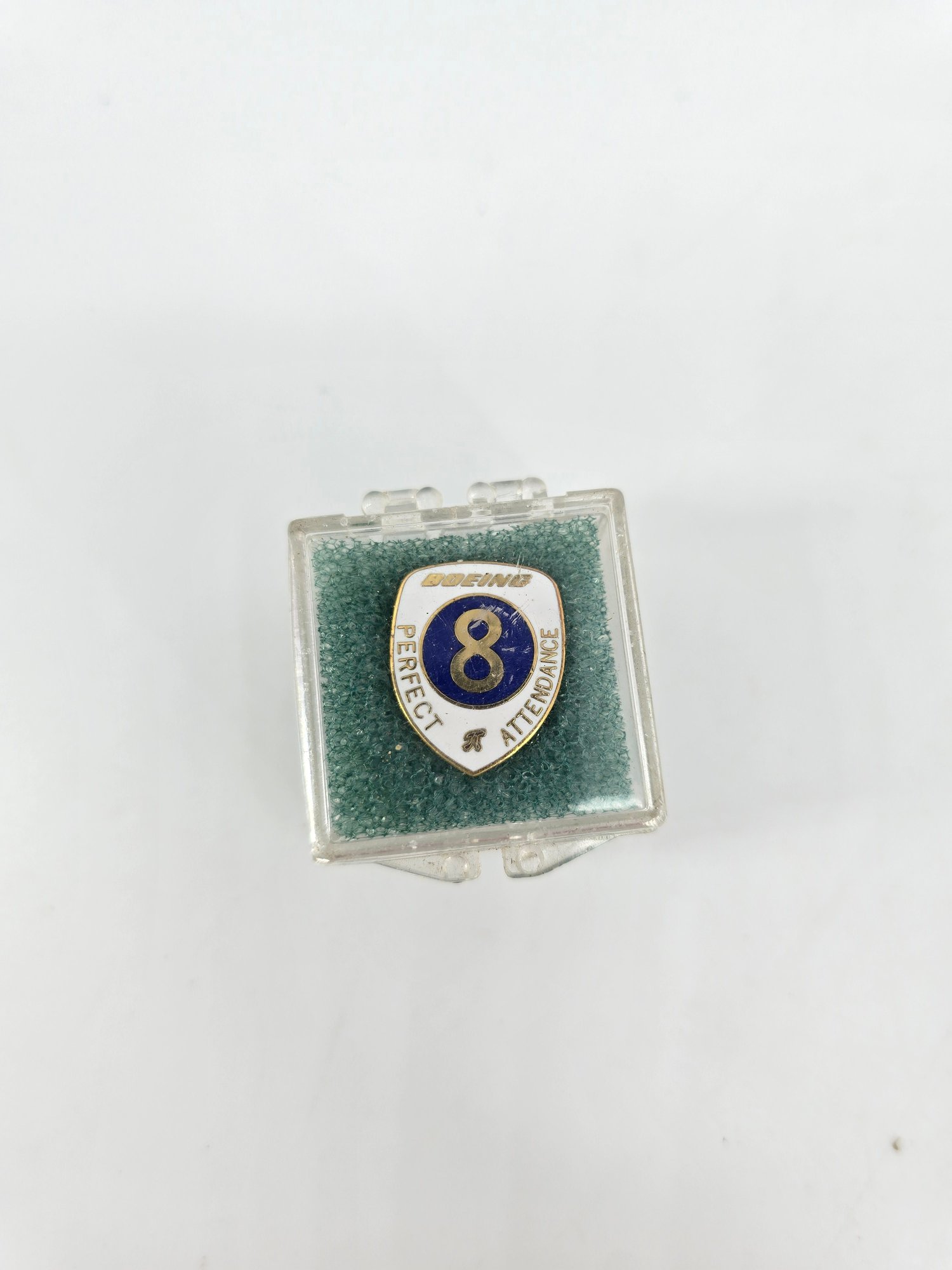 Other Pins: A small "Perfect Attendance" pin numbered "8" in a clear plastic case.