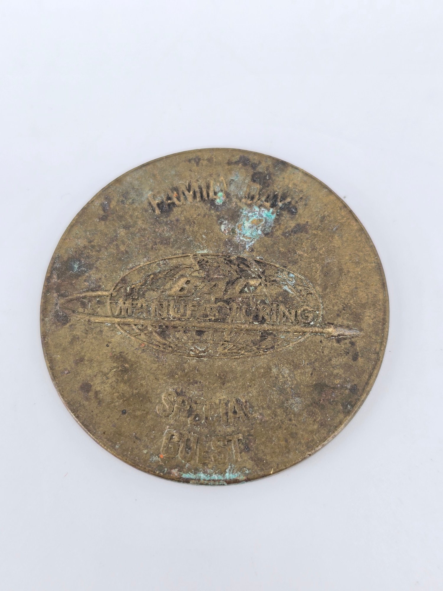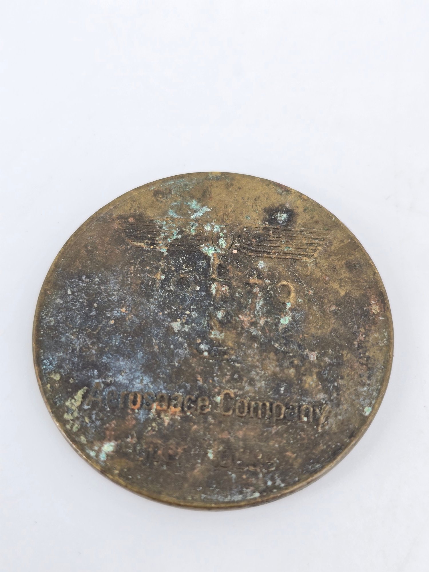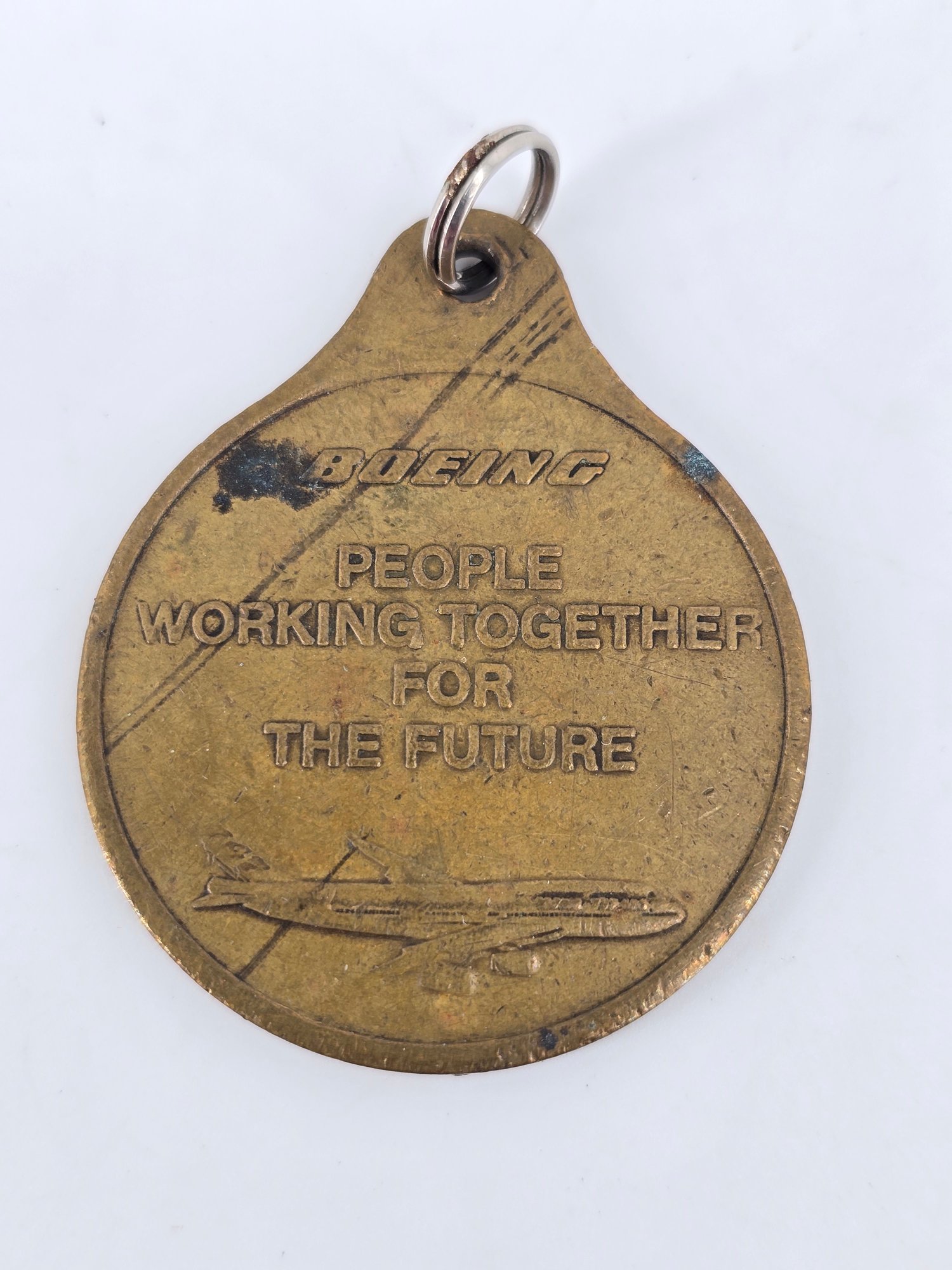 Commemorative Medals: Two bronze-colored medallions featuring the Boeing logo and the motto "People Working Together for the Future".