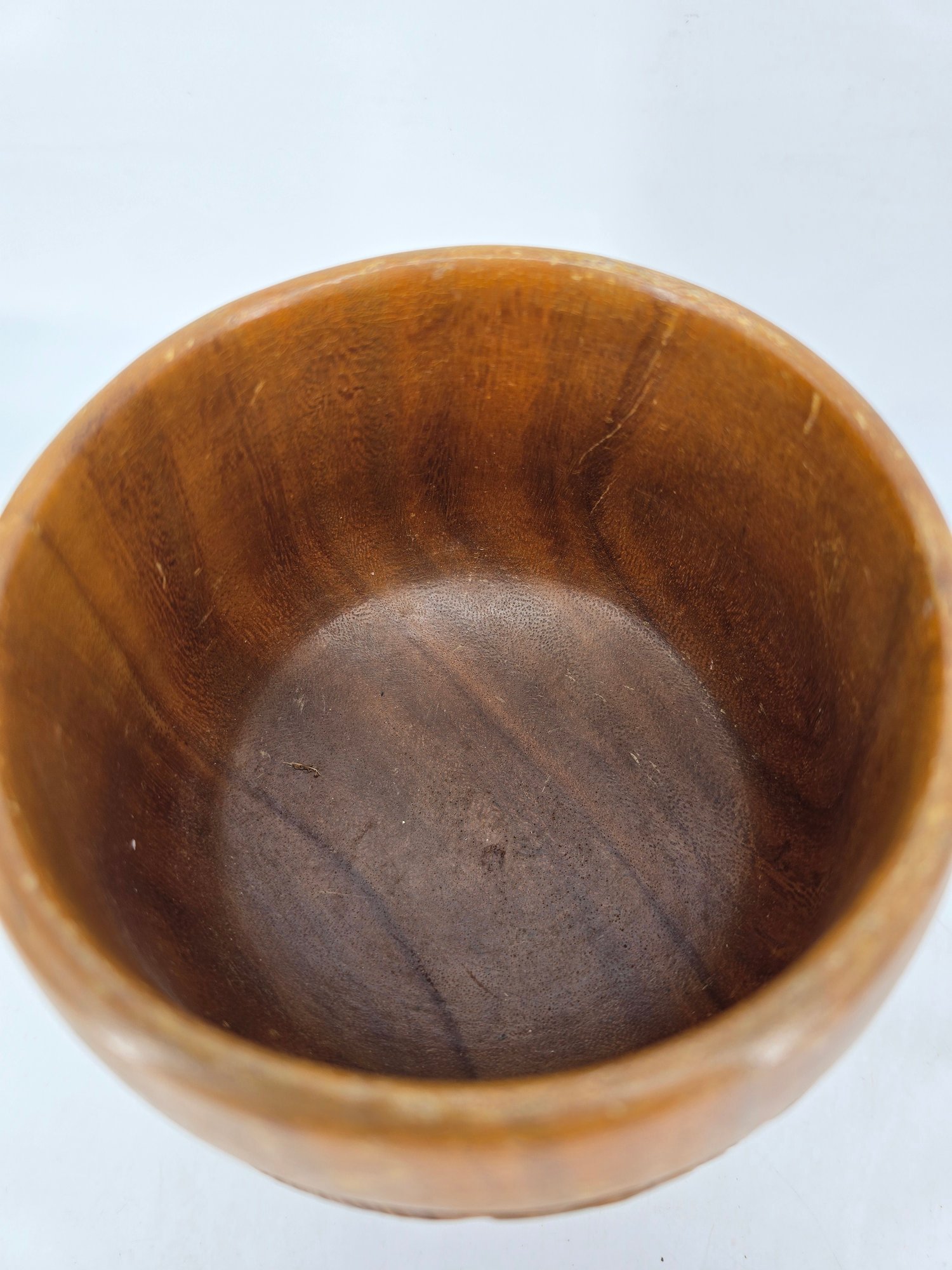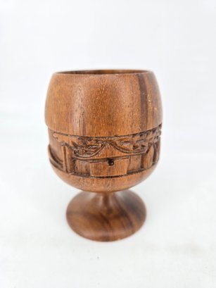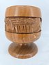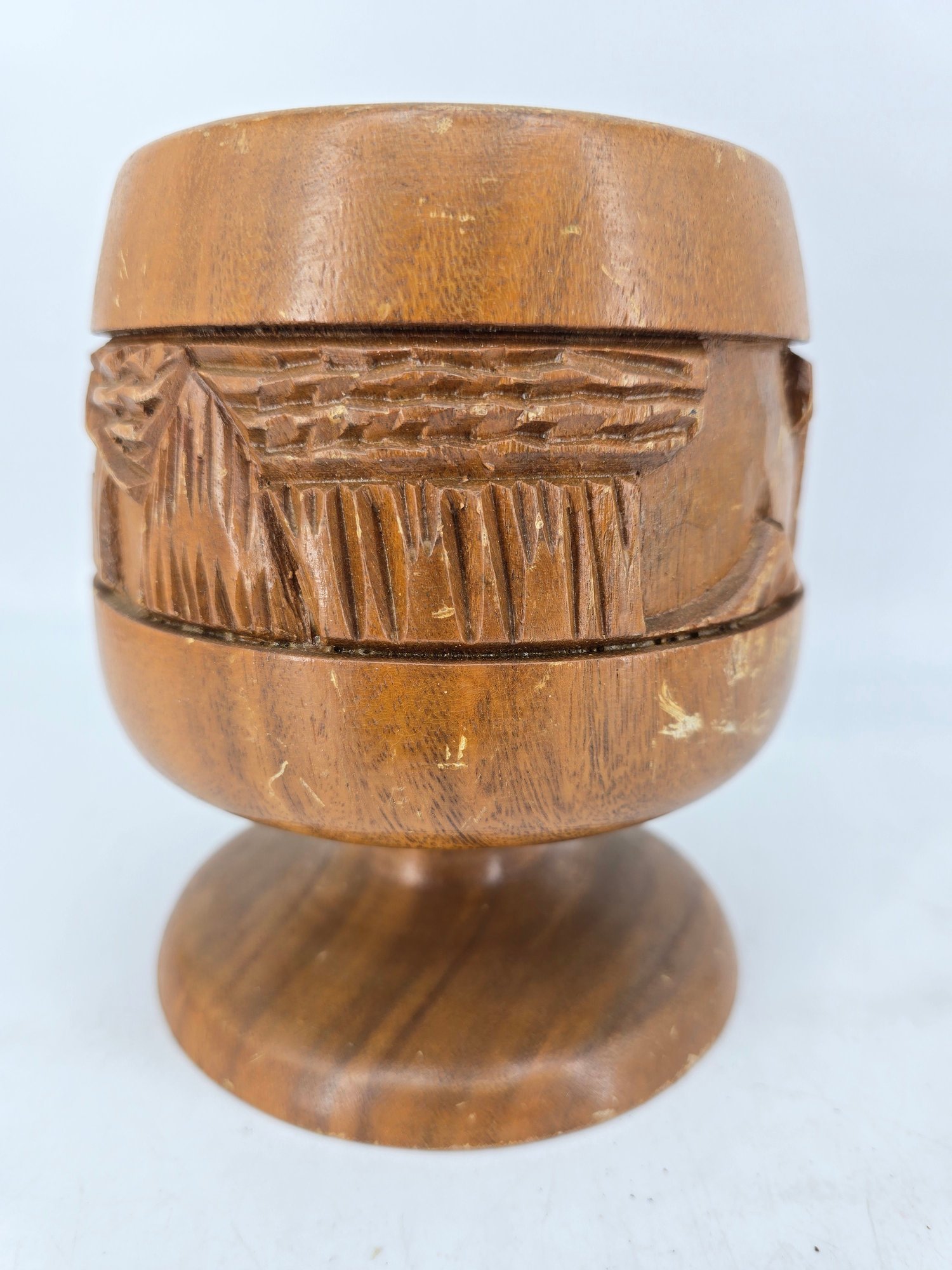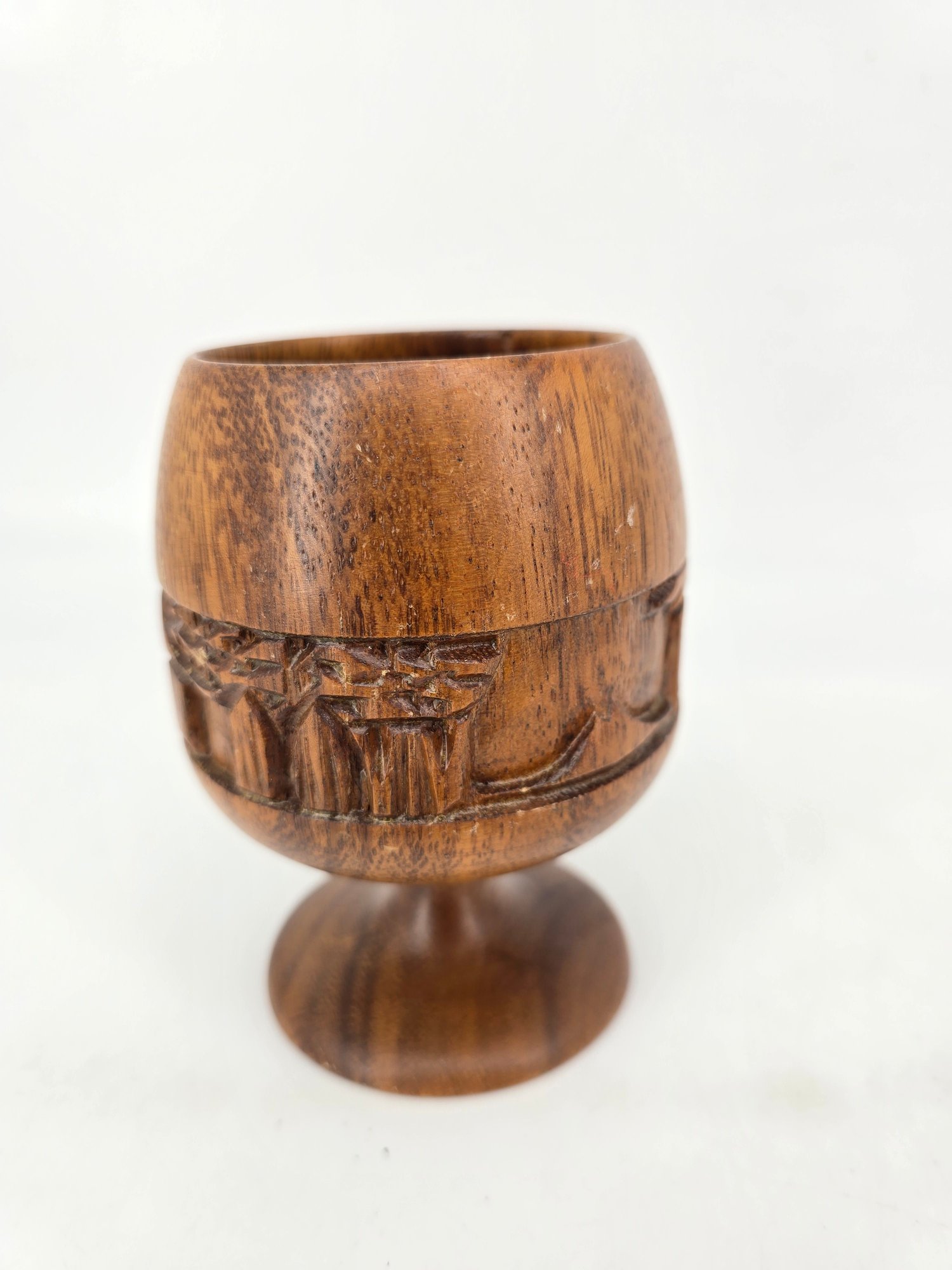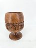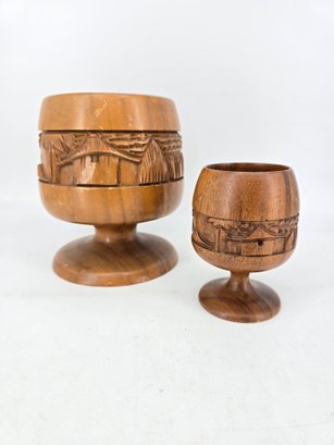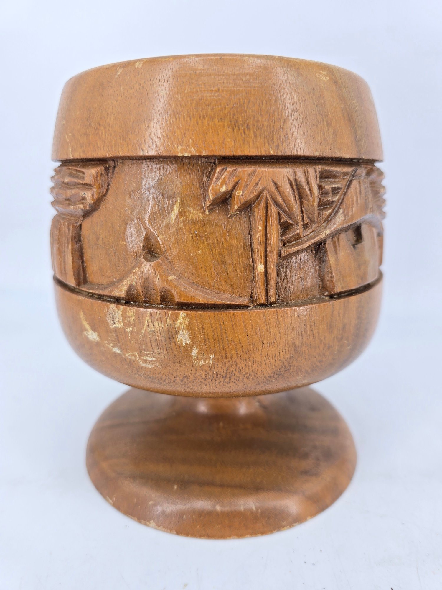 Vintage, hand-carved wooden goblets or cups, often associated with mid-century modern (MCM) or Tiki decor, possibly from the Philippines or Hawaii. They are typically made from monkey pod wood.