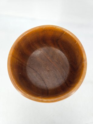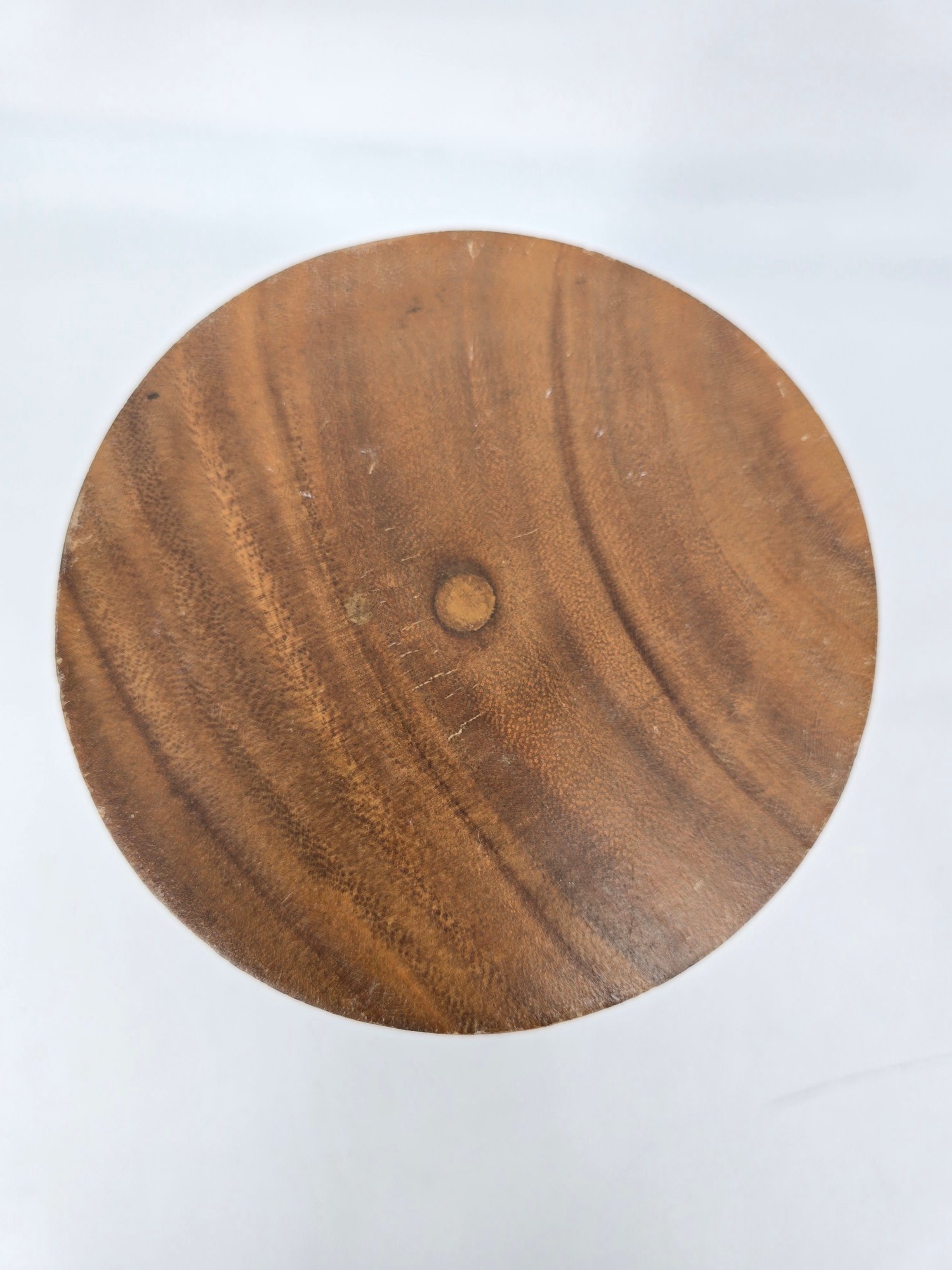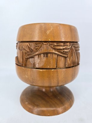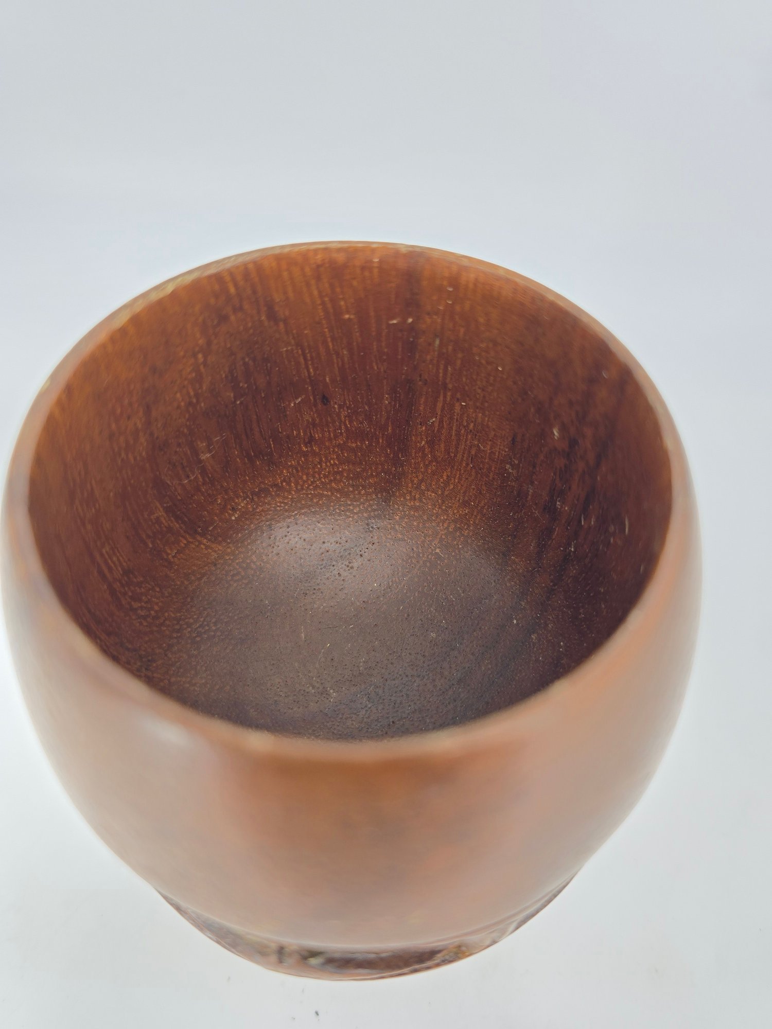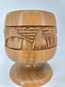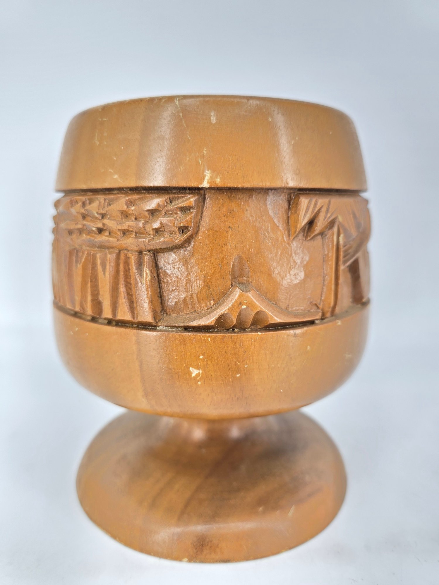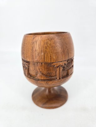 Vintage, hand-carved wooden goblets or cups, often associated with mid-century modern (MCM) or Tiki decor, possibly from the Philippines or Hawaii. They are typically made from monkey pod wood.