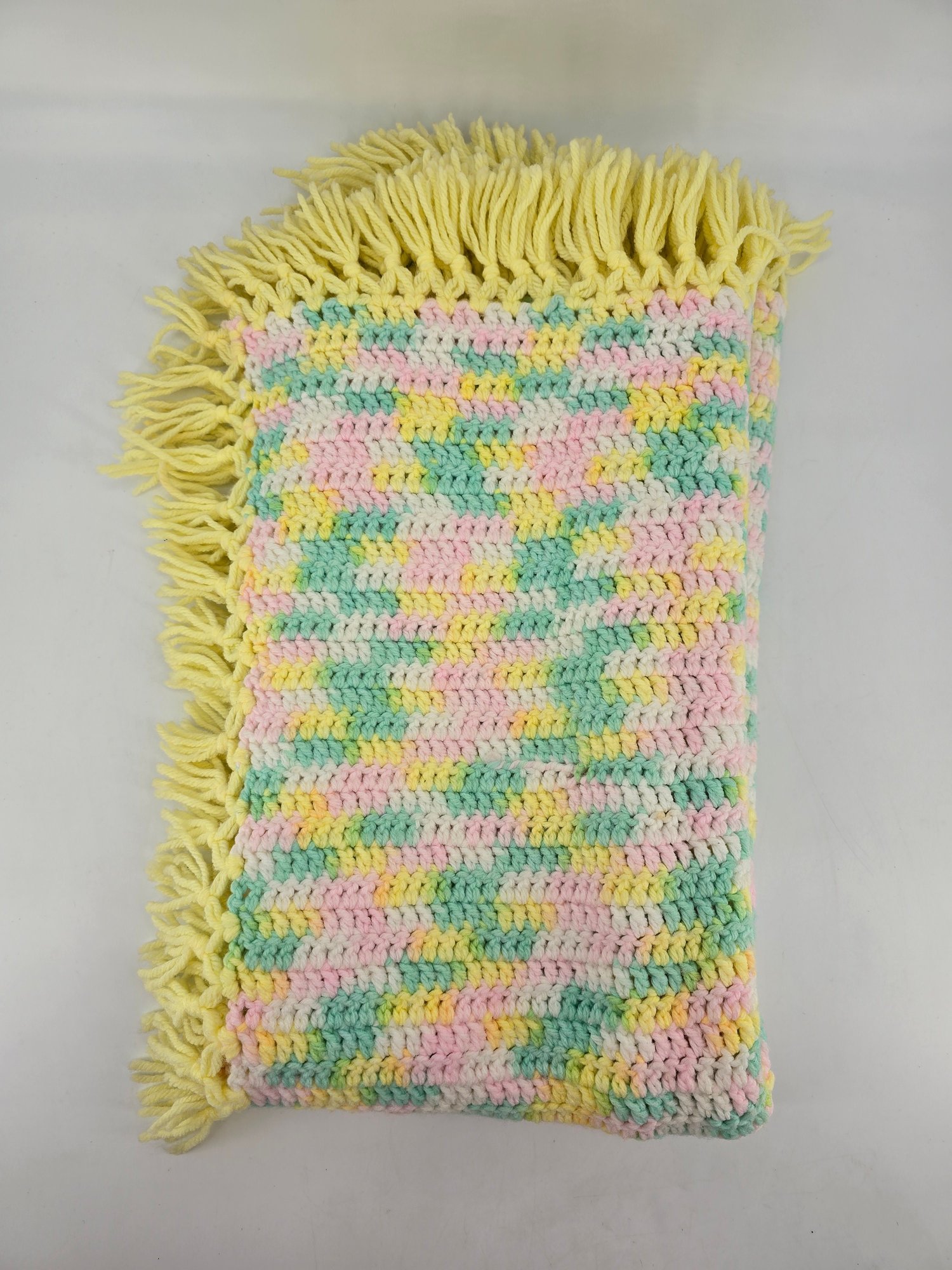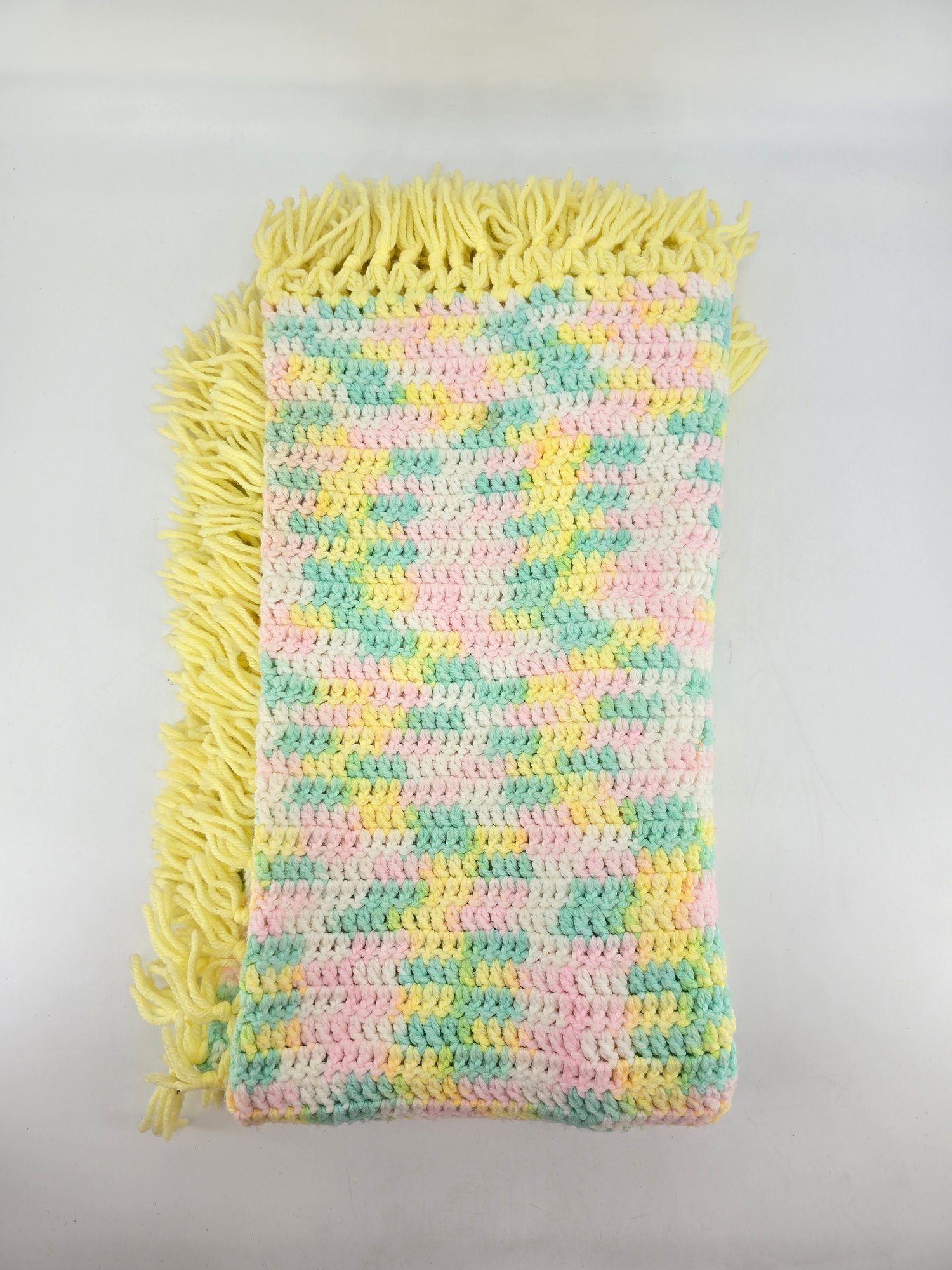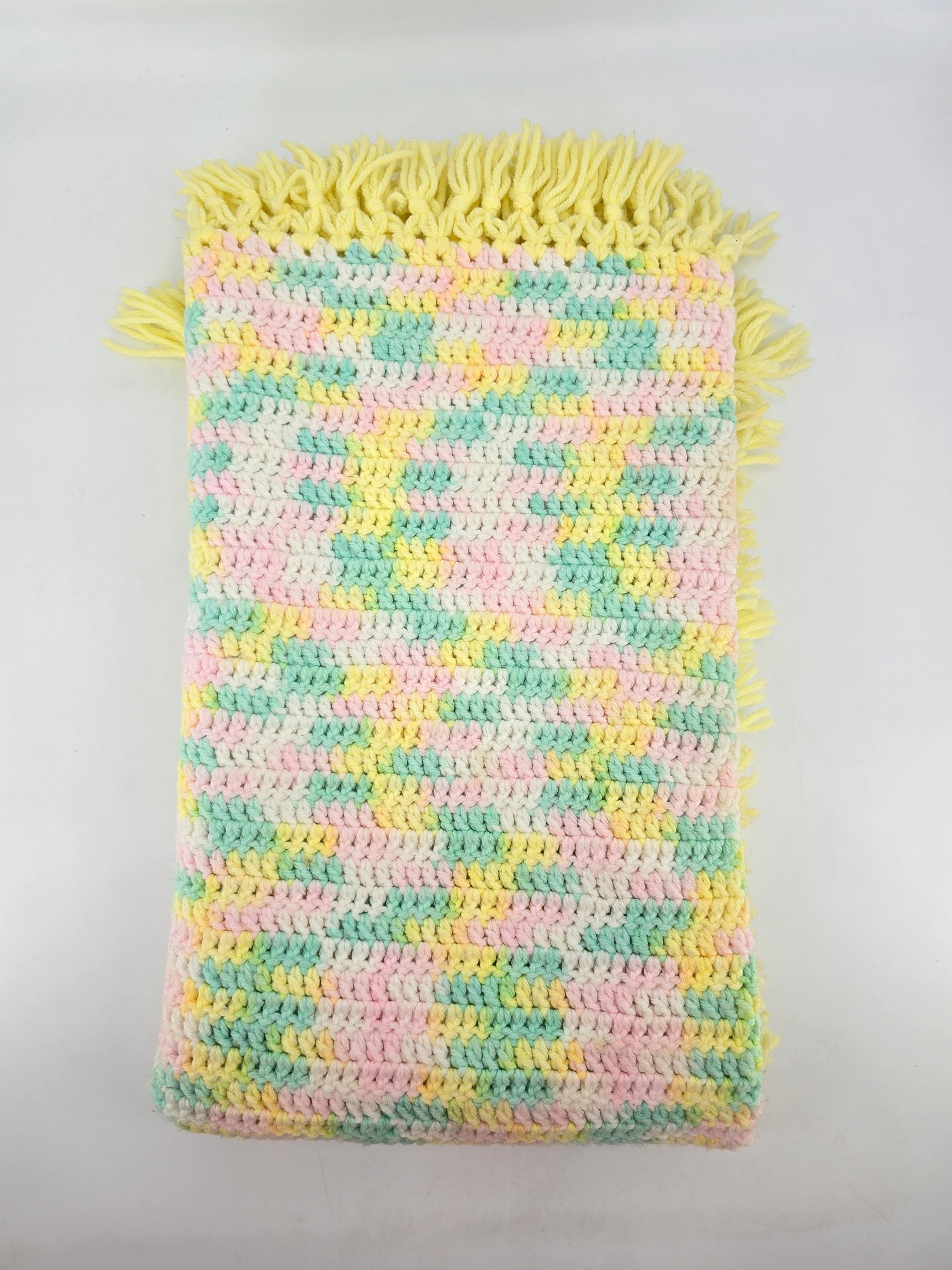 Vintage, handmade crochet afghan or baby blanket featuring a pastel variegated yarn in yellow, pink, green, and white with yellow fringe. Measures about 44" x 39", not including fringe.