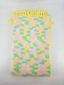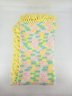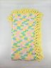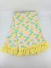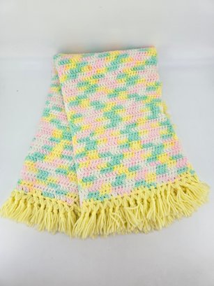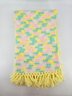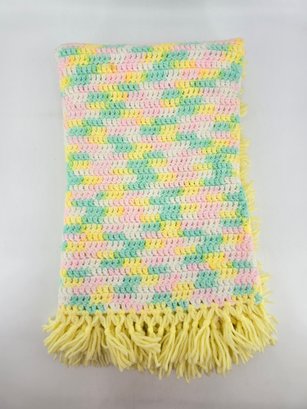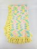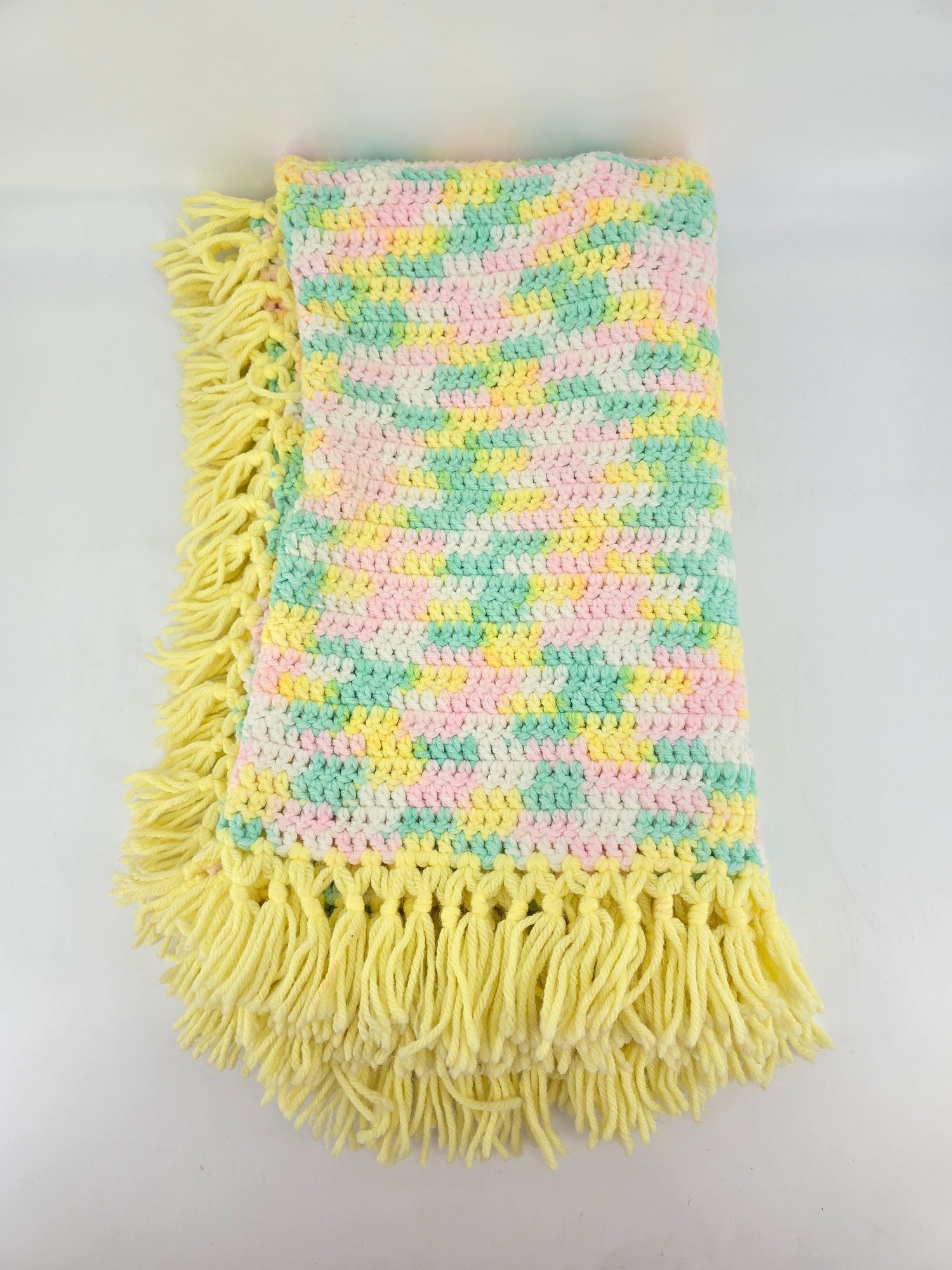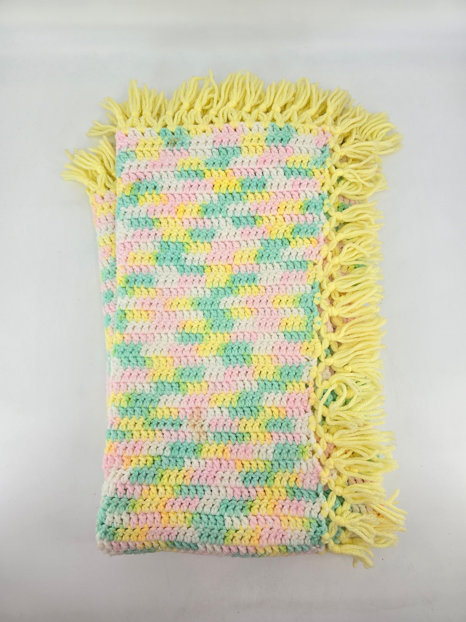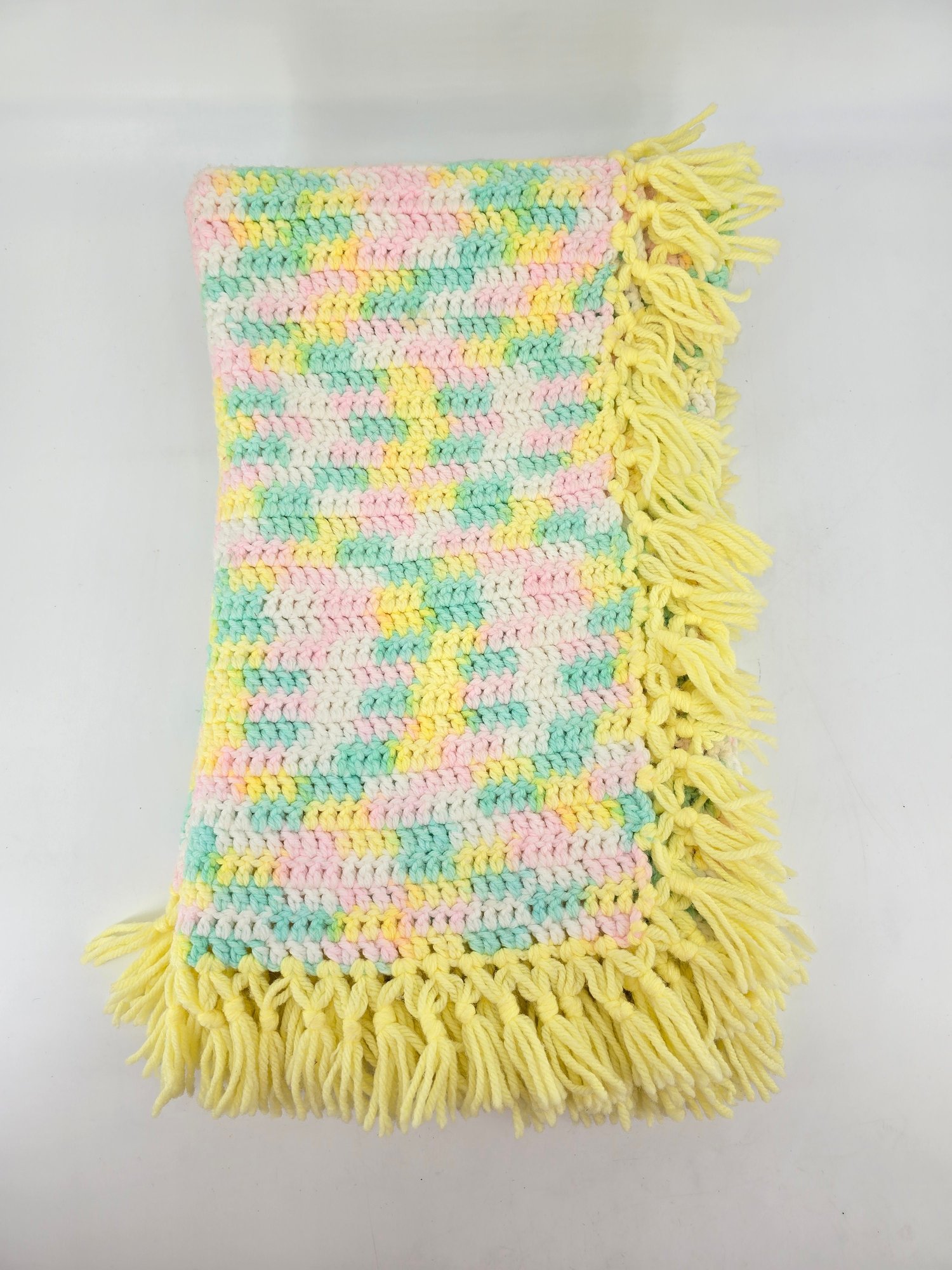 Vintage, handmade crochet afghan or baby blanket featuring a pastel variegated yarn in yellow, pink, green, and white with yellow fringe. Measures about 44" x 39", not including fringe.