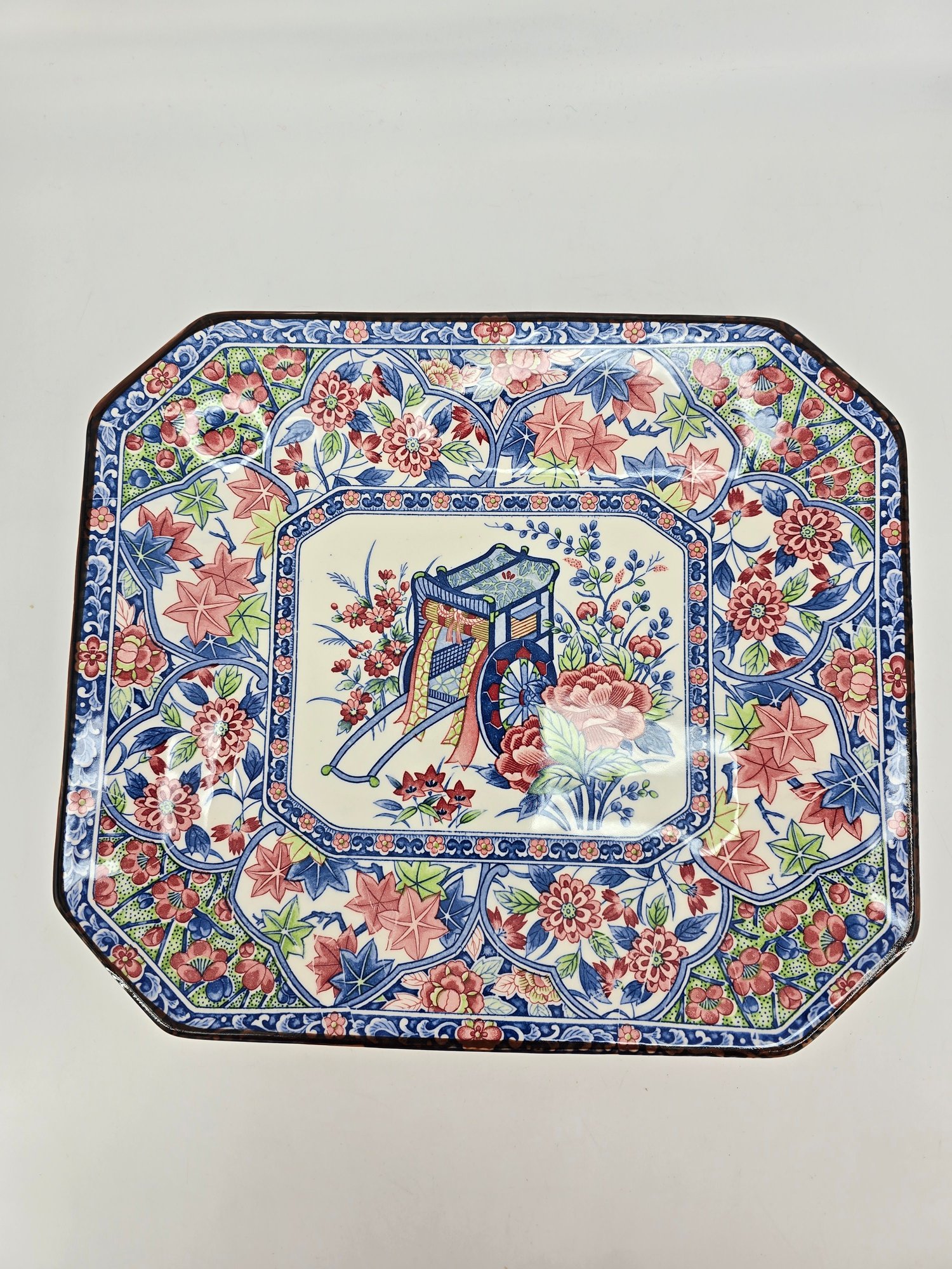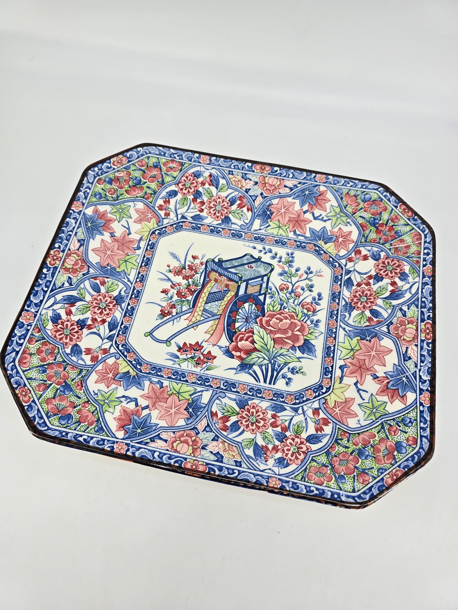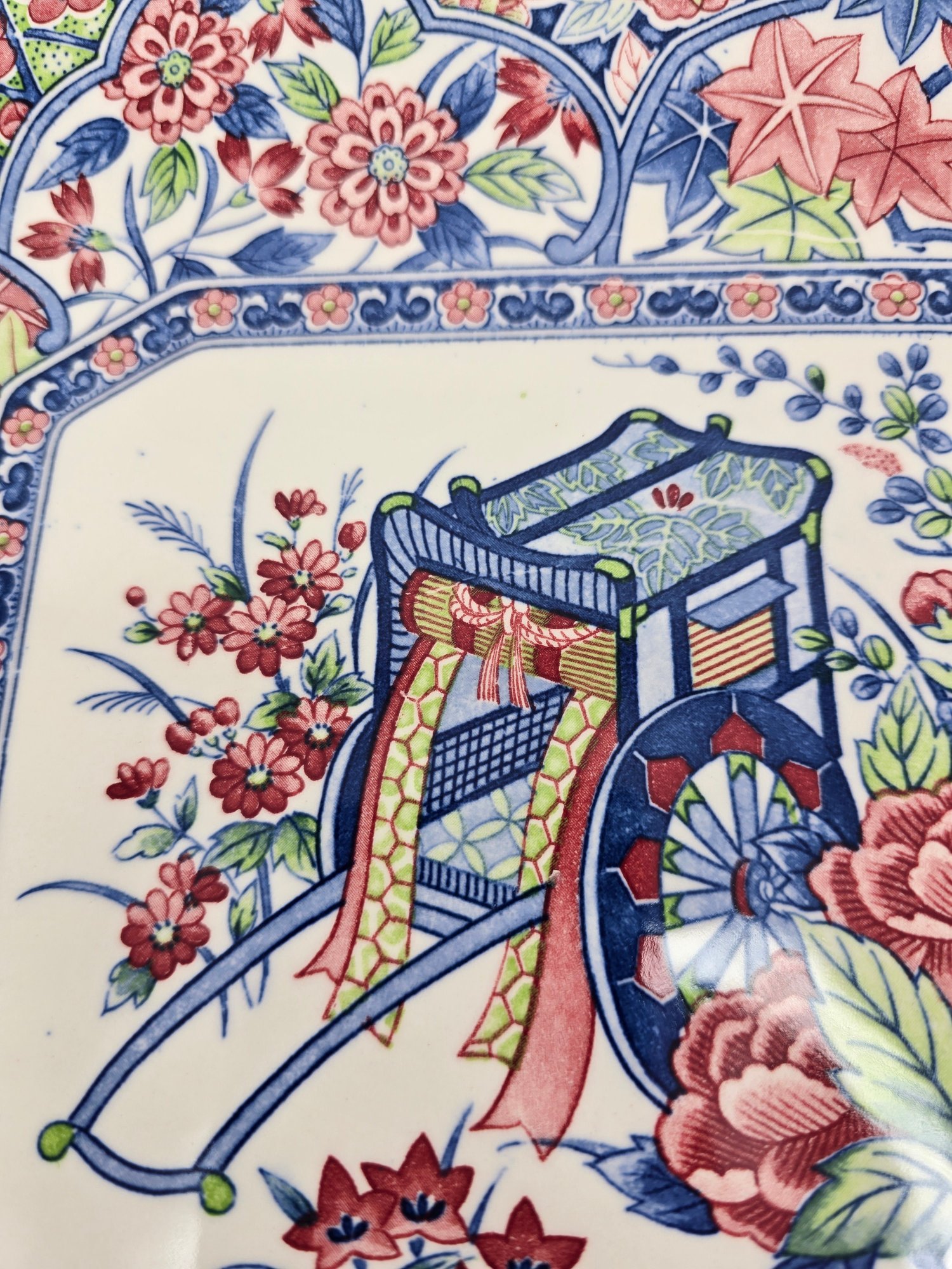 Often, these platters depict a central scene, such as a traditional Japanese rickshaw (jinrikisha) surrounded by peonies.