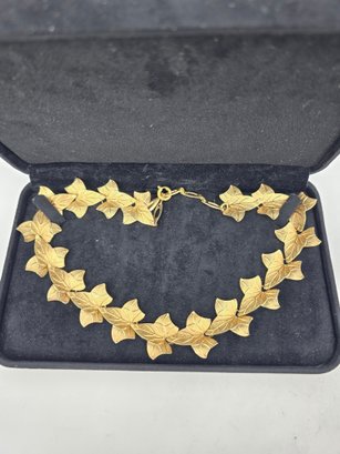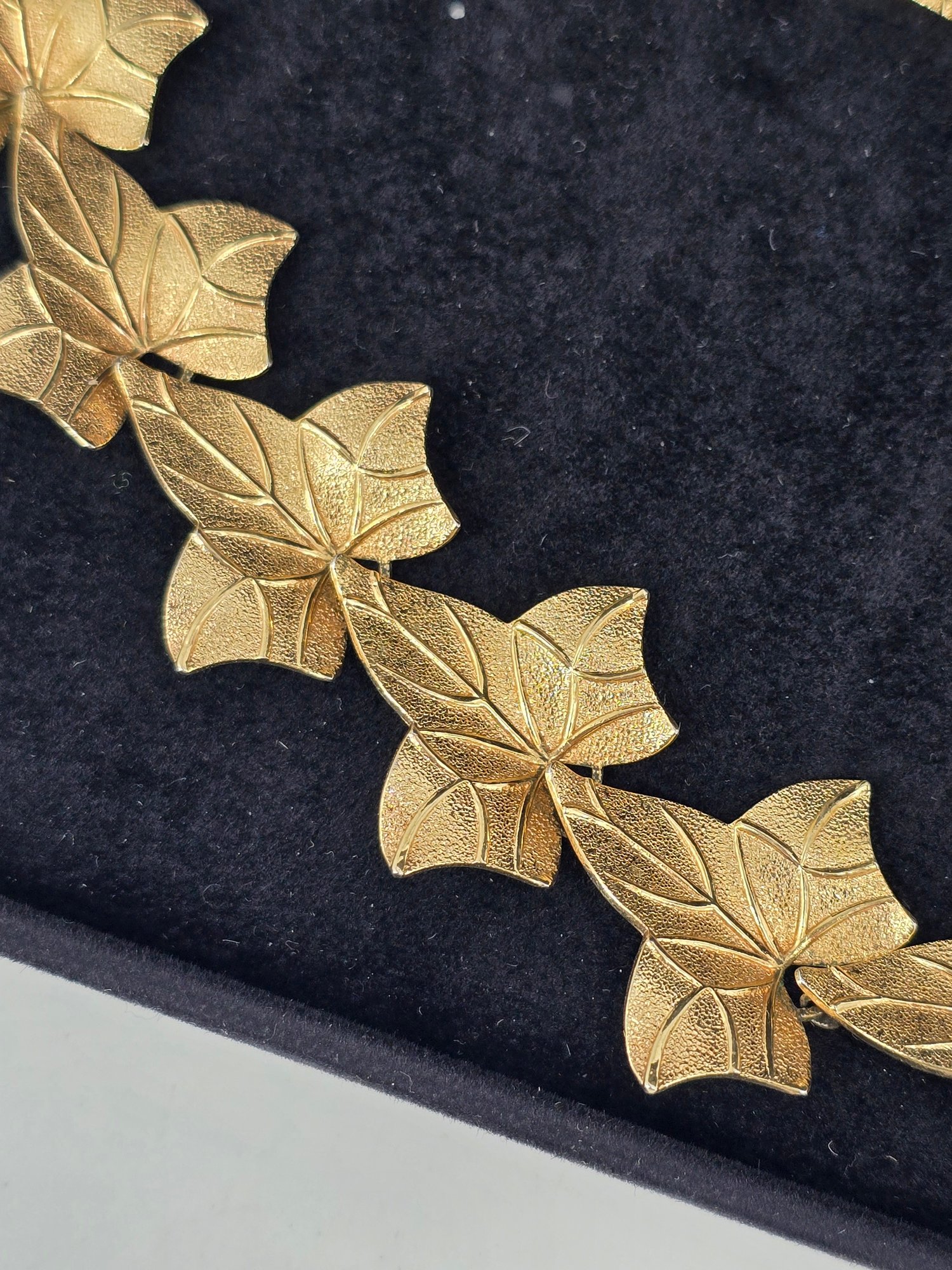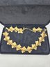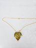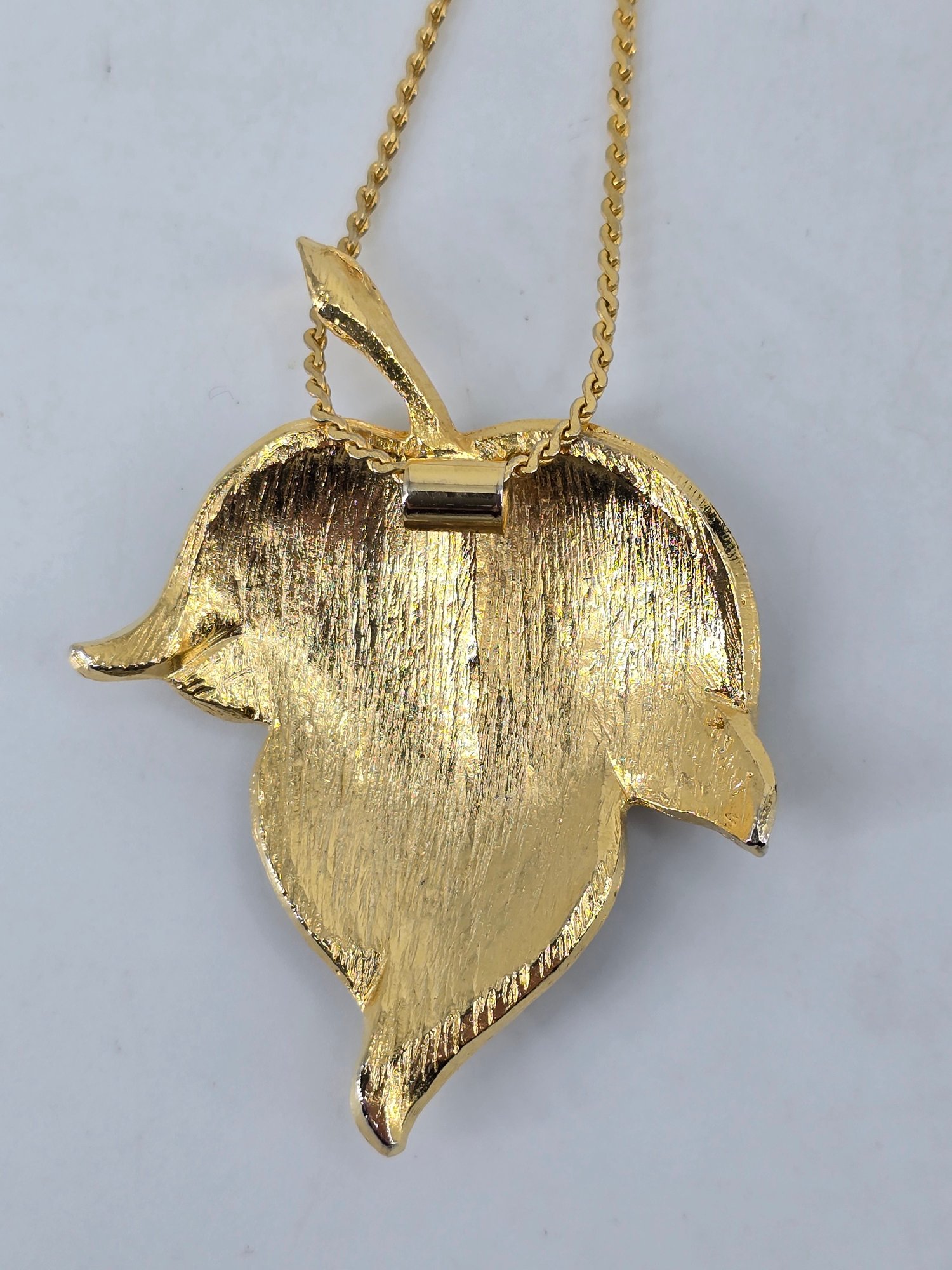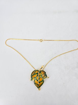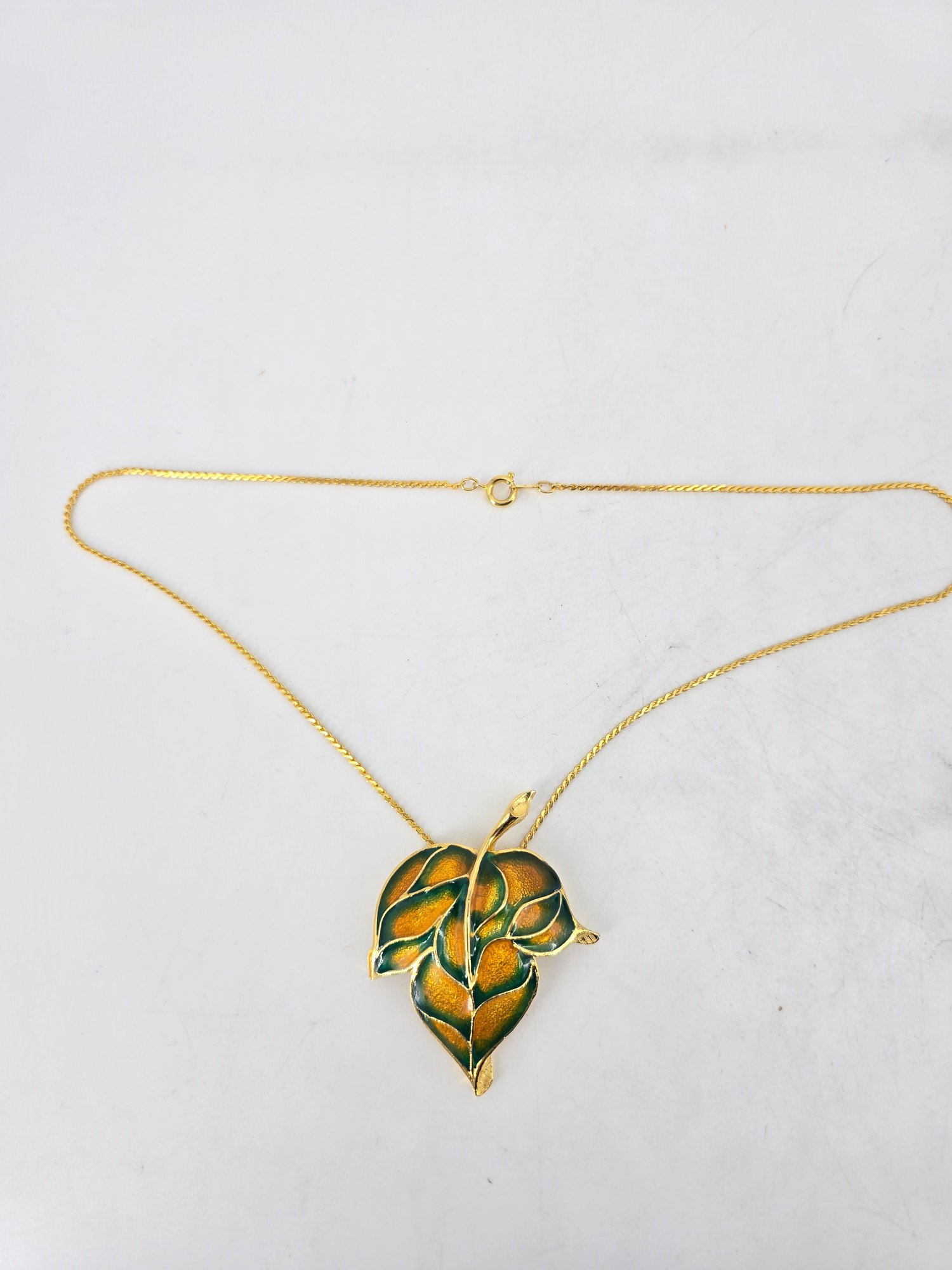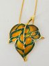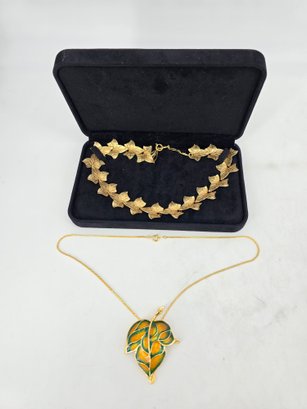 Vintage jewelry set featuring a gold-tone articulated ivy leaf necklace and a matching pendant necklace with a green and orange enameled leaf.