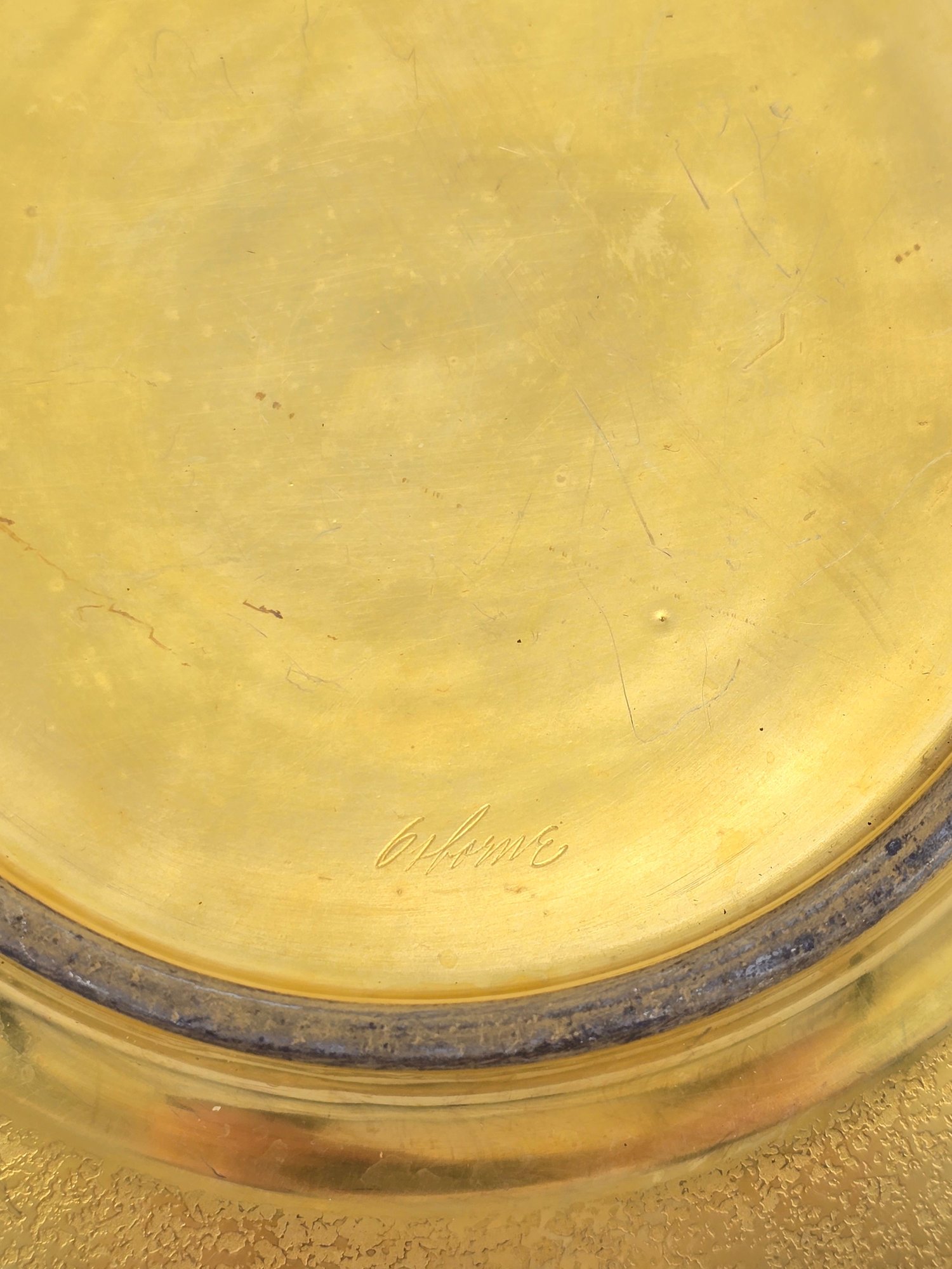 It has an aged, unpolished finish with a rich patina, giving it an authentic, handmade look. About 9" x 3.25". Signed - "6 Home" on Bottom, see photos.