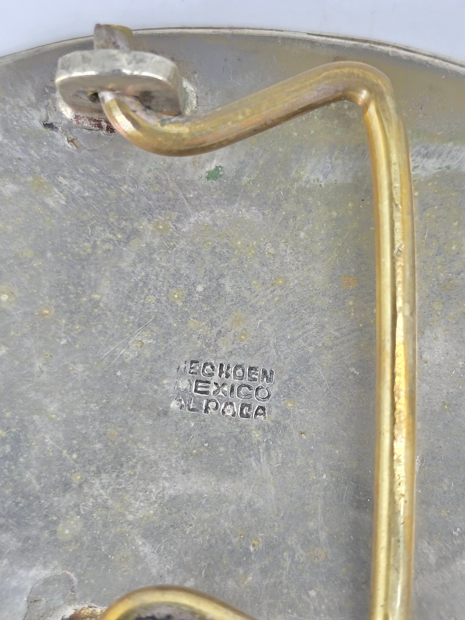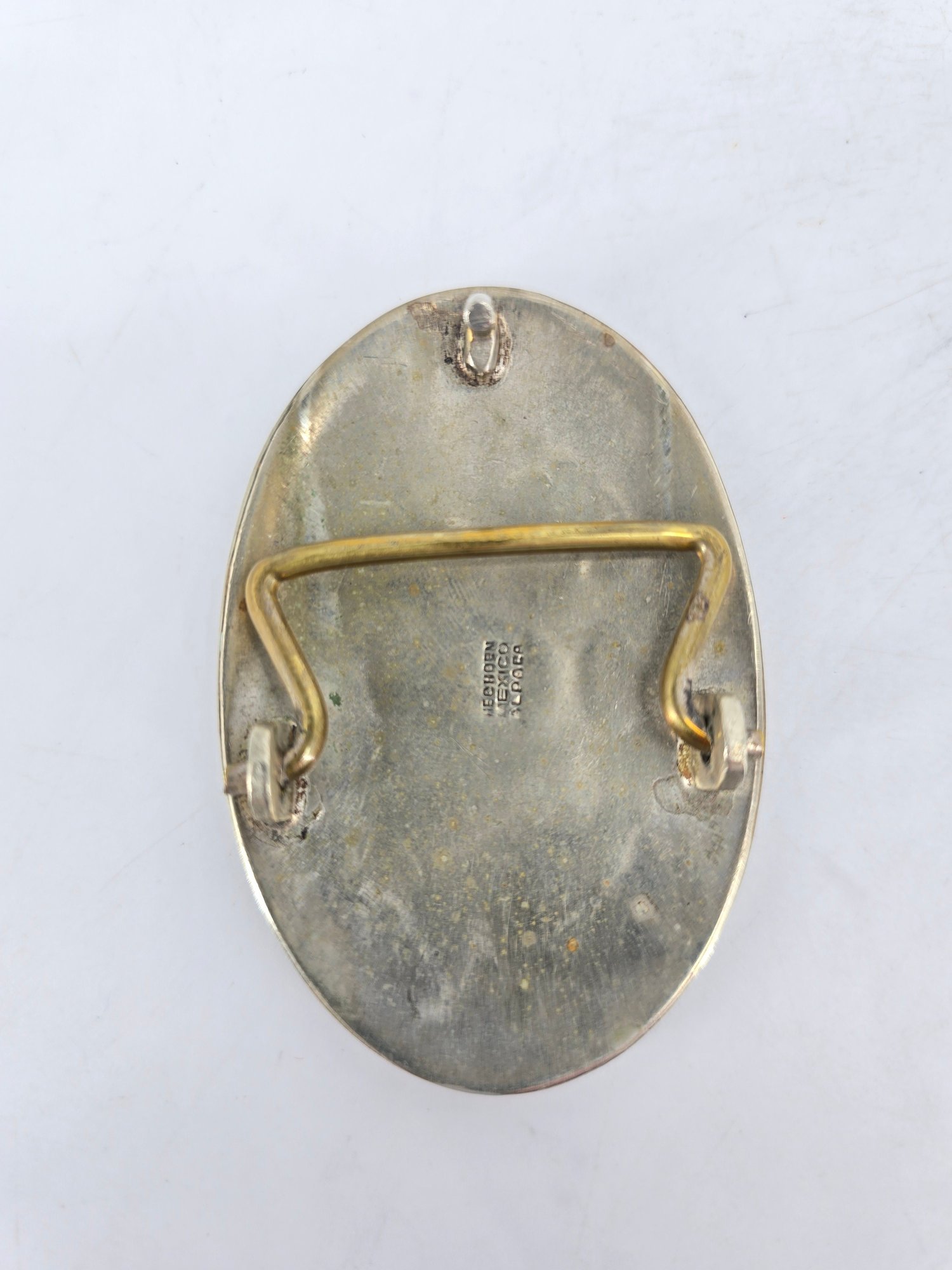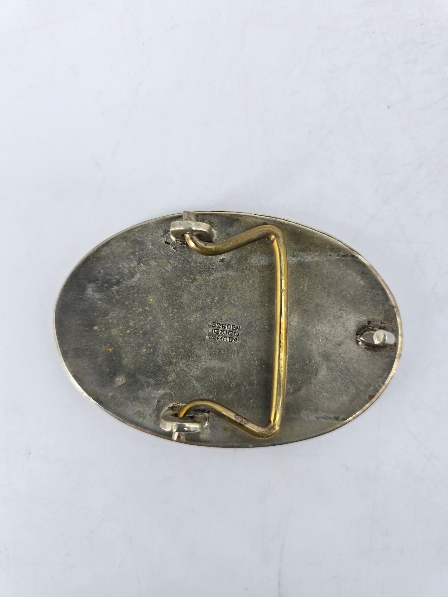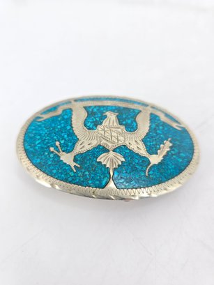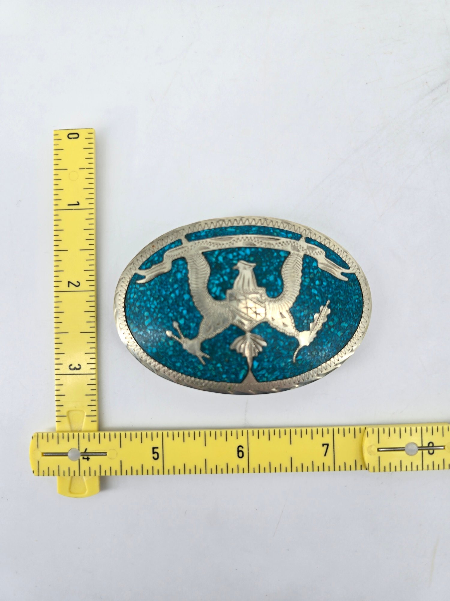 Vintage Southwest belt buckle featuring a silver-colored eagle design inlaid with crushed turquoise.