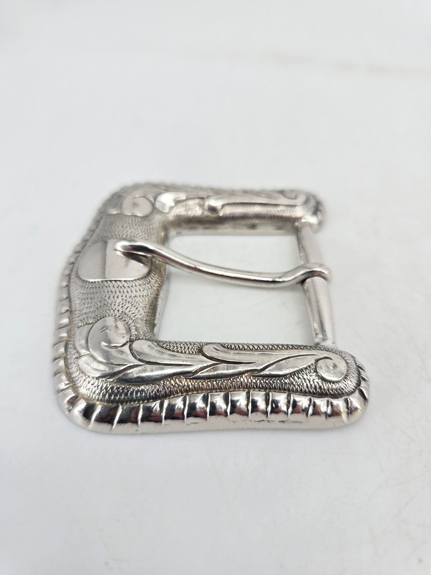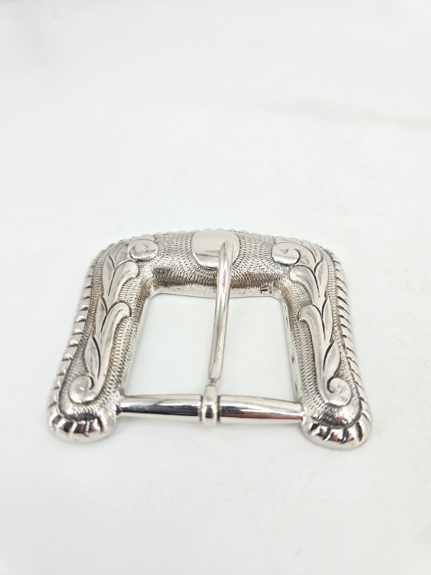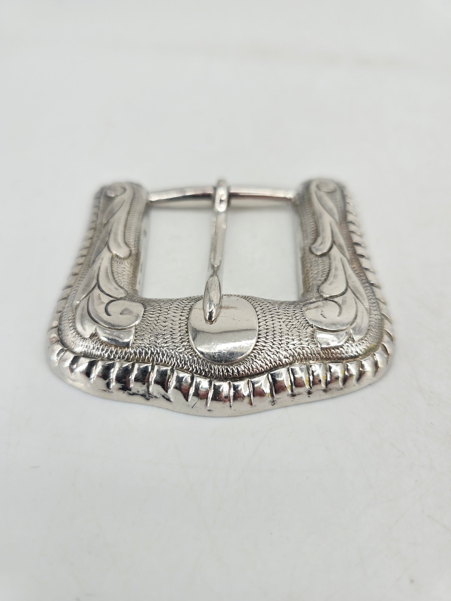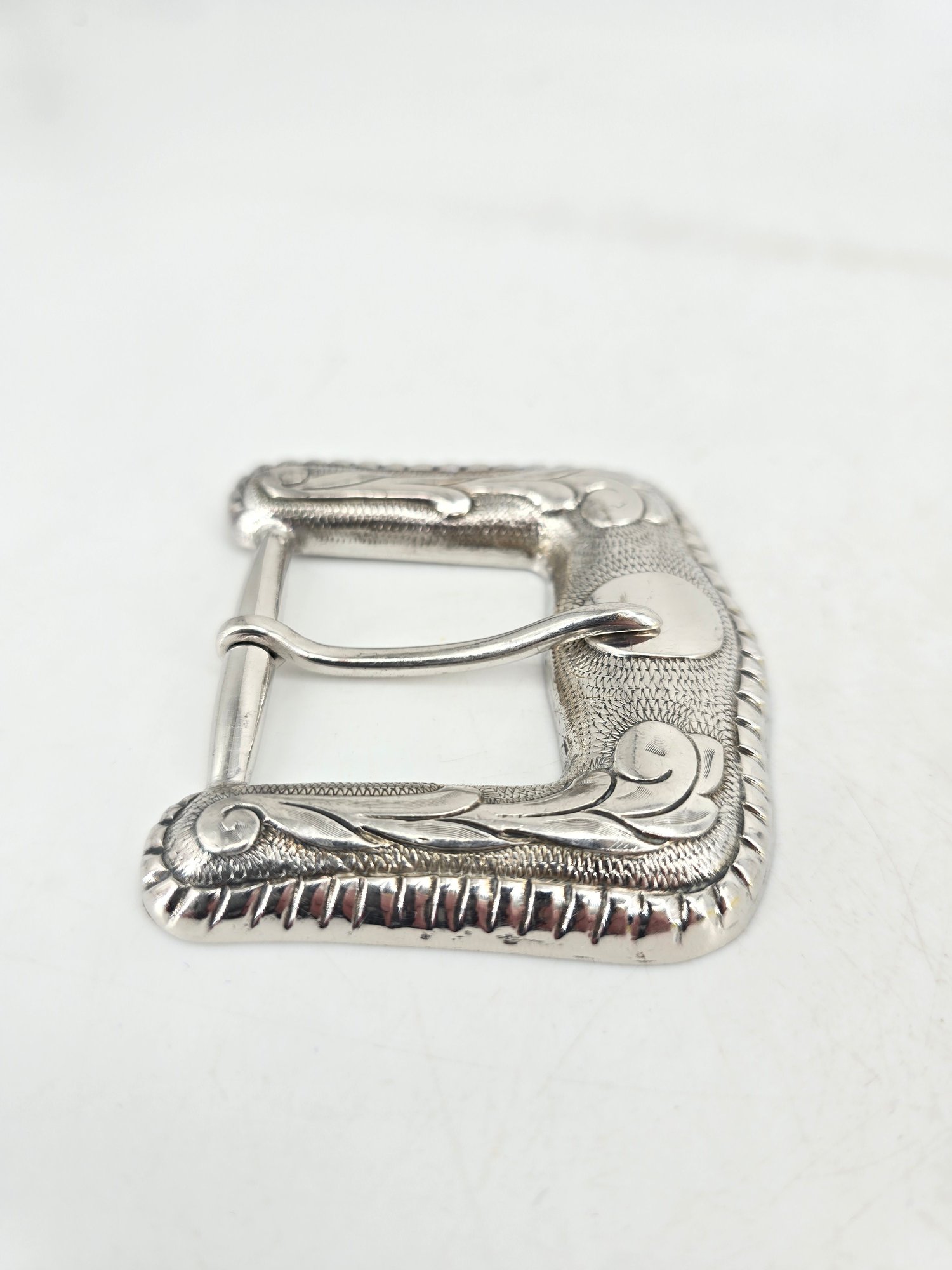 Vintage sterling .925 silver belt buckle featuring intricate floral and rope-edge engraving, often found in Western or Southwestern styles. Weighs 72.49g and has been tested.