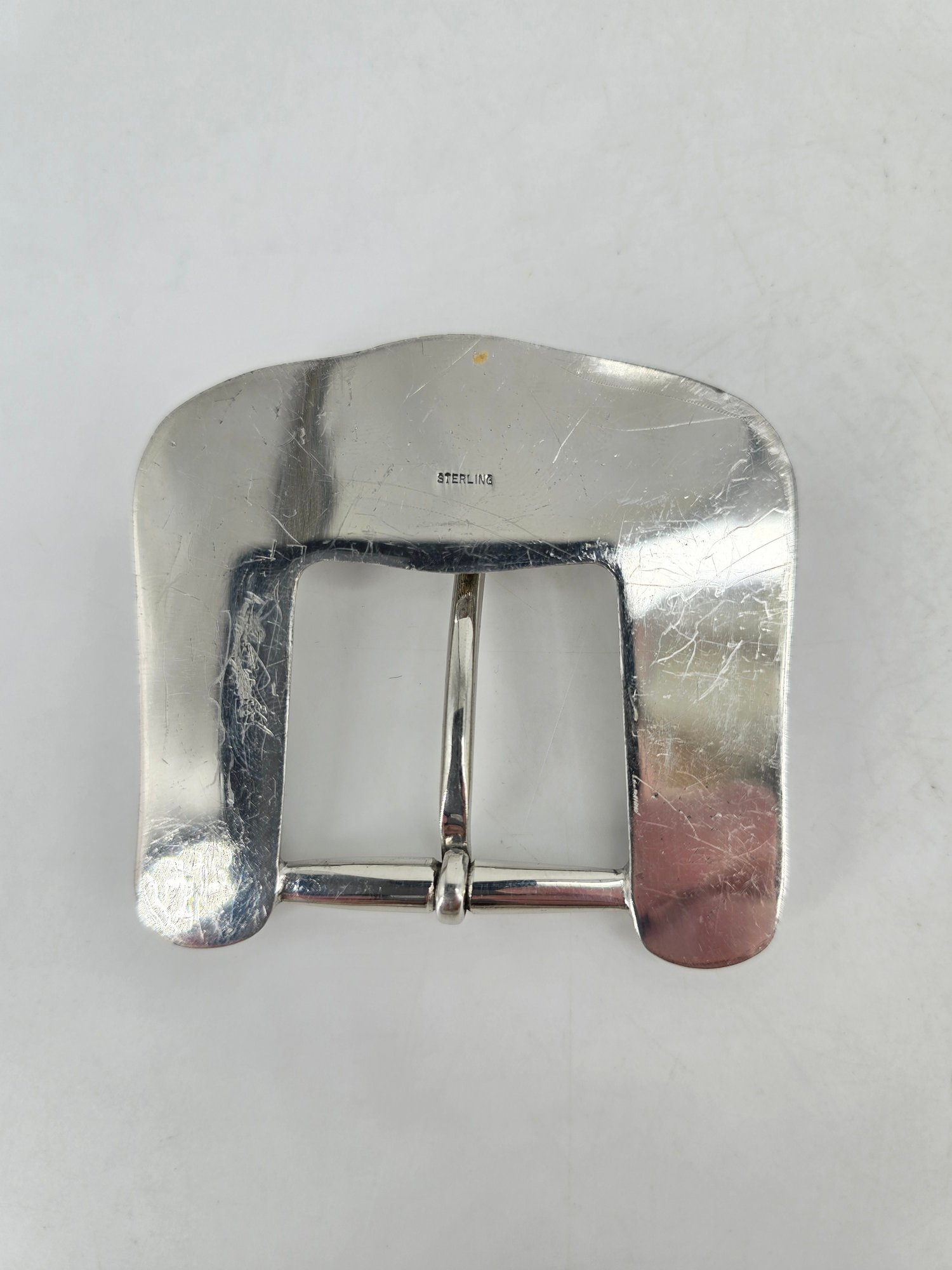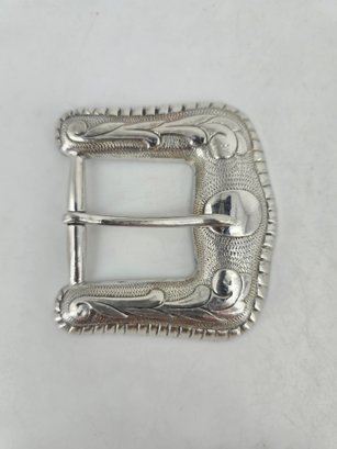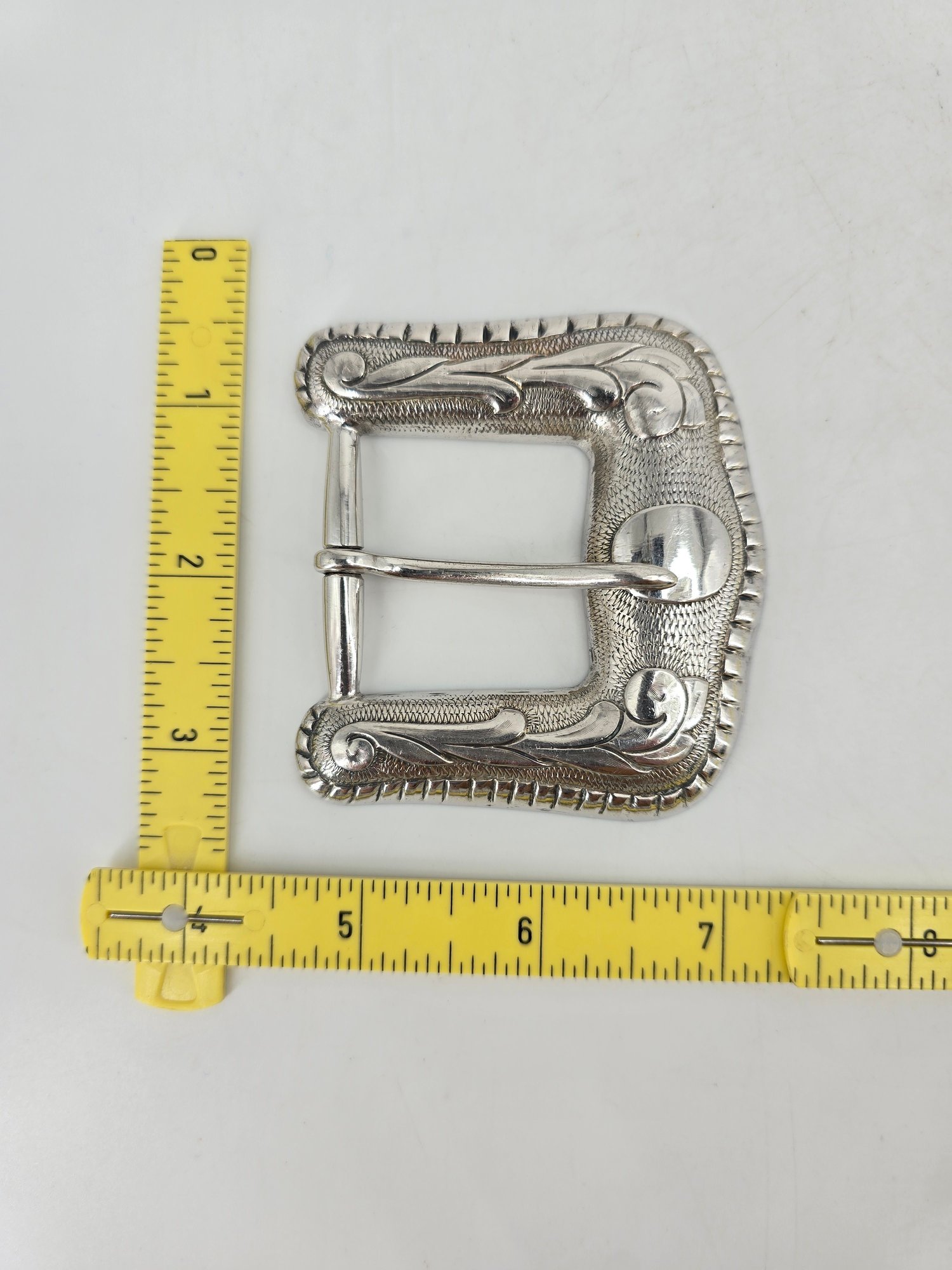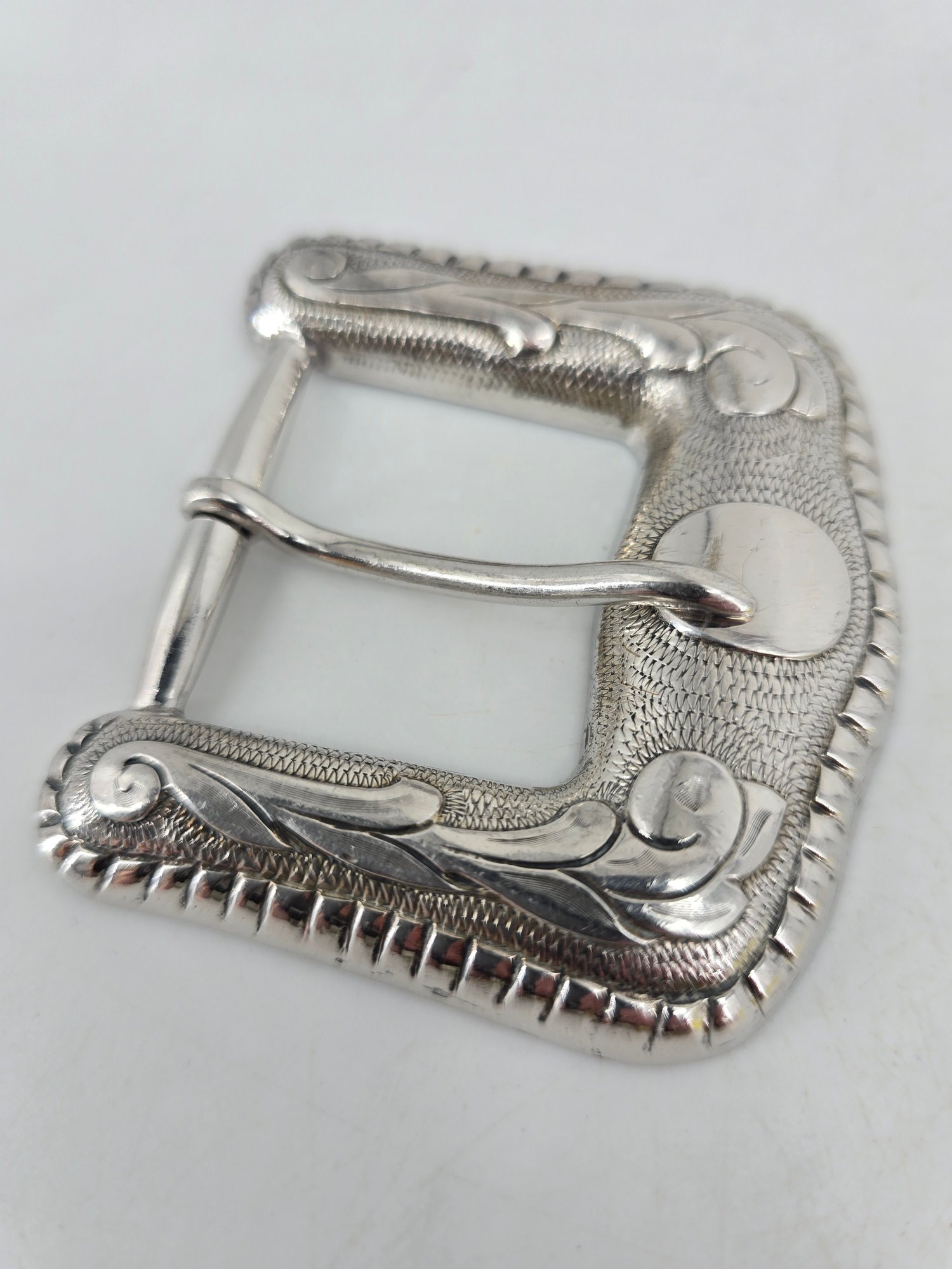 Vintage sterling .925 silver belt buckle featuring intricate floral and rope-edge engraving, often found in Western or Southwestern styles. Weighs 72.49g and has been tested.