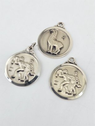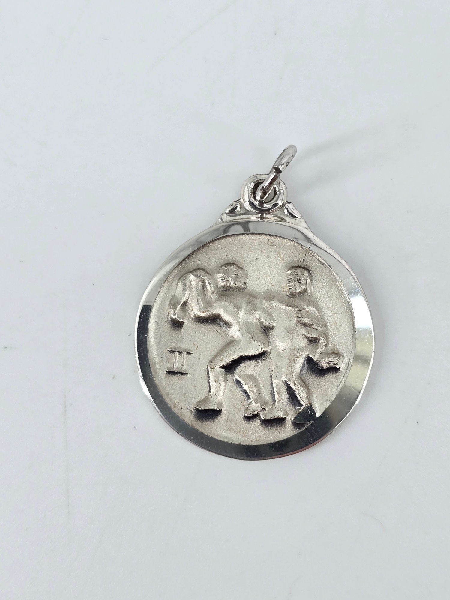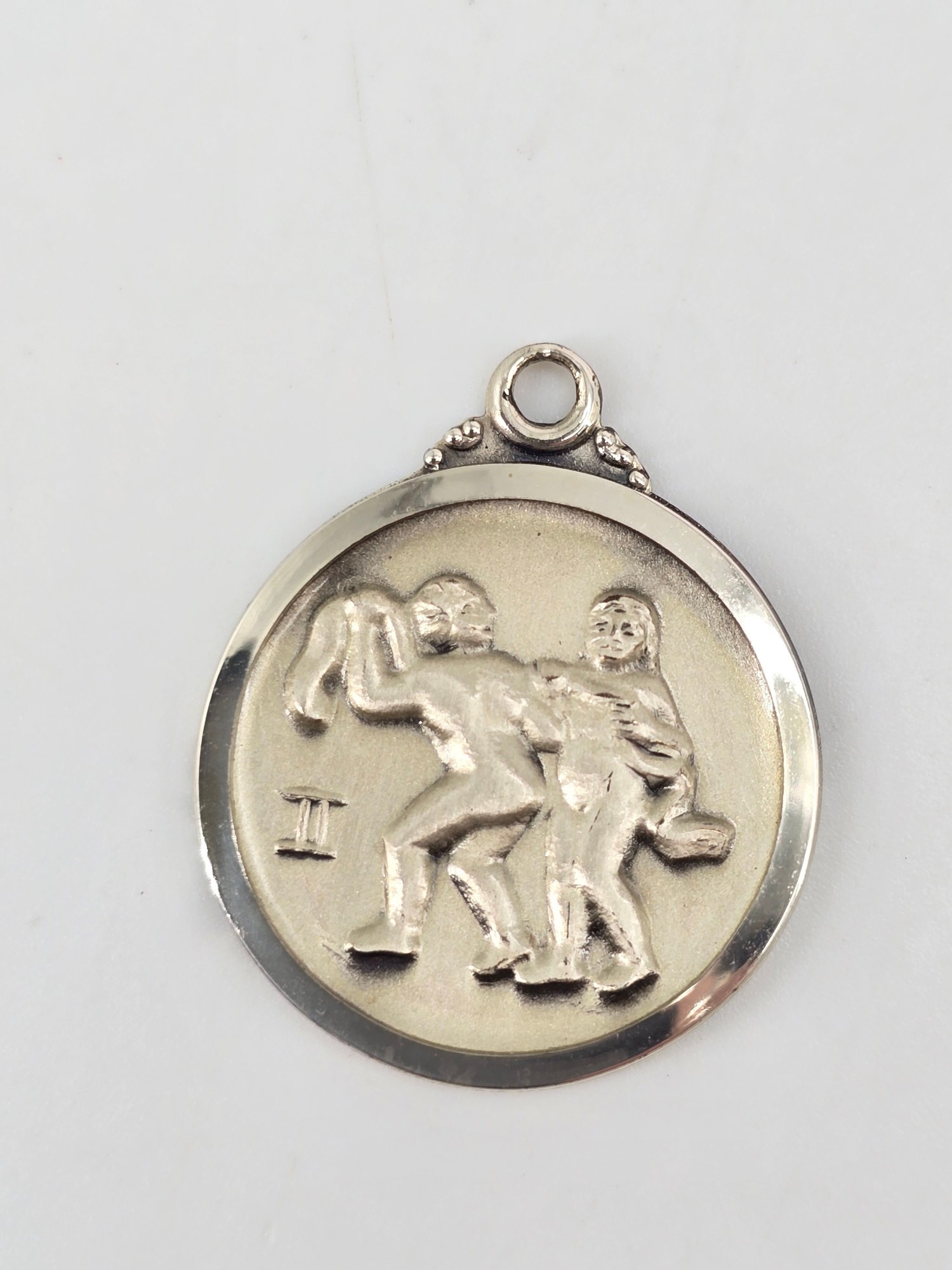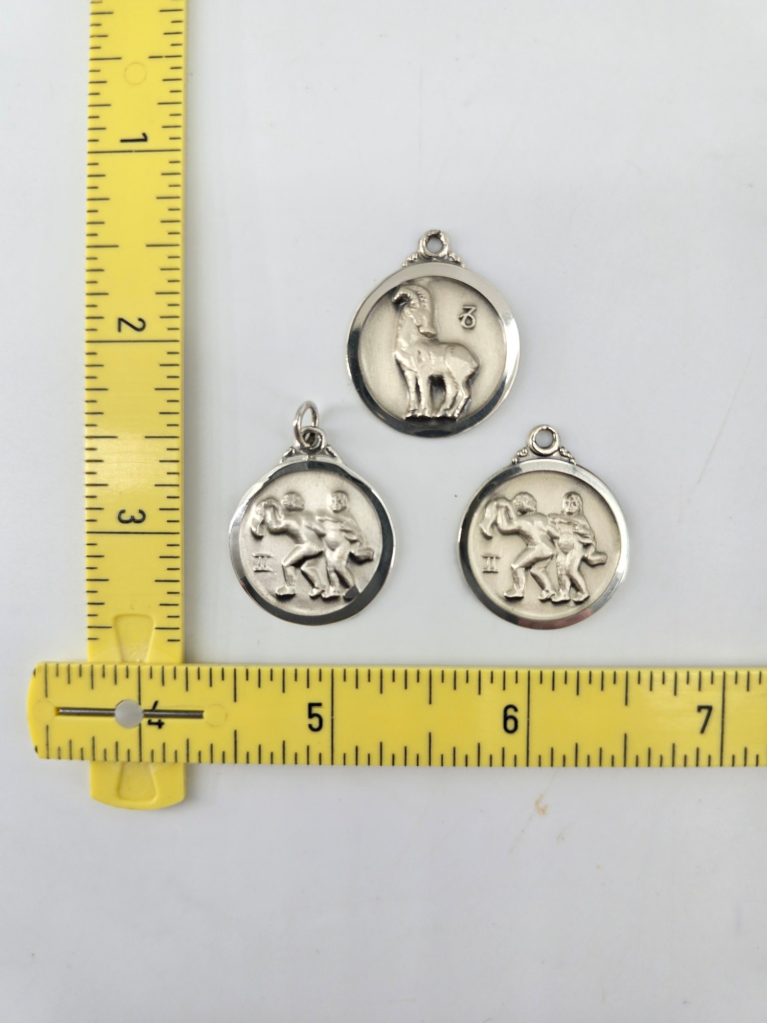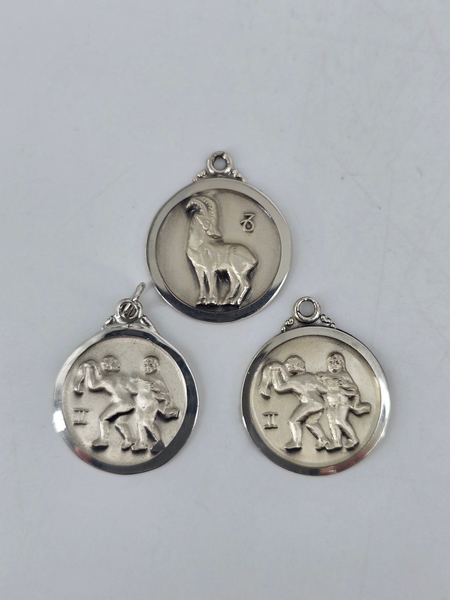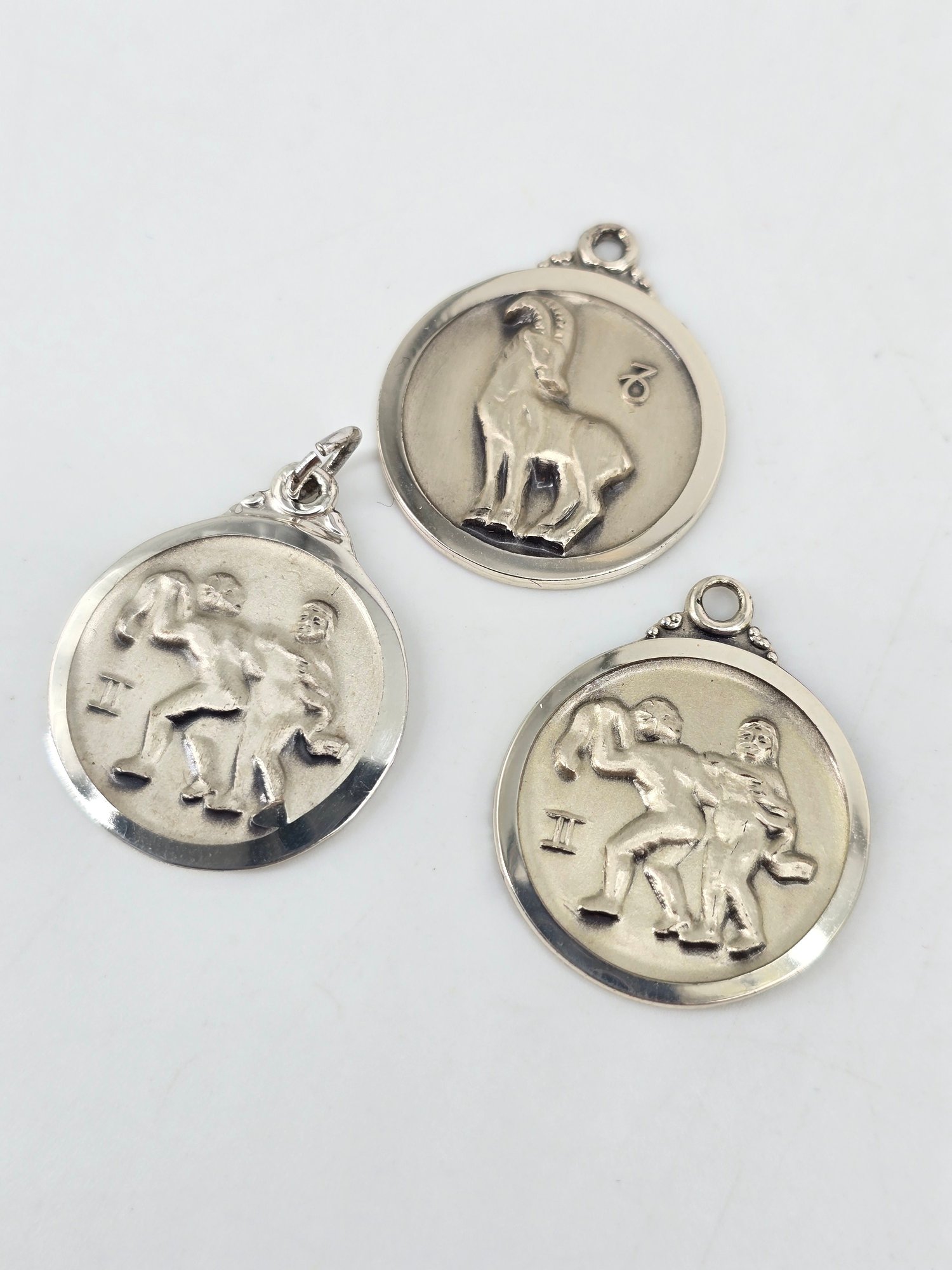 Vintage sterling .925 silver zodiac medal charms, featuring the signs for Capricorn (the goat) and Gemini (the twins).