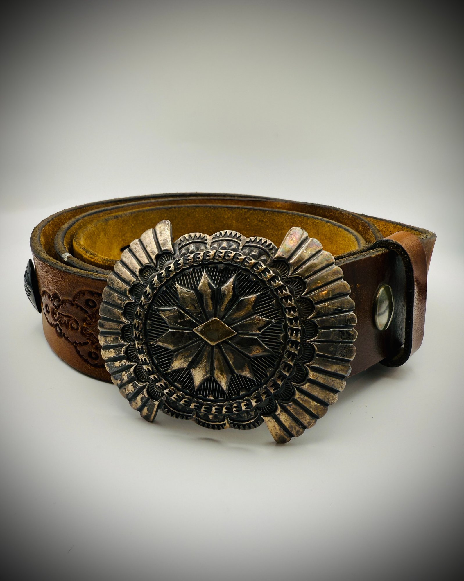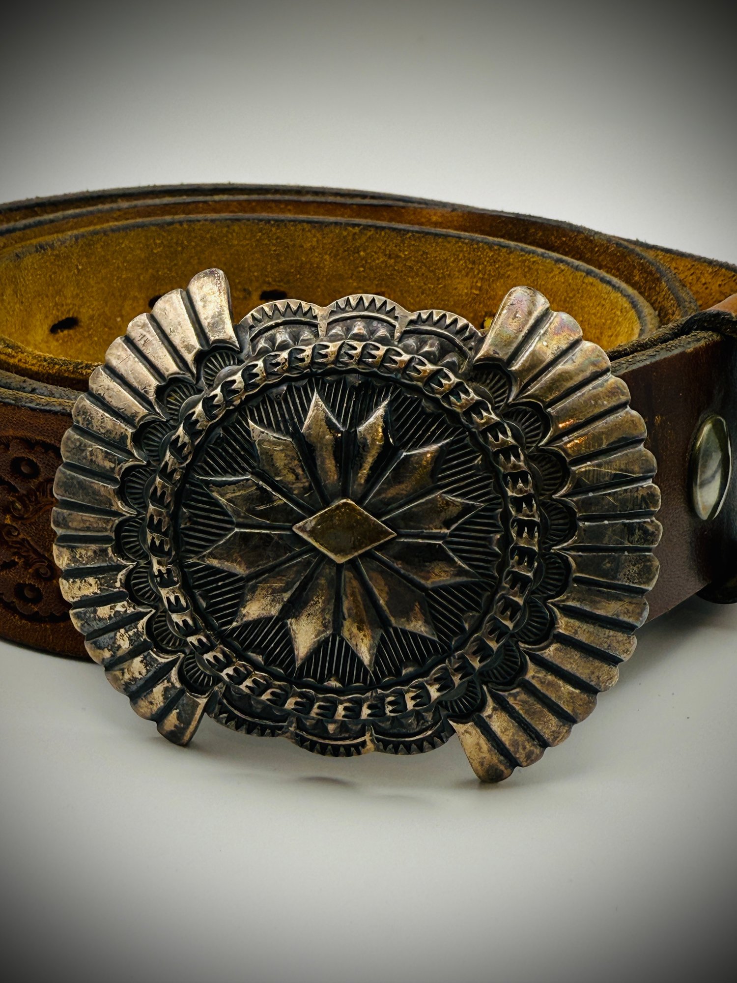Vintage Western concho belt featuring a hand-made Navajo sterling buckle by Oscar Alexius (Diné) paired with a Rocky Mountain Leather Shop (Lakewood, CO) tooled leather strap. Classic old-style Navajo work: deep stampwork, repoussée doming, rope-edged border, and a radiating sunburst/star center that coordinates with twelve matching sterling conchos mounted along the belt. Beautiful, honest patina throughout.