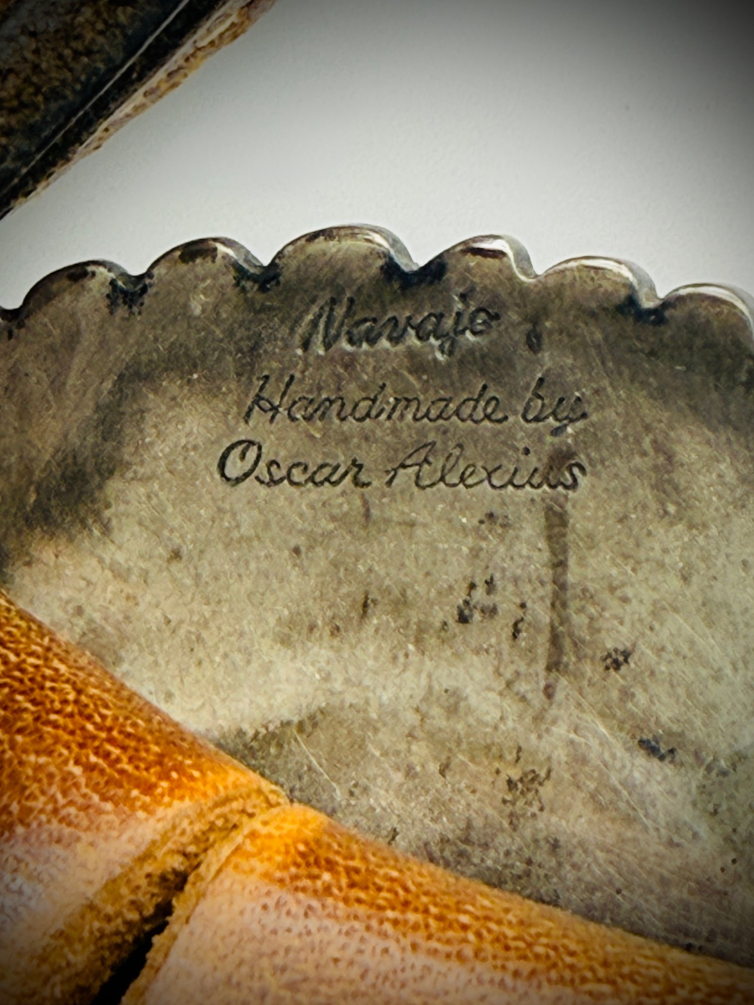 Oscar Alexius (b. 1949, Navajo)—known for heavy-gauge, deep-stamped “old-style” silverwork; widely collected. Buckle shows hallmark traits collectors look for.