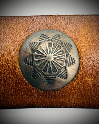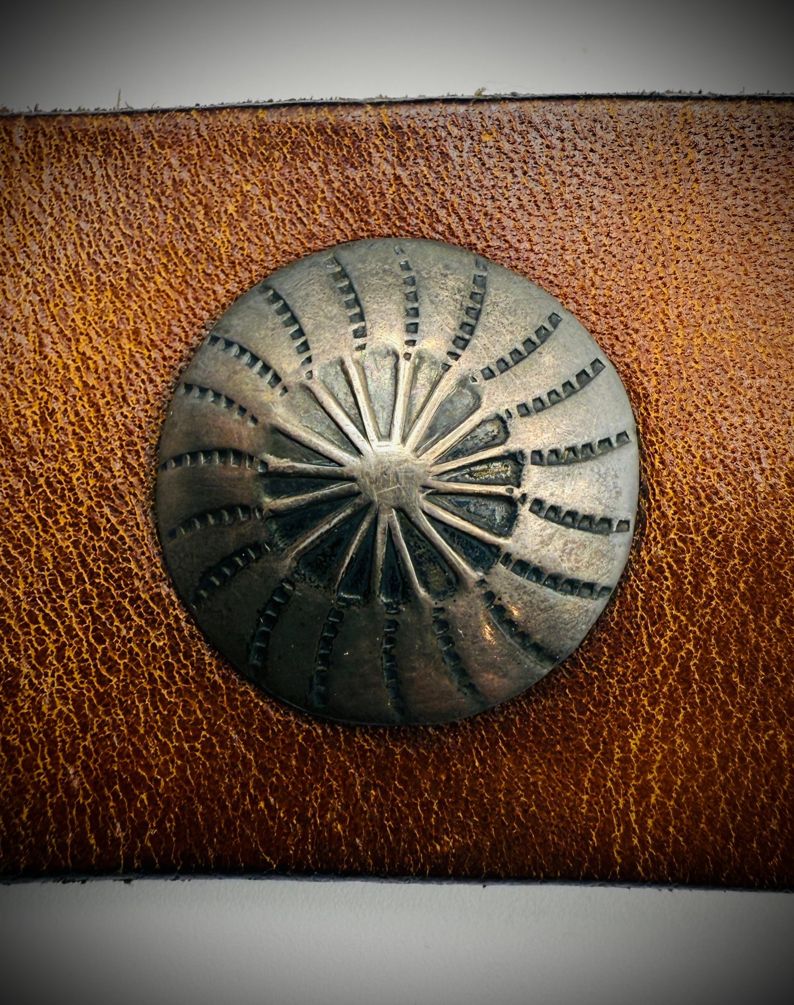 Conchos: 12 domed, hand-stamped sterling (leather-tied in; signatures not inspected)