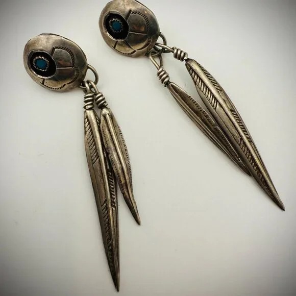 The feathers are stamped with traditional details and wrapped with wire in classic Native American style. The turquoise stones are a deep blue, most consistent with Kingman turquoise, set in sawtooth bezels at the center of hand-formed domes.