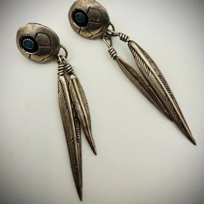 These earrings are crafted in sterling silver and feature natural turquoise cabochons. While consistent with traditional Navajo design and construction, they are unmarked and have not been professionally authenticated.