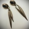 Beautiful vintage-style sterling silver earrings featuring hand-stamped domed conchos with genuine turquoise cabochons and double feather dangles.